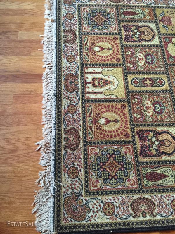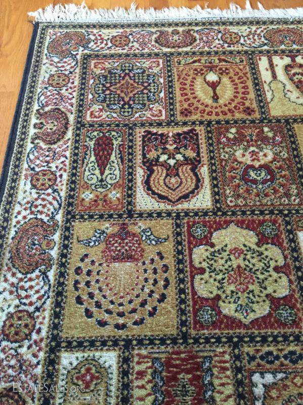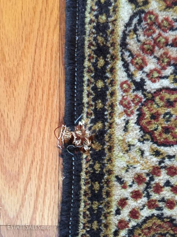Woven rug with fringe ends. Please note* rugs is mainly yellow, red and brown hues. Photos make it seem to show blue when in fact it does not. Sold as is.