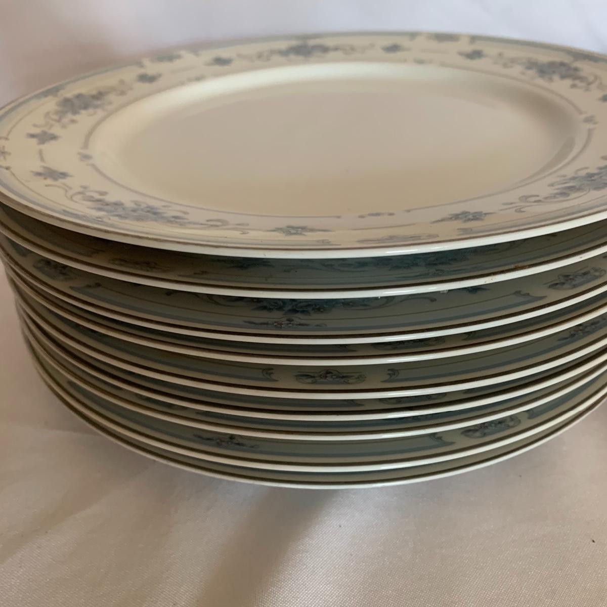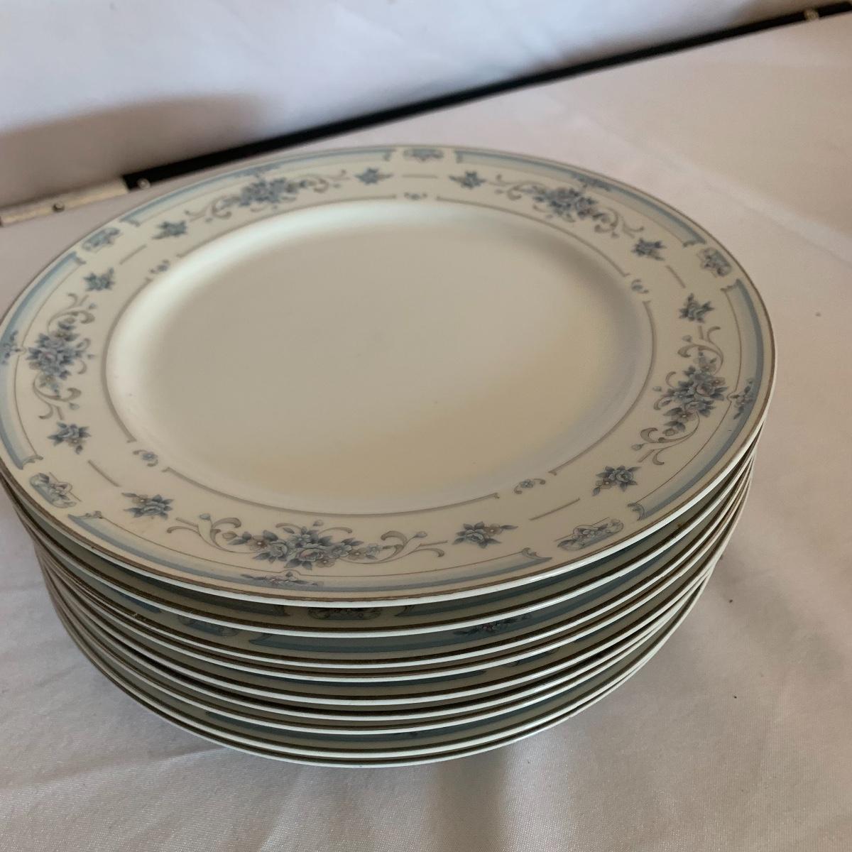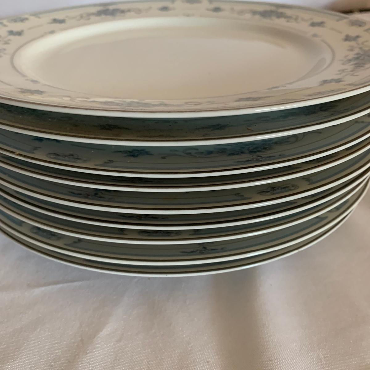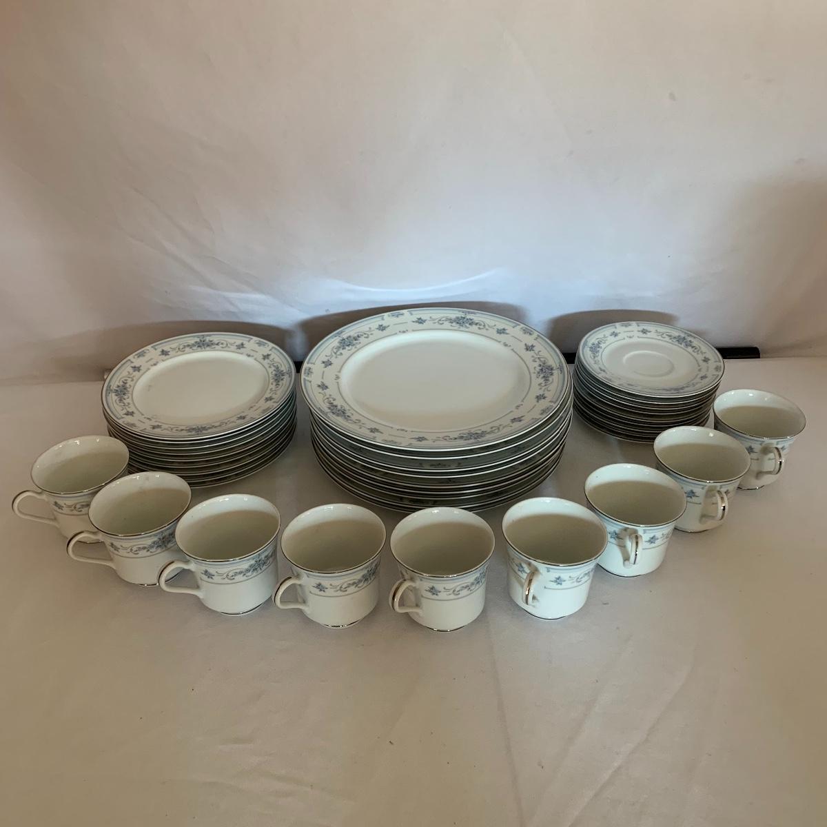 This China set is just stunning! Nitro Claridge is the manufacturer of this collection. All pieces feature a beautiful blue and silver flower design and silver rims. This set includes nine 11” dinner plates, nine 8” salad plates, and nine 6” desert plates. All pieces are in good condition, and are free of cracks, chips, and crazing. Local pick up only.
