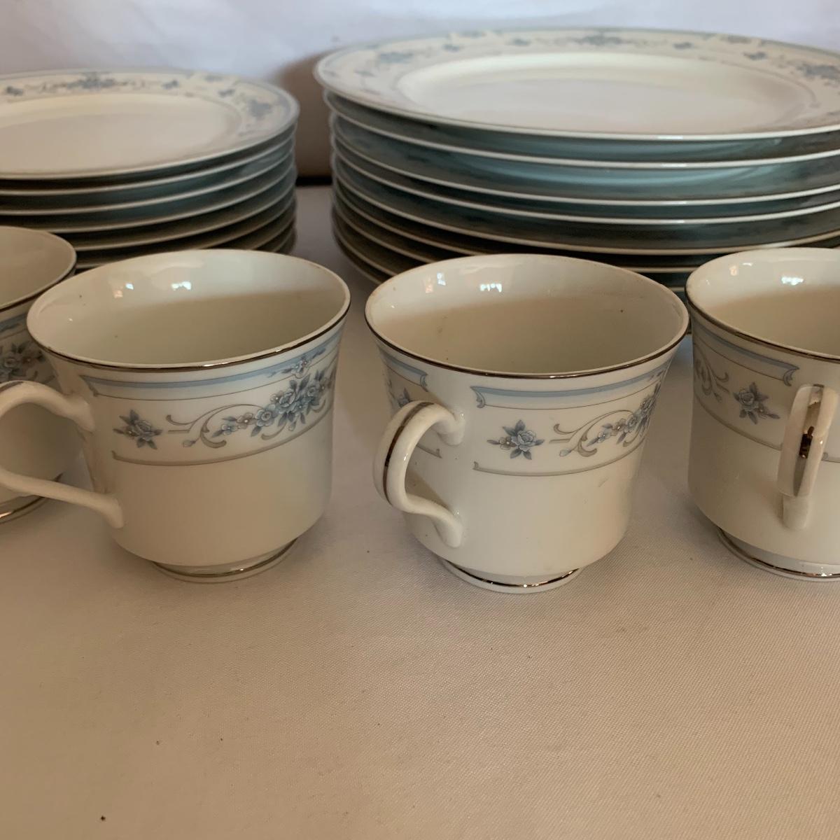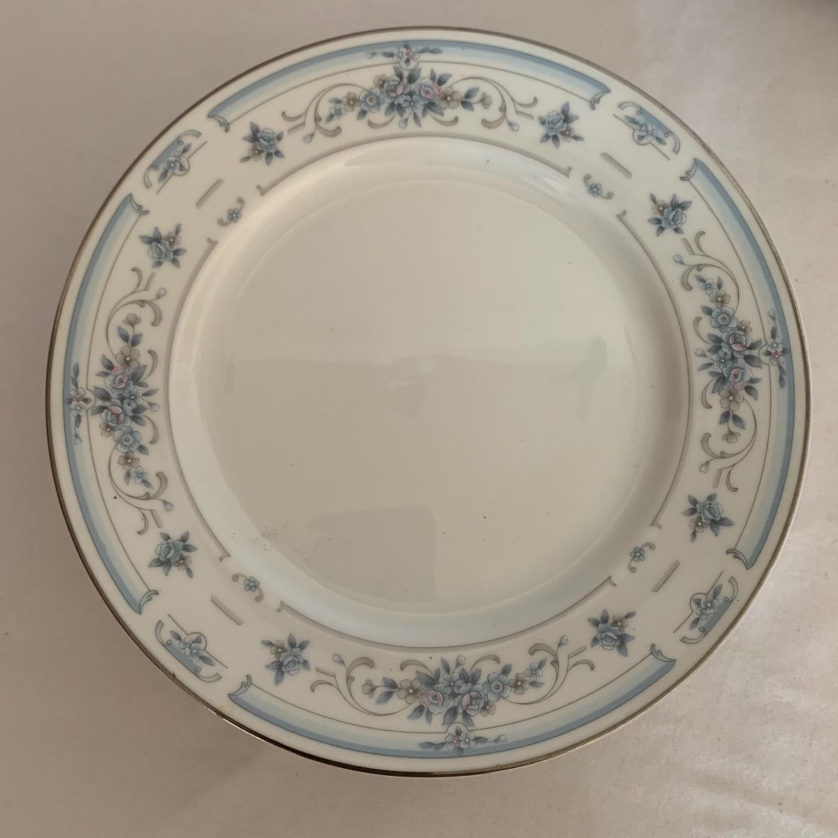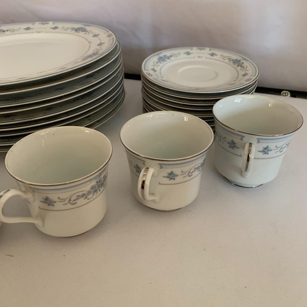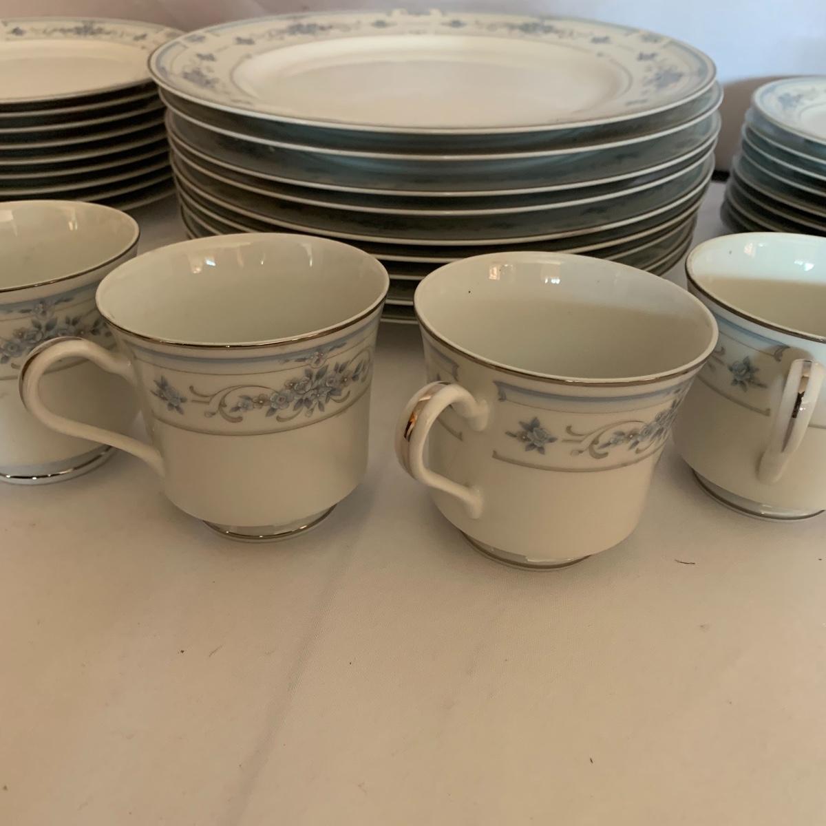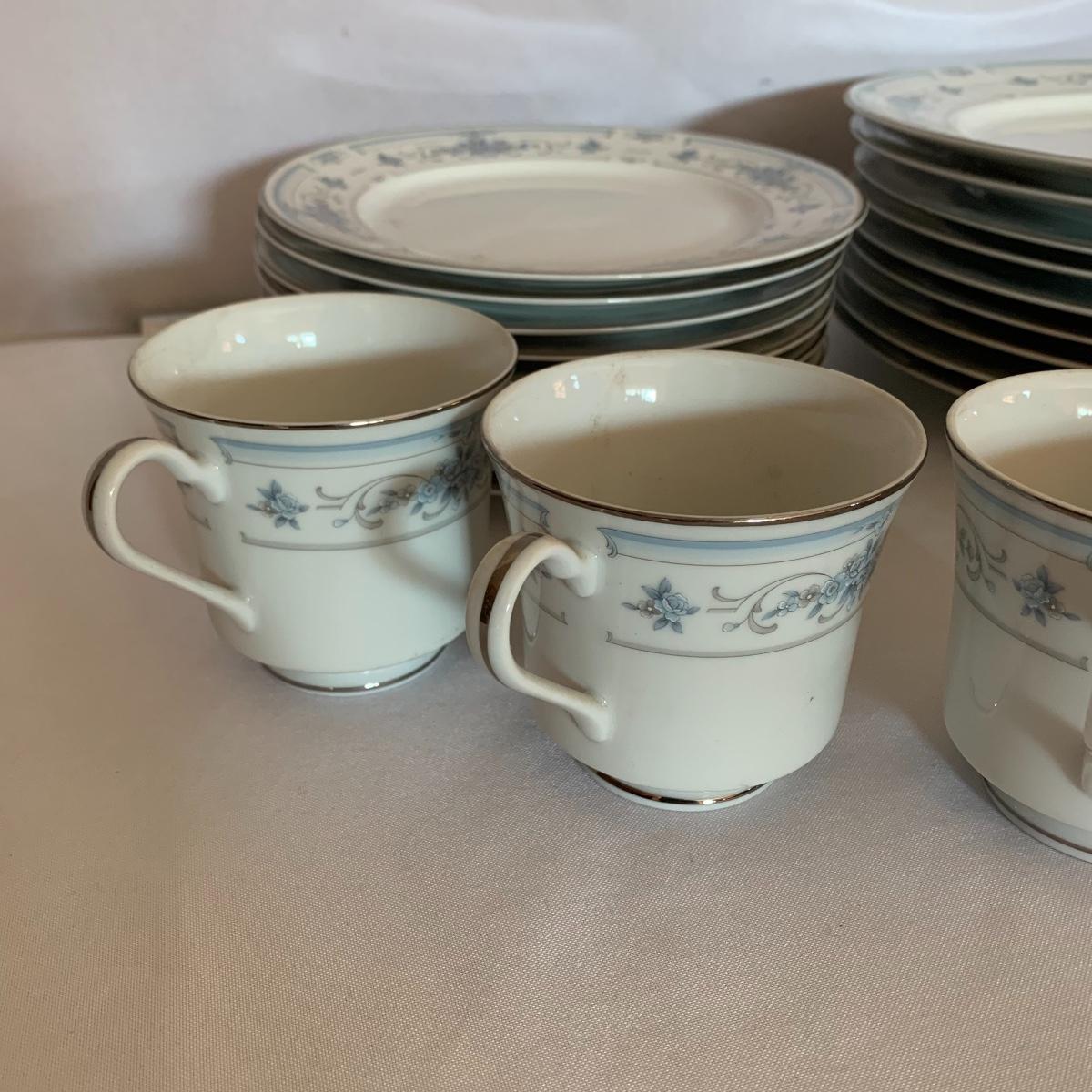 This China set is just stunning! Nitro Claridge is the manufacturer of this collection. All pieces feature a beautiful blue and silver flower design and silver rims. This set includes nine 11” dinner plates, nine 8” salad plates, and nine 6” desert plates. All pieces are in good condition, and are free of cracks, chips, and crazing. Local pick up only.