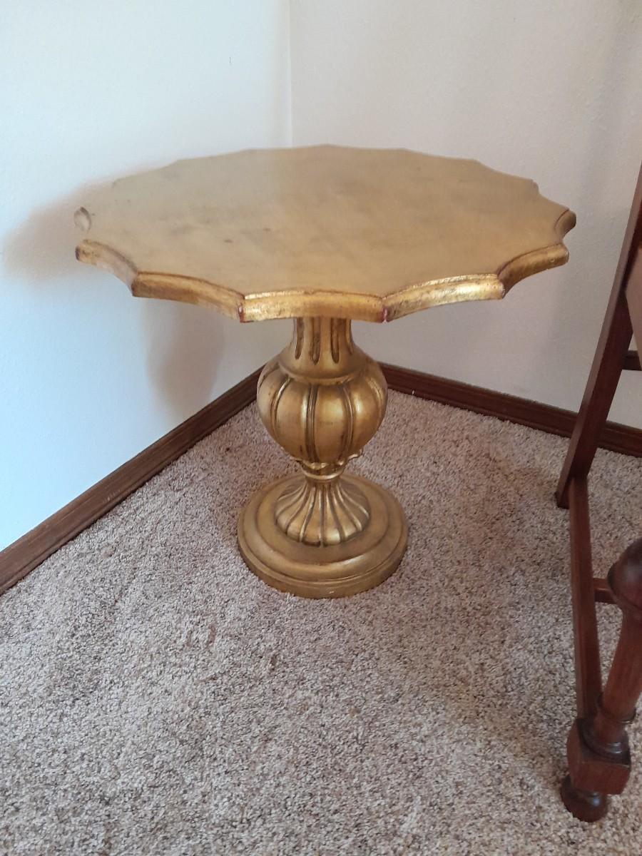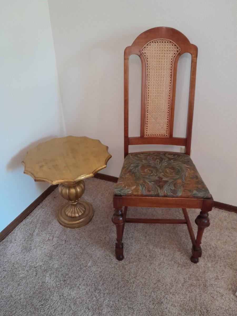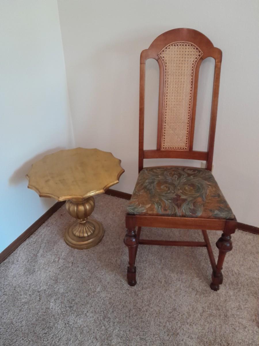 LOT 391 CHAIR AND SMALL GOLD COLORED TABLE