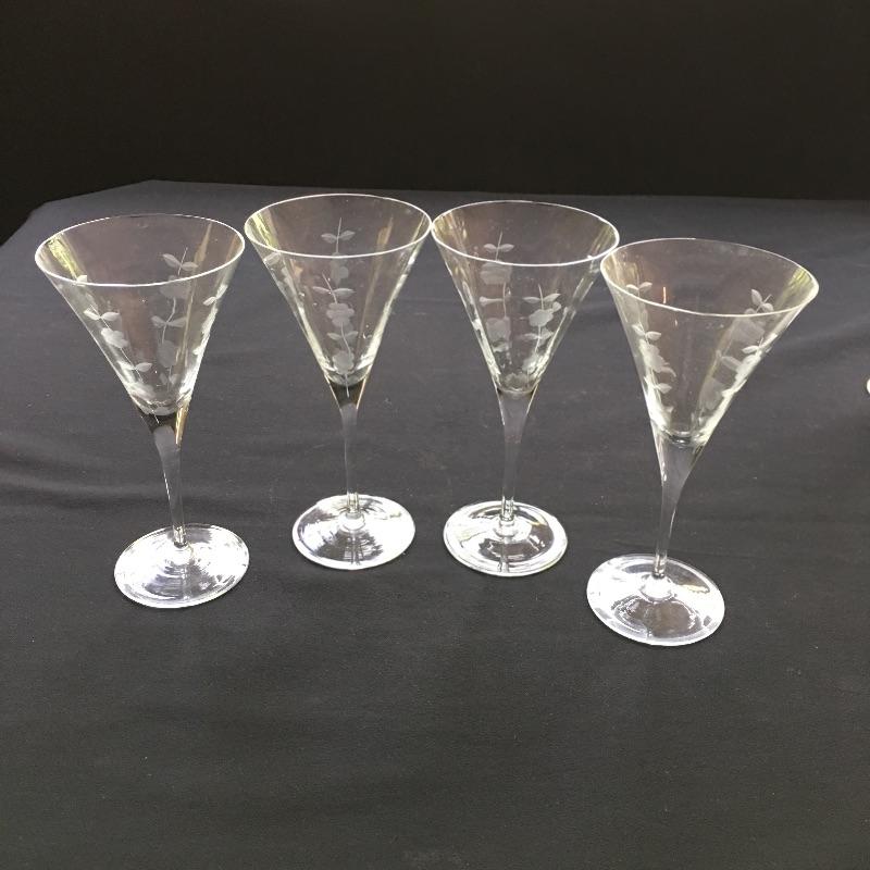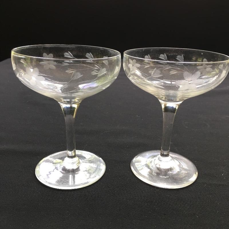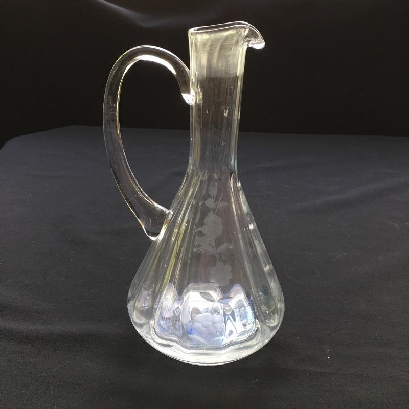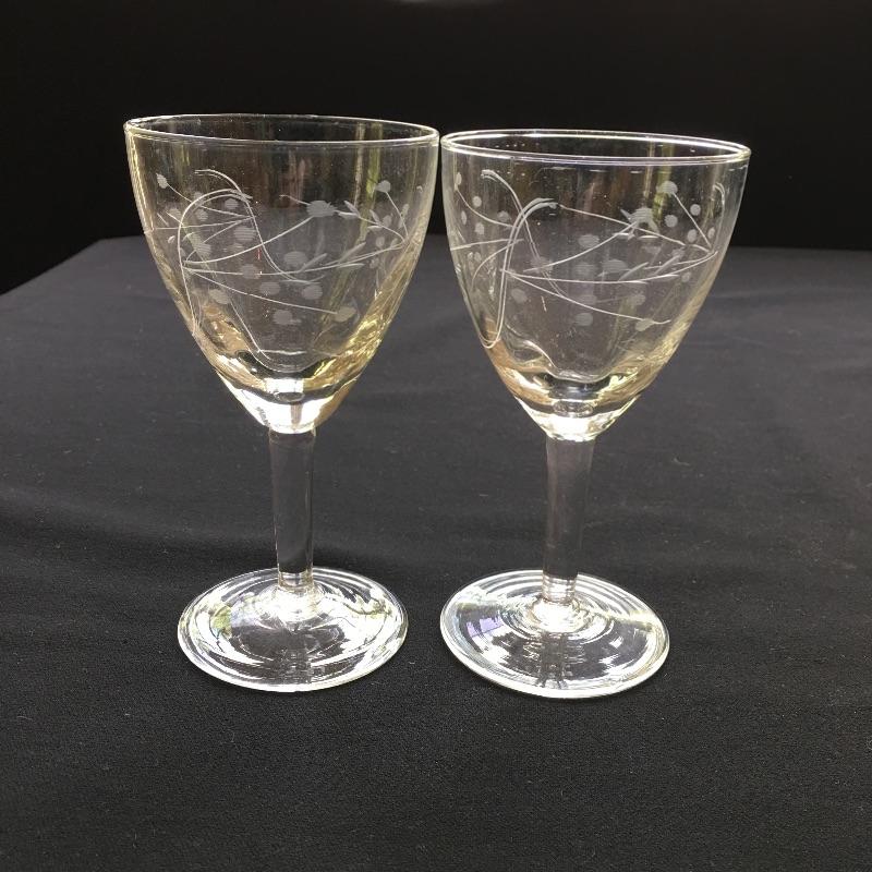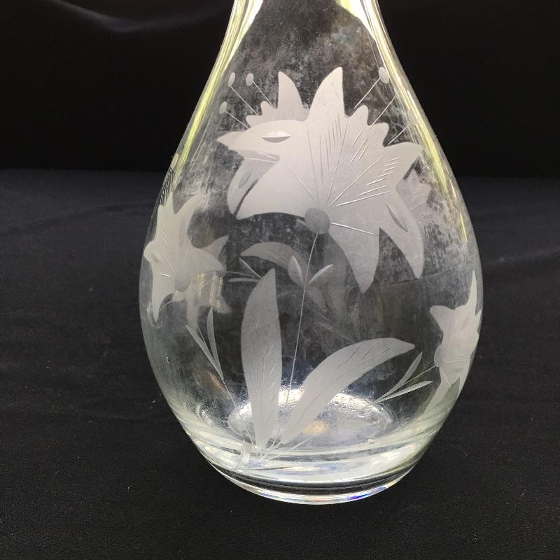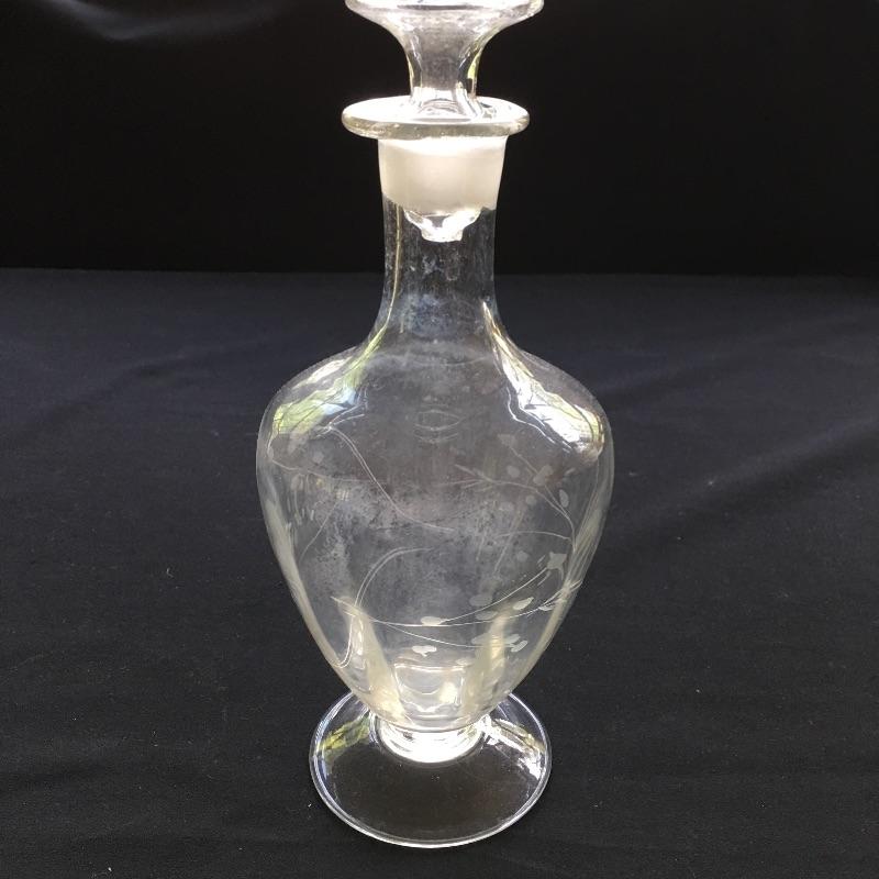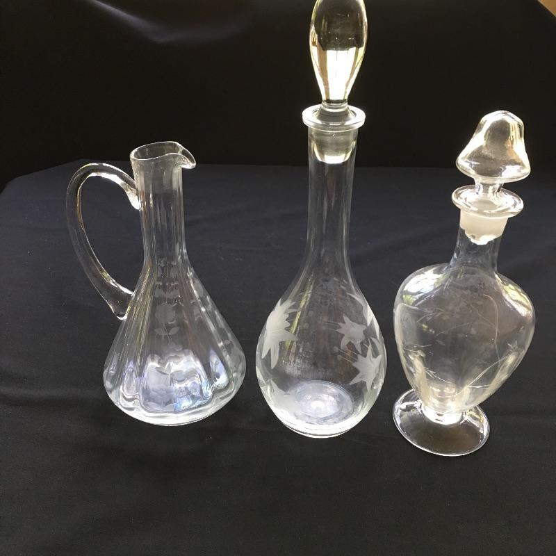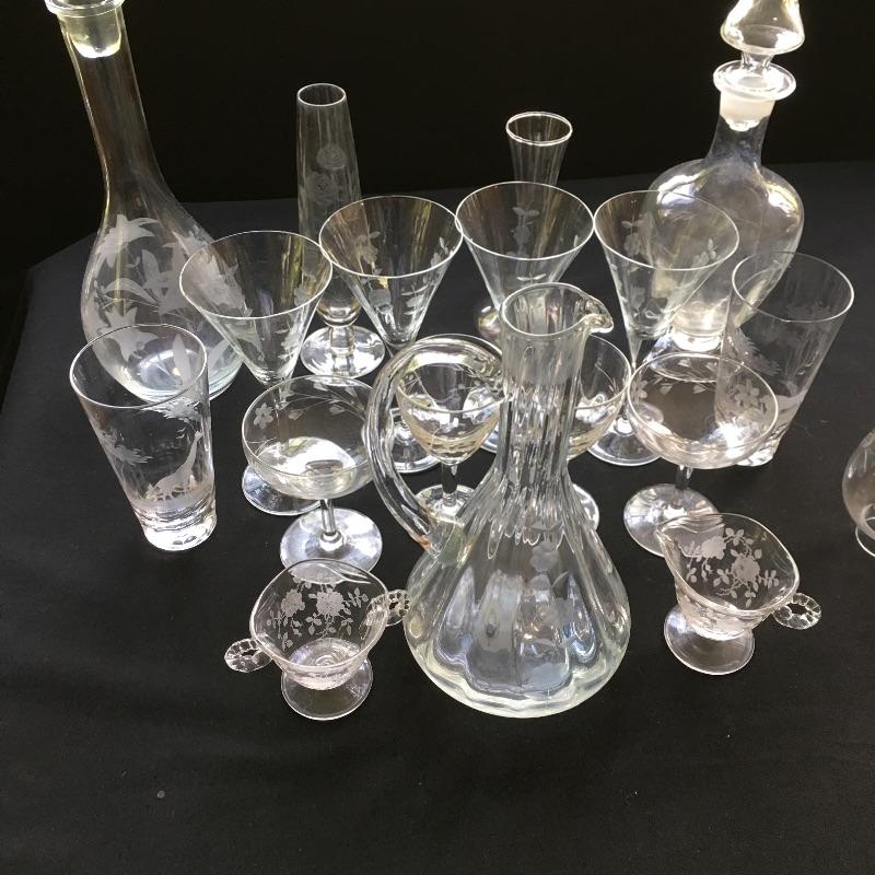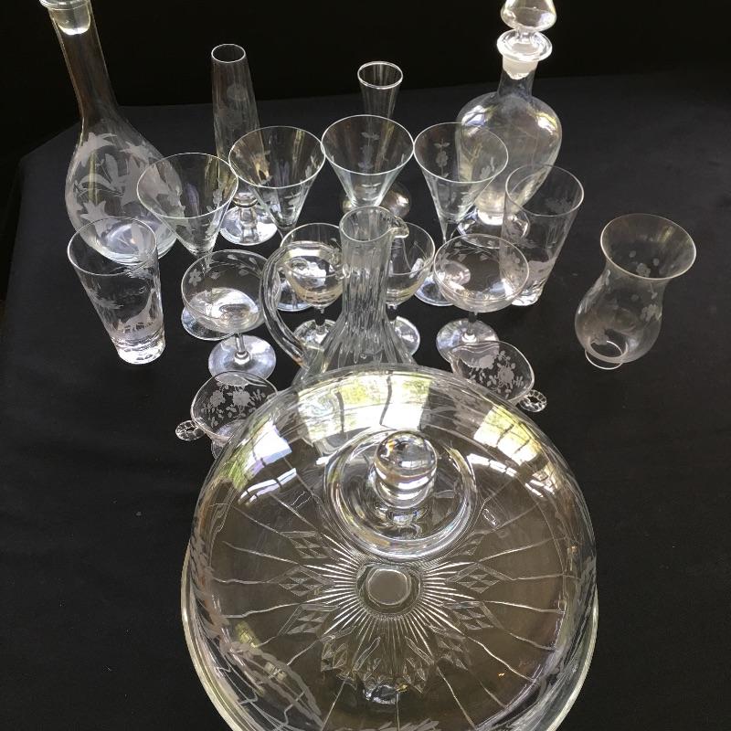 Etched glass including three decanters, covered cake dish, wine glasses small vase and more. One glass has chip - see pictures.