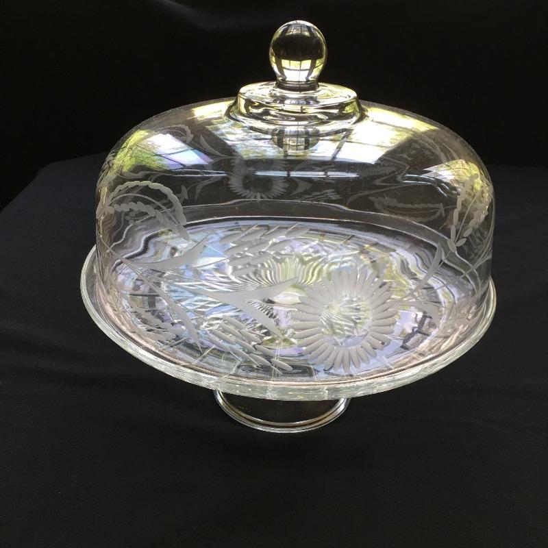 Covered cake dish measures 12” D and 12” tall.