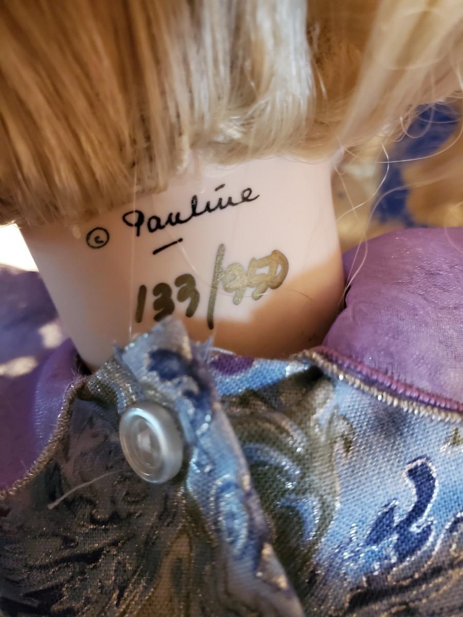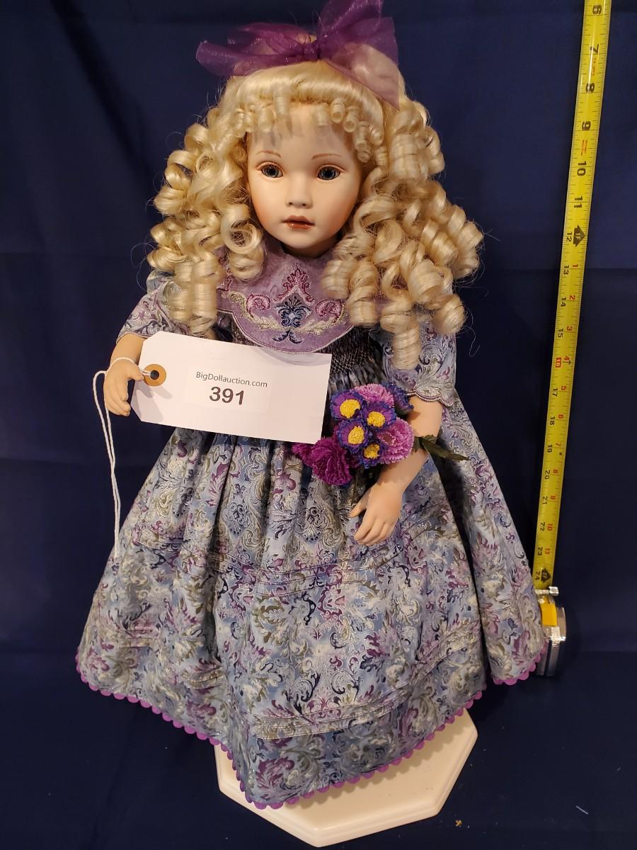 Doll Named "Page" By Pauline with Floral Dress and Flower Bouquette With Curly Blonde Hair