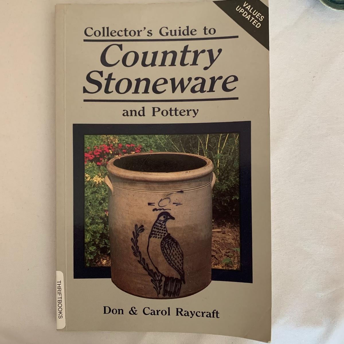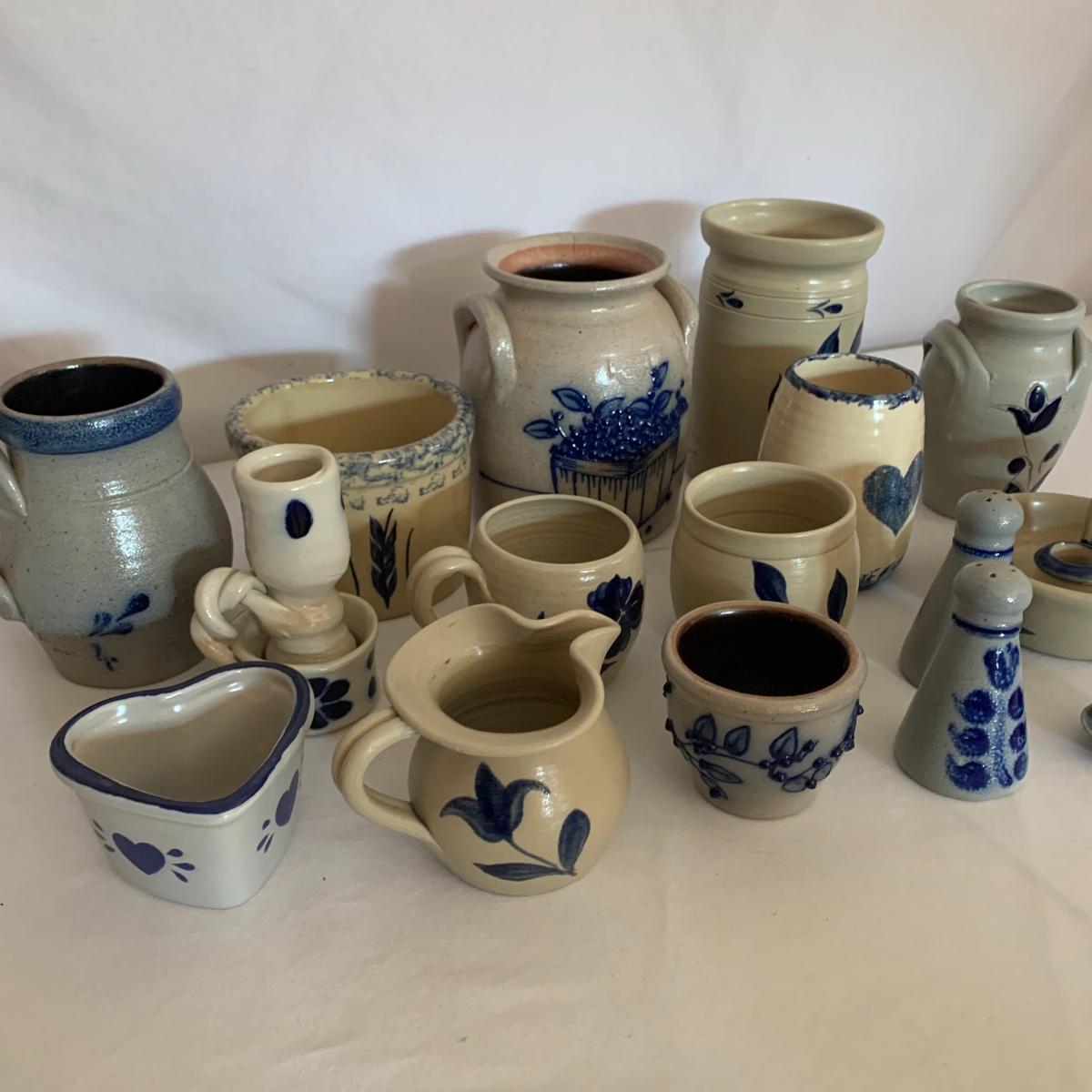 Start a Stoneware Collection! This lot features several pieces including a crock, two pitchers, a mug, a candle holder, salt and pepper shakers, and more. Also included is a copy of Collectors Guide to Country Stoneware, so you can learn about collecting. All pieces are in good condition except the larger crock has a crack (see pics).