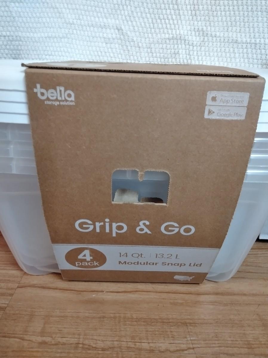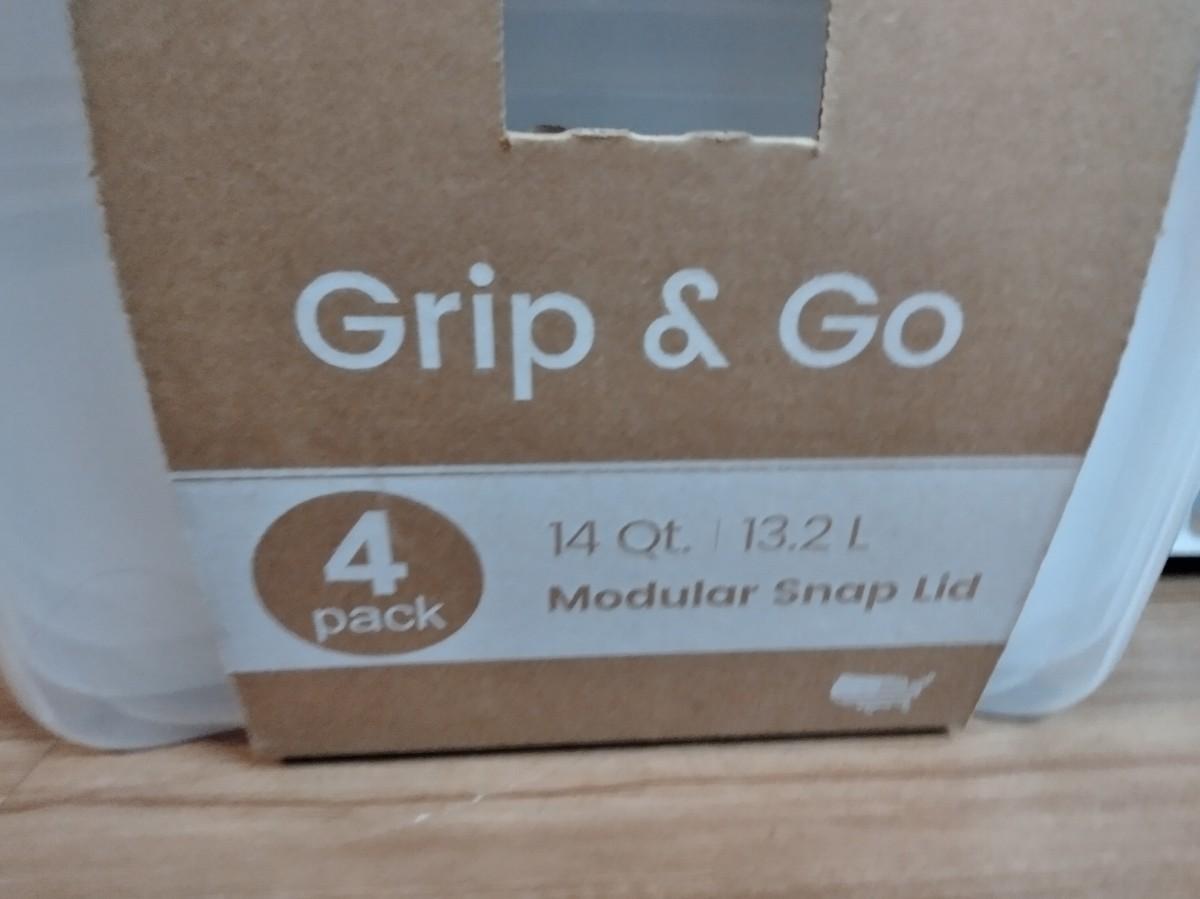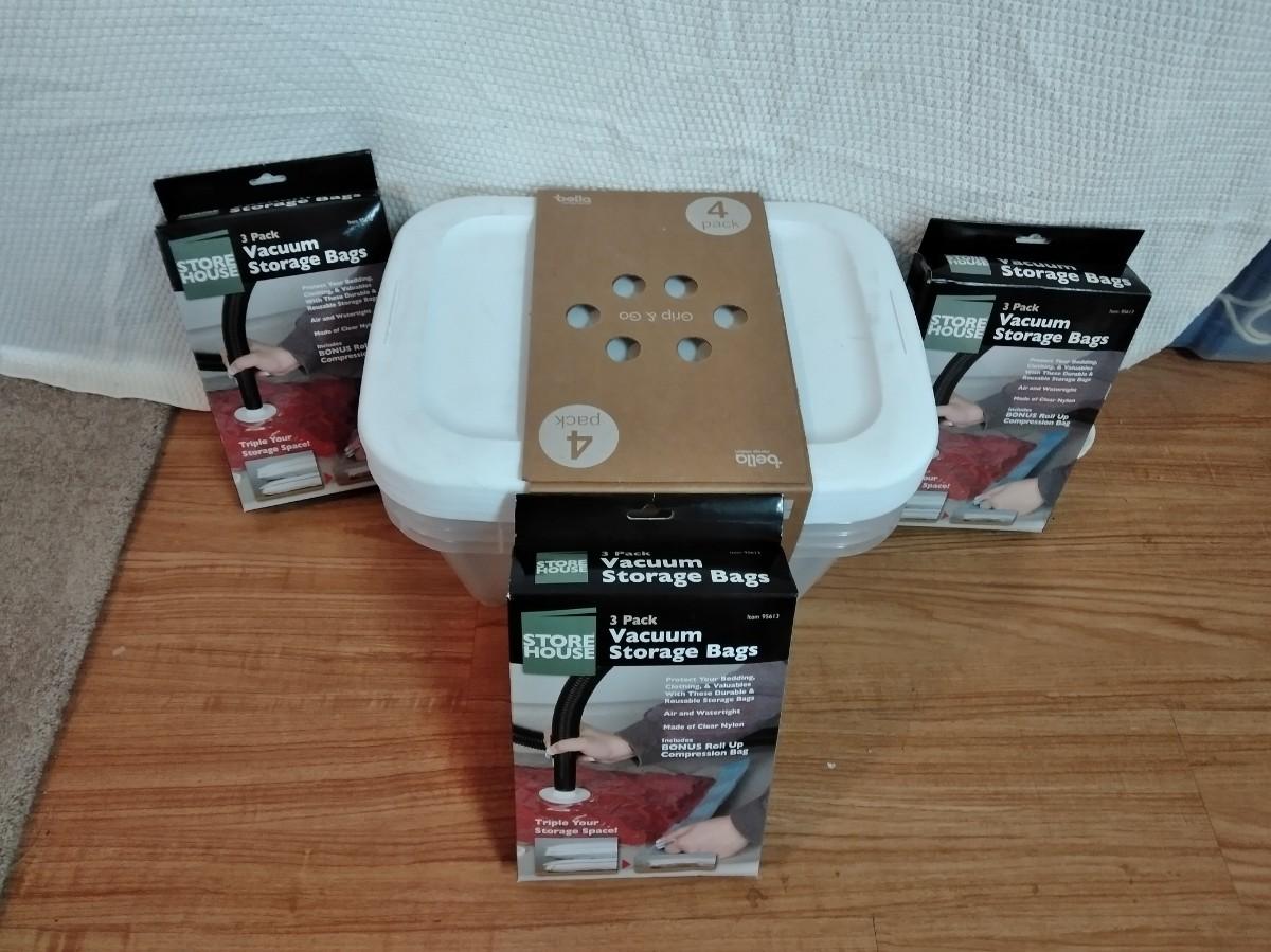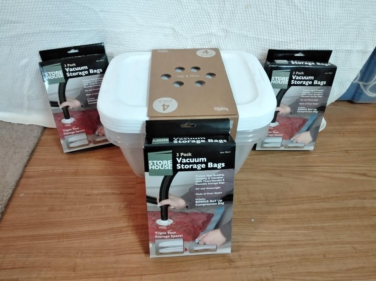 THREE BOXES OF 3 PACK VACUUM STORAGE BAGS, AND FOUR NEW GRIP AND GO 14 QT. MODULAR SNAP LID STORAGE TOTES.