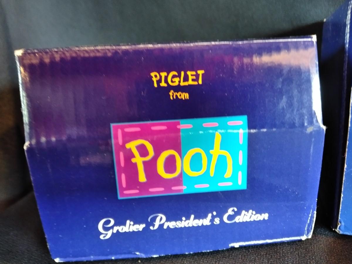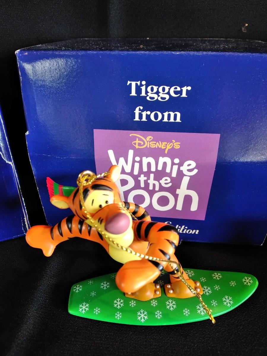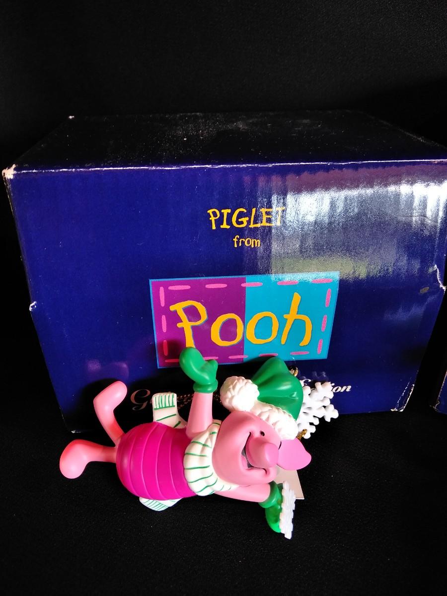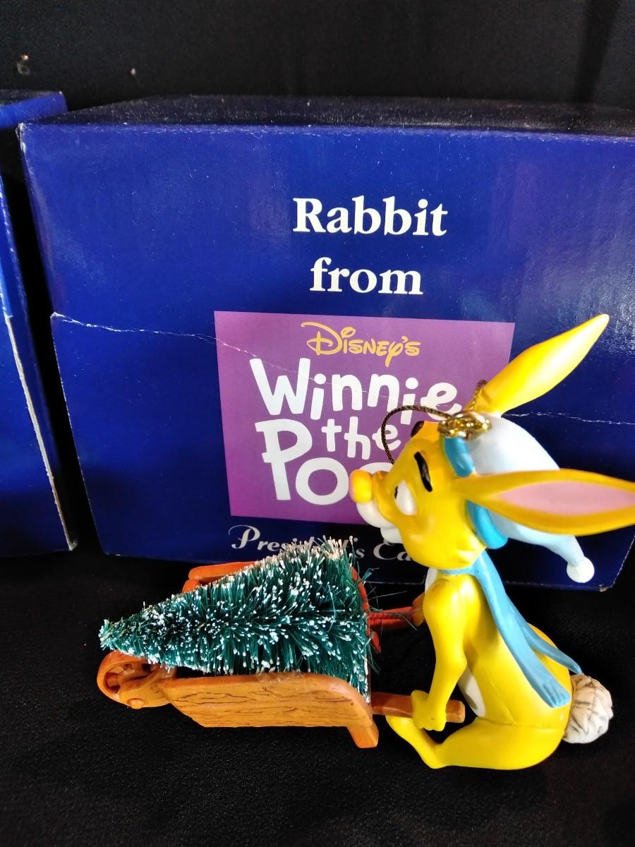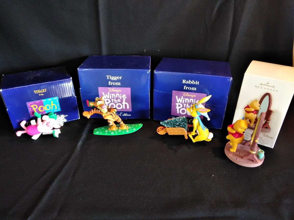 FOUR WINNIE THE POOH CHRISTMAS DECORATIONS, PIGLET, TIGGER, RABBIT, GROLIER PRESIDENT'S EDITION AND HALLMARK KEEPSAKE POOH BEAR.