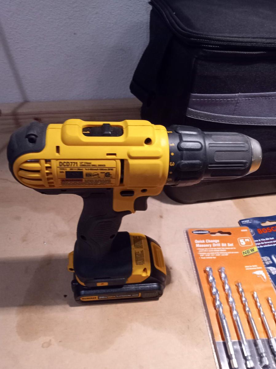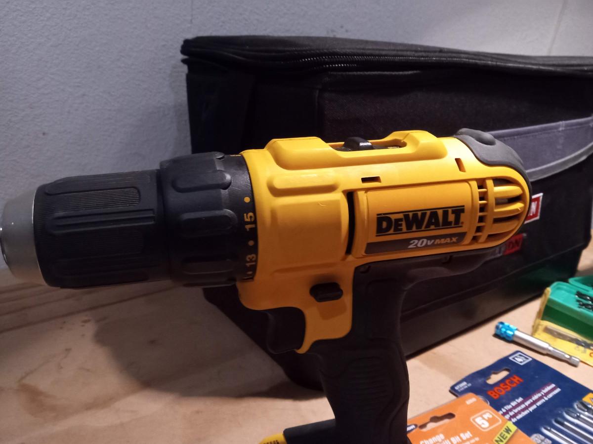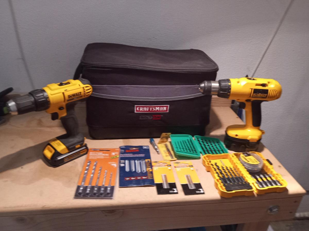 LOT 393  TWO DEWALT CORDLESS DRILLS, BITS AND TOOL BAG