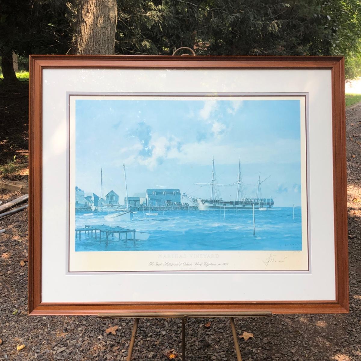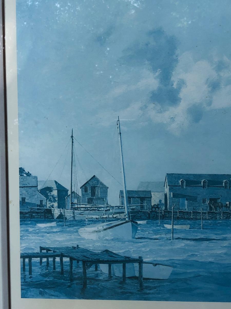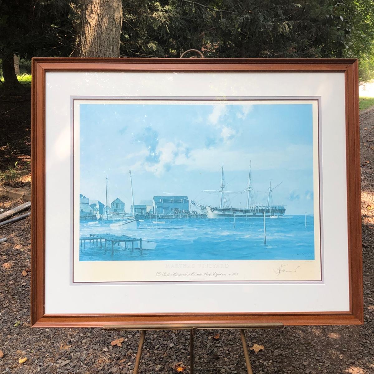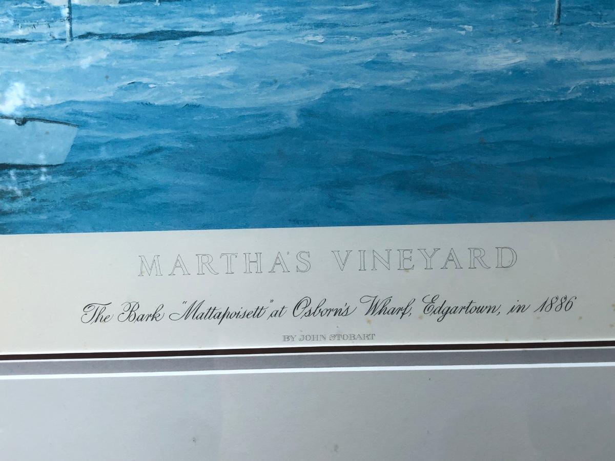 LOT 393G: Signed & Numbered 1982 John Stobart (British, 1929-2023) Martha's Vineyard The Bark "Mattapoisett" at Osborn's Wharf, Edgarton in 1886 Print (327/750)