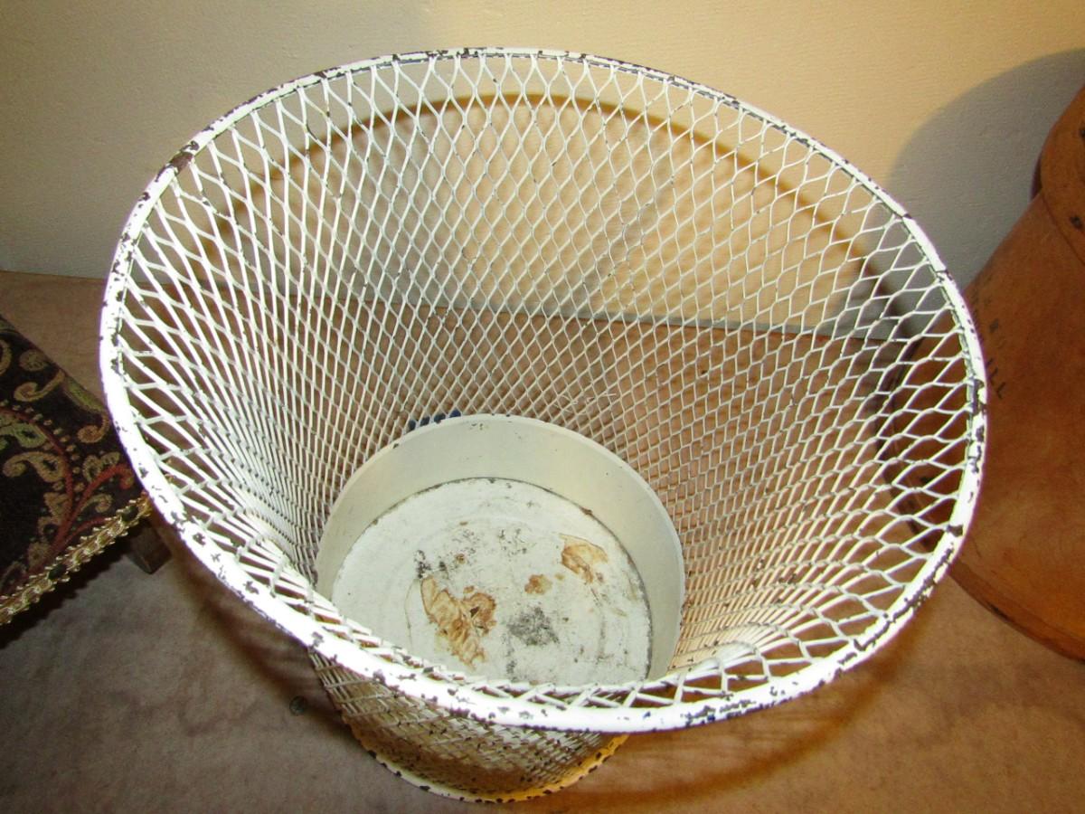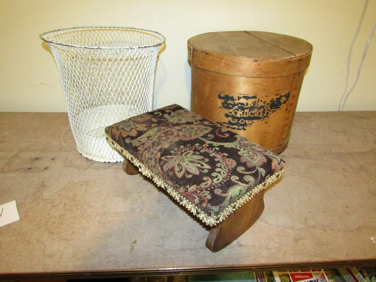 METAL MESH TRASH CAN, WOODEN BOX AND FOOT STOOL