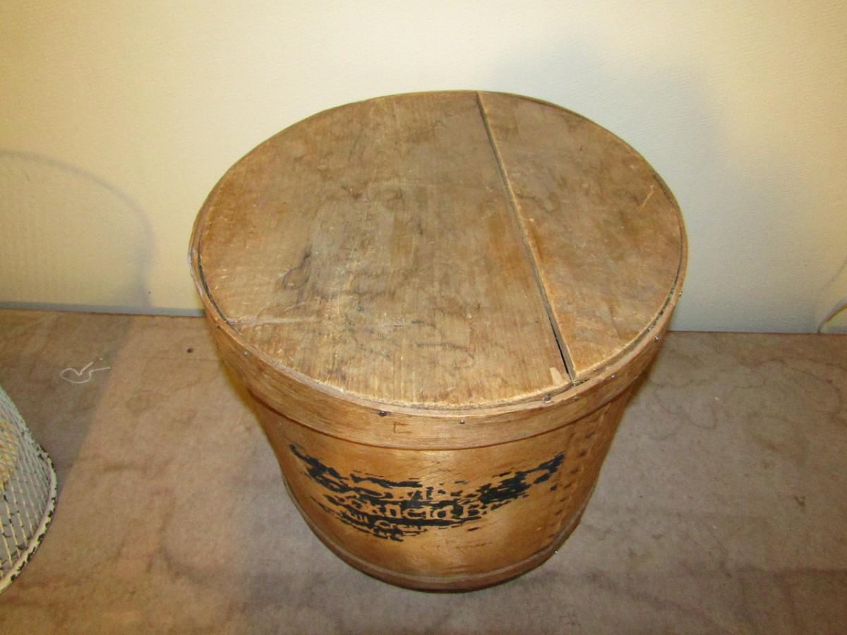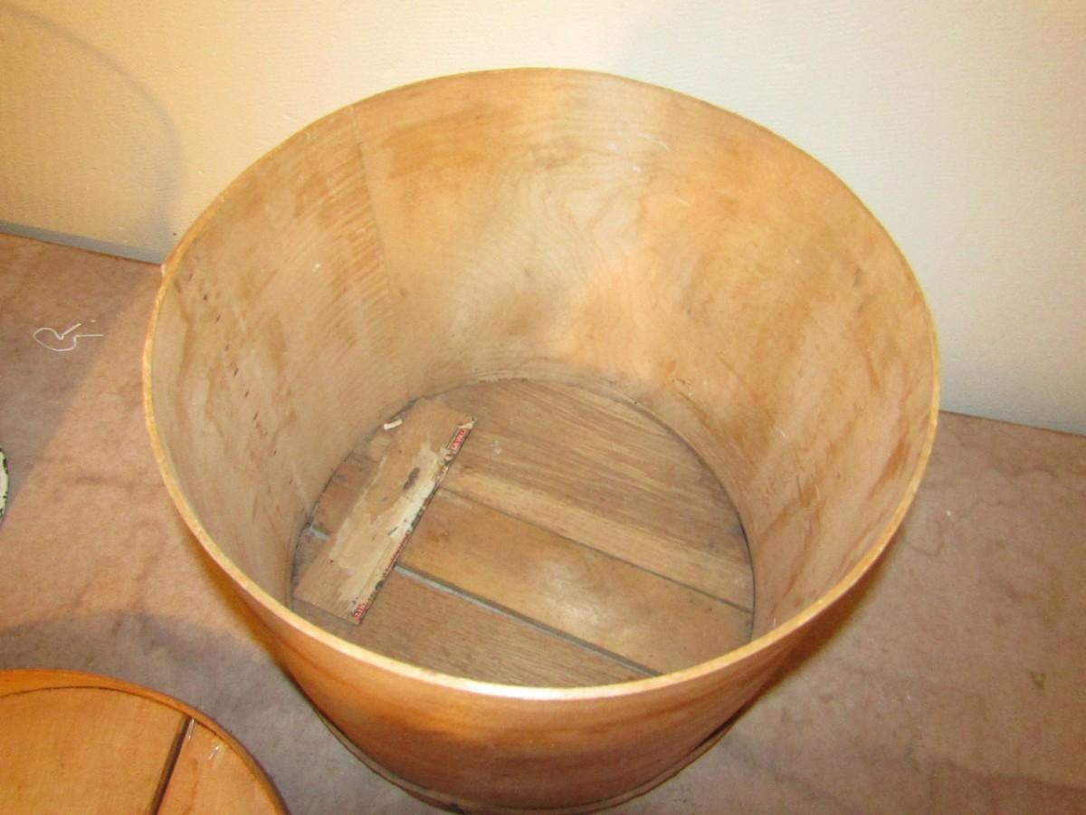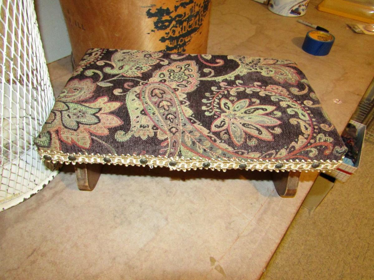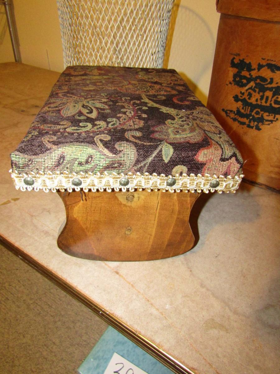 LOT 394 METAL MESH TRASH CAN, WOODEN BOX AND FOOT STOOL