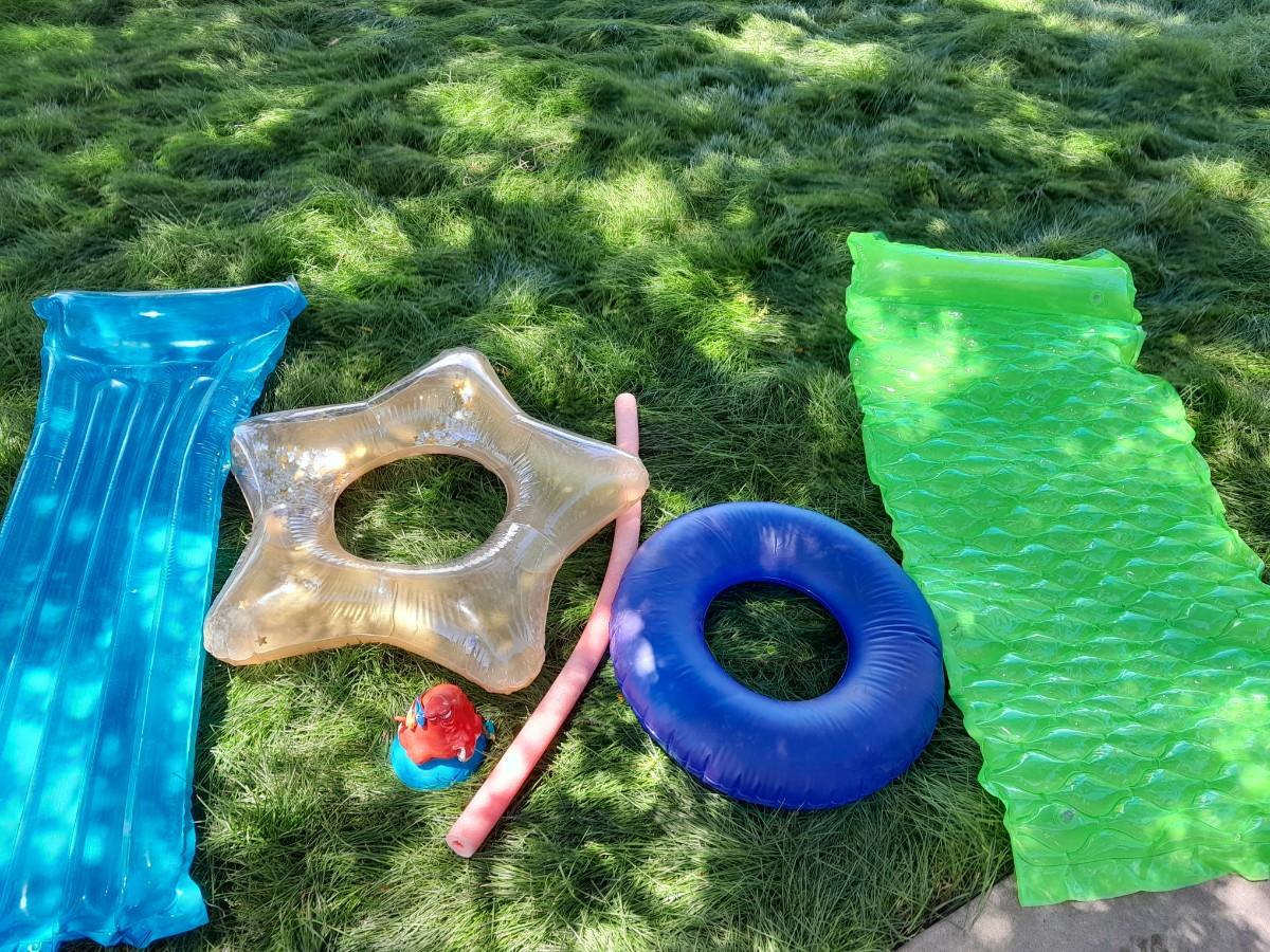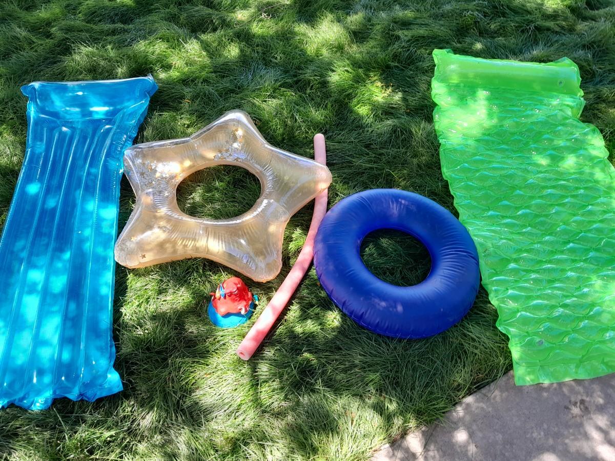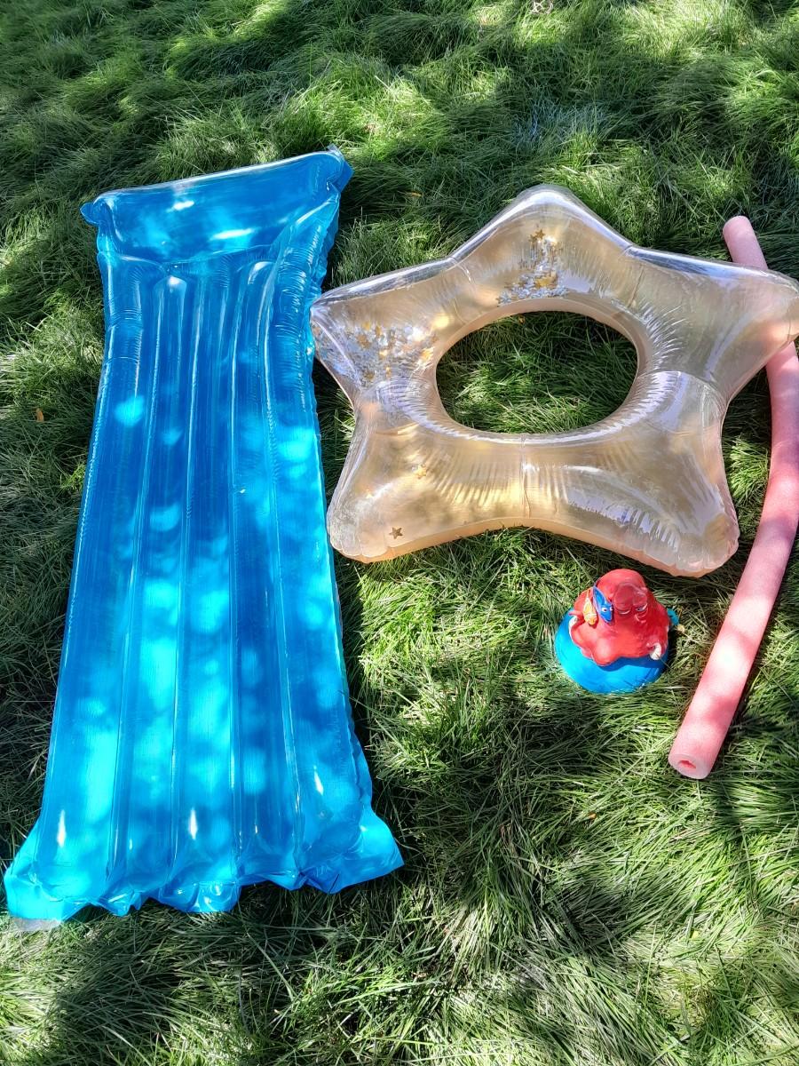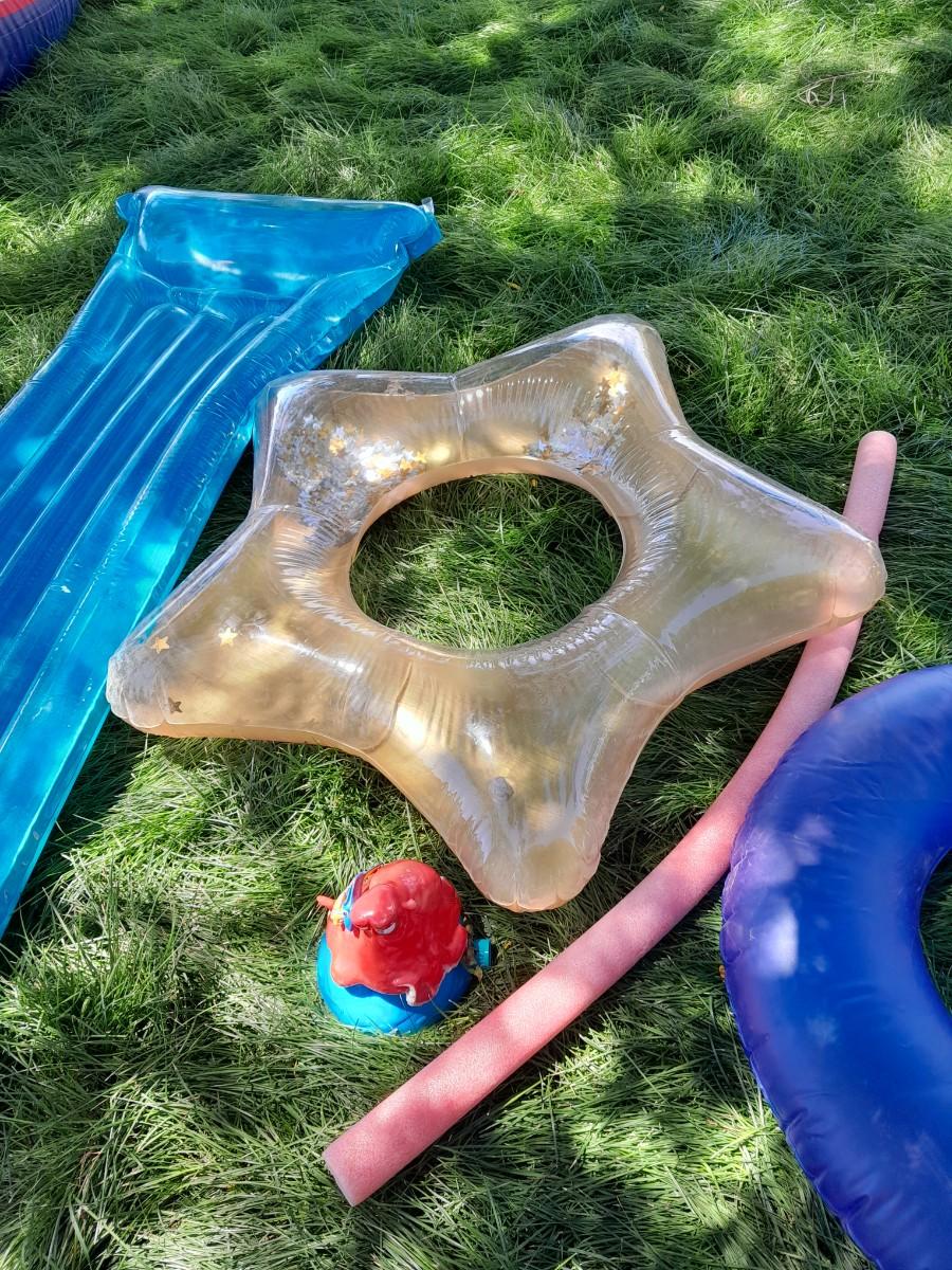 POOL TOYS, FLOATIES AND A BEACH BALL WITH A LITTLE MERMAID SPRINKER