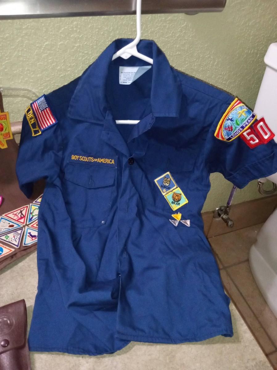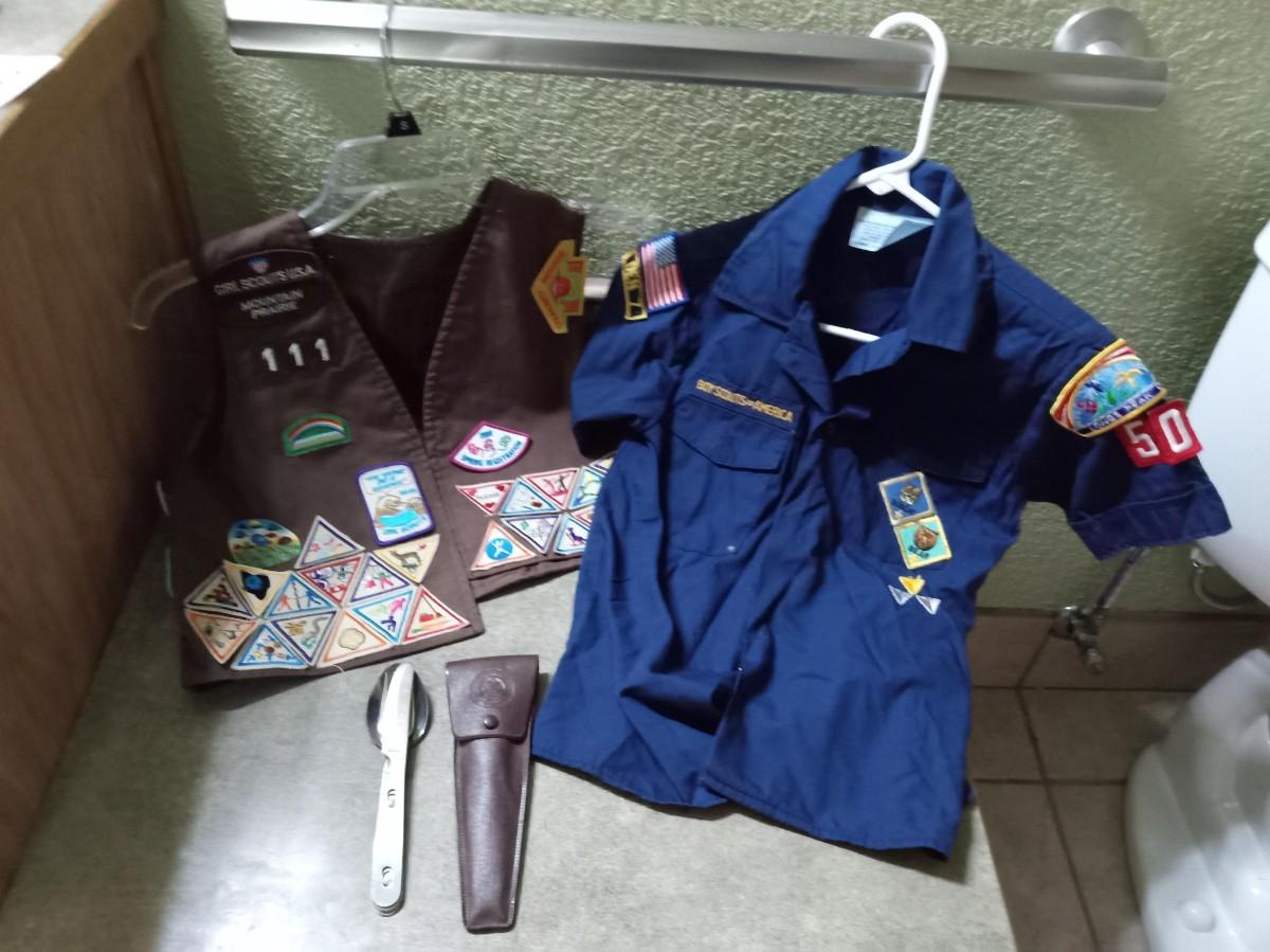 LOT 395  BROWNIE VEST, BOY SCOUT SHIRT AND UTENSIL SET  (HD)