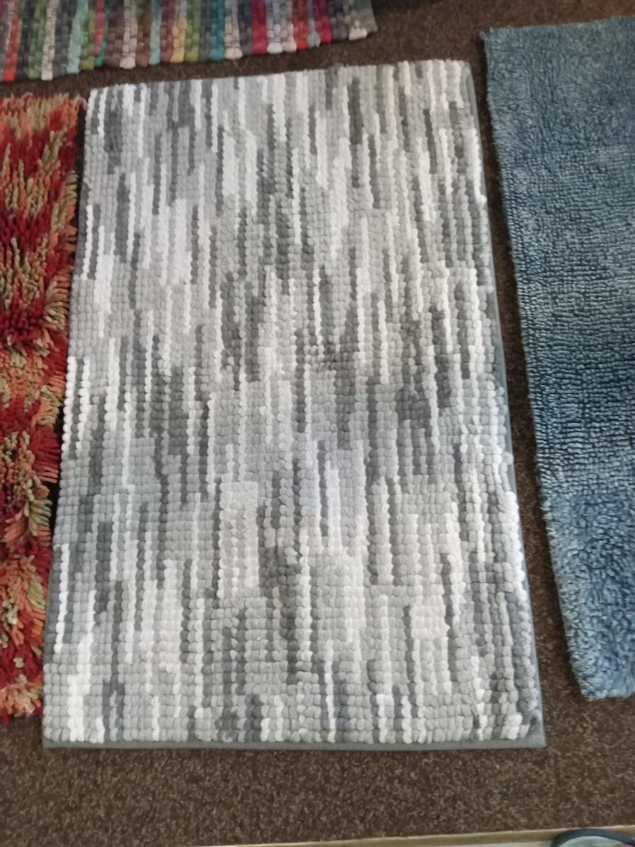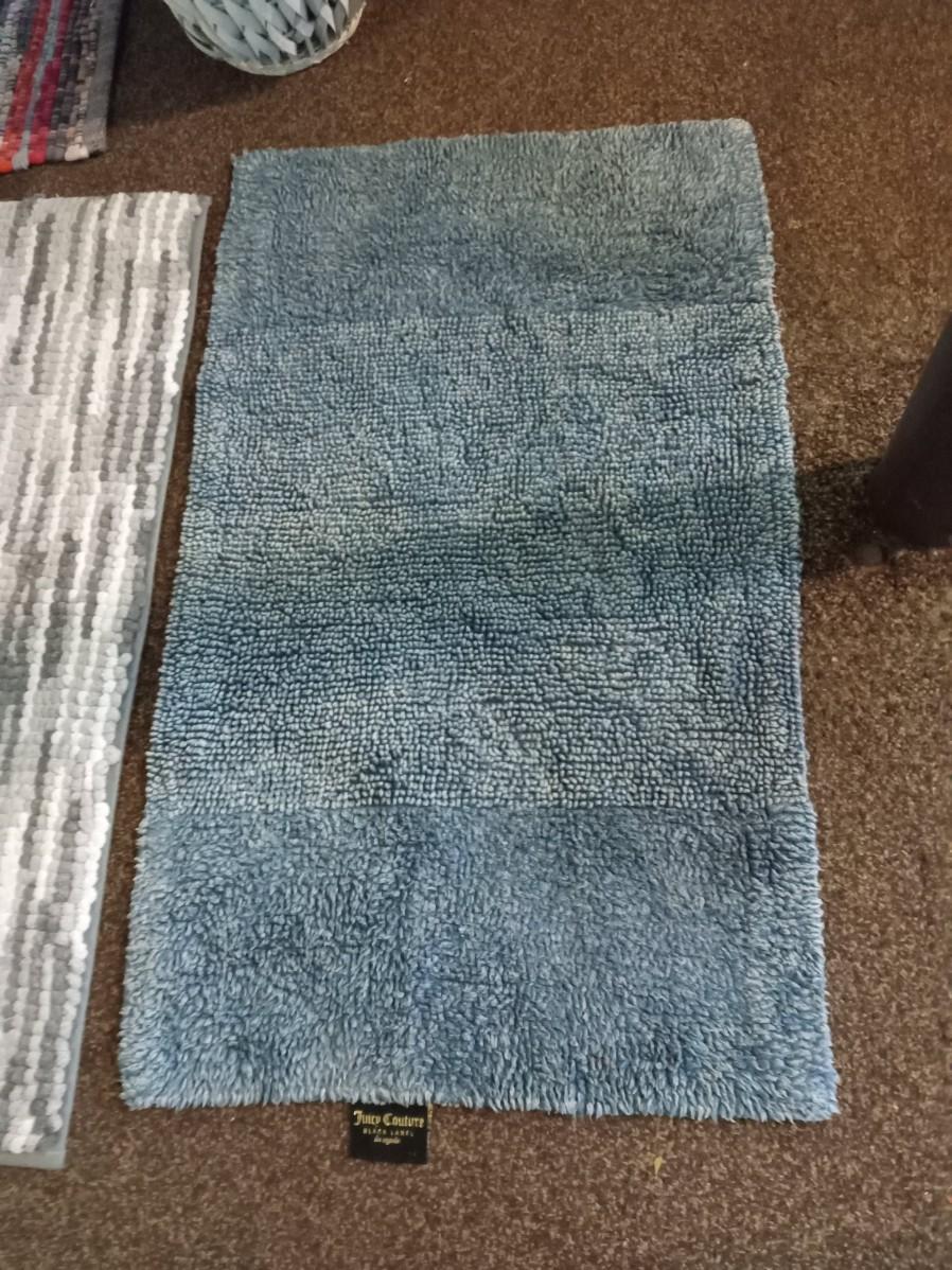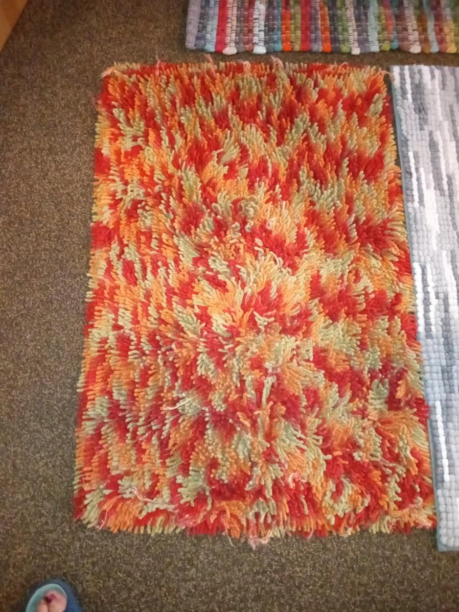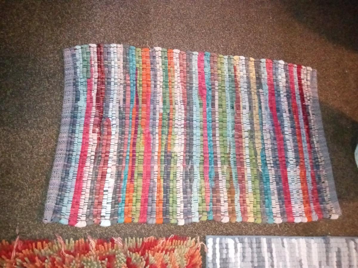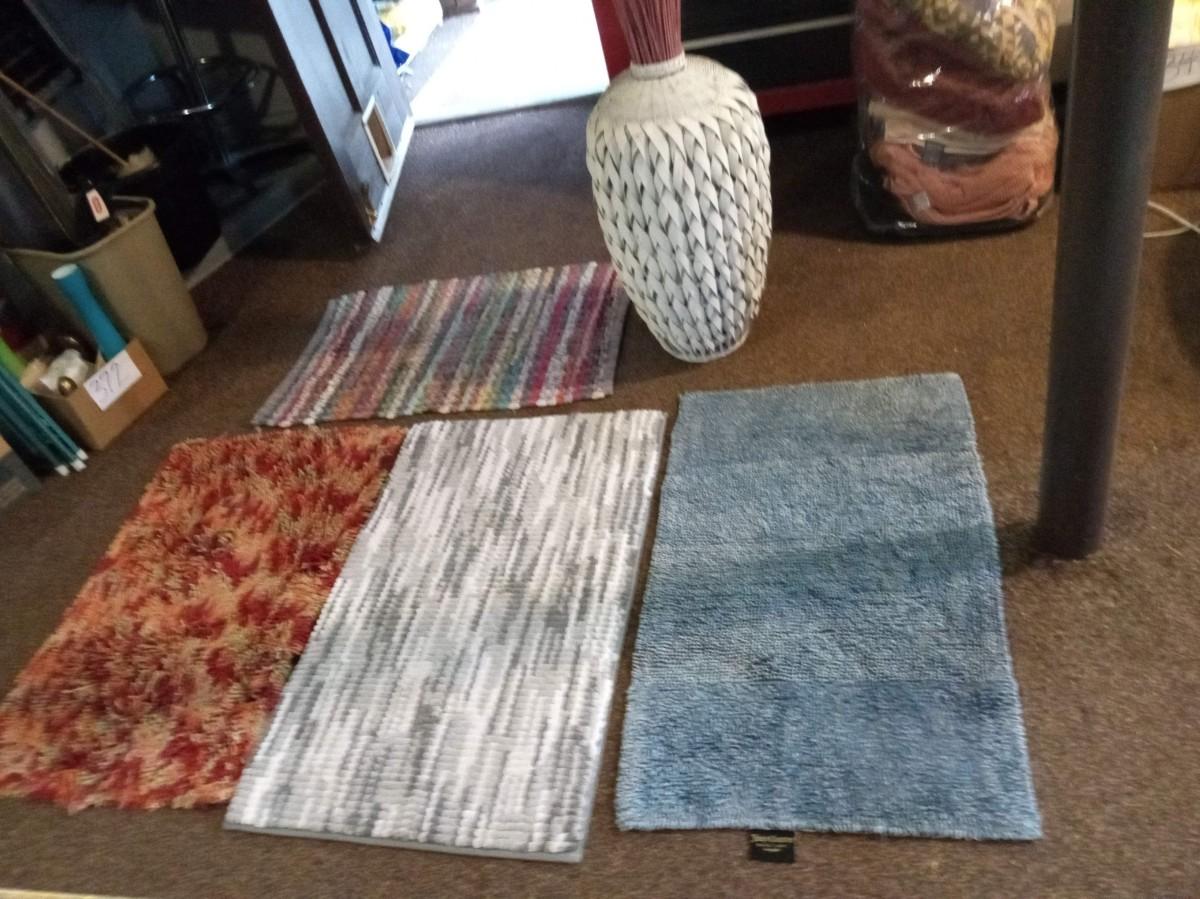 LOT 395  FOUR THROW RUGS AND A WICKER FLOOR VASE