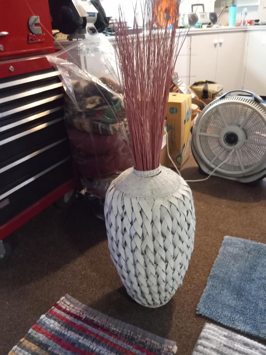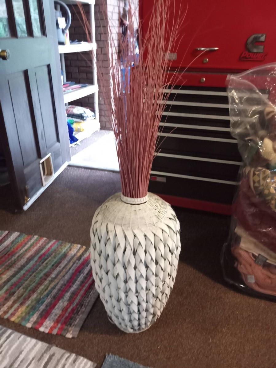 LOT 395 FOUR THROW RUGS AND A WICKER FLOOR VASE