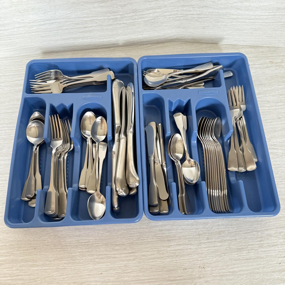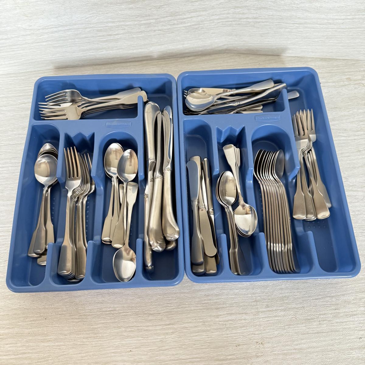 LOT 395K: Oneida Stainless Steel Flatware w/ Rubbermaid Organizers