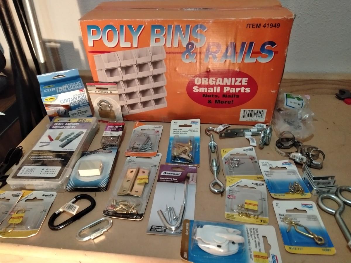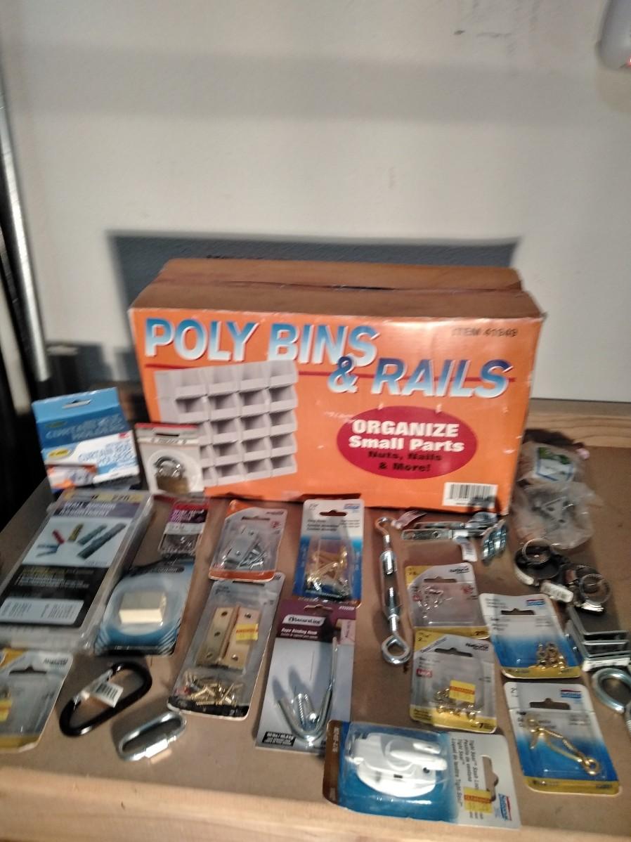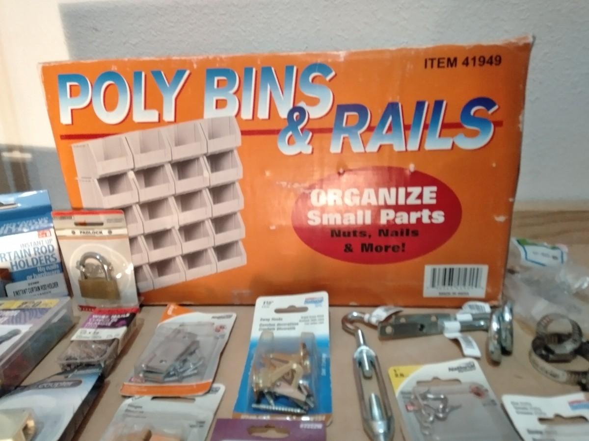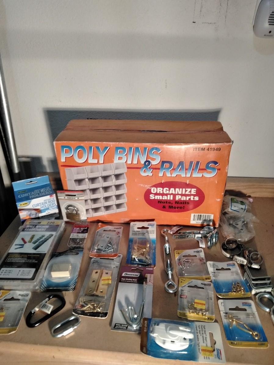 NEW POLYBINS RAILS STORAGE WITH NEW BAGS OF HARDWARE.