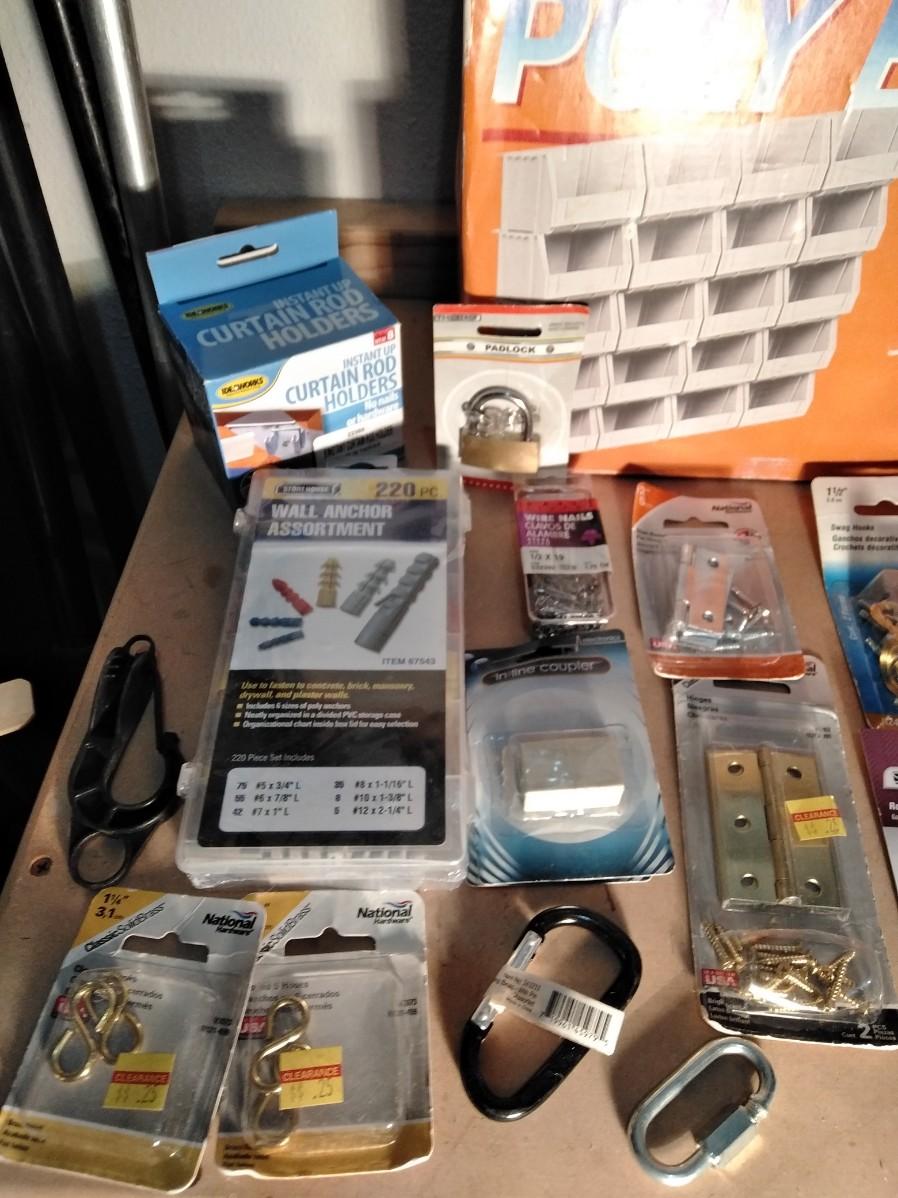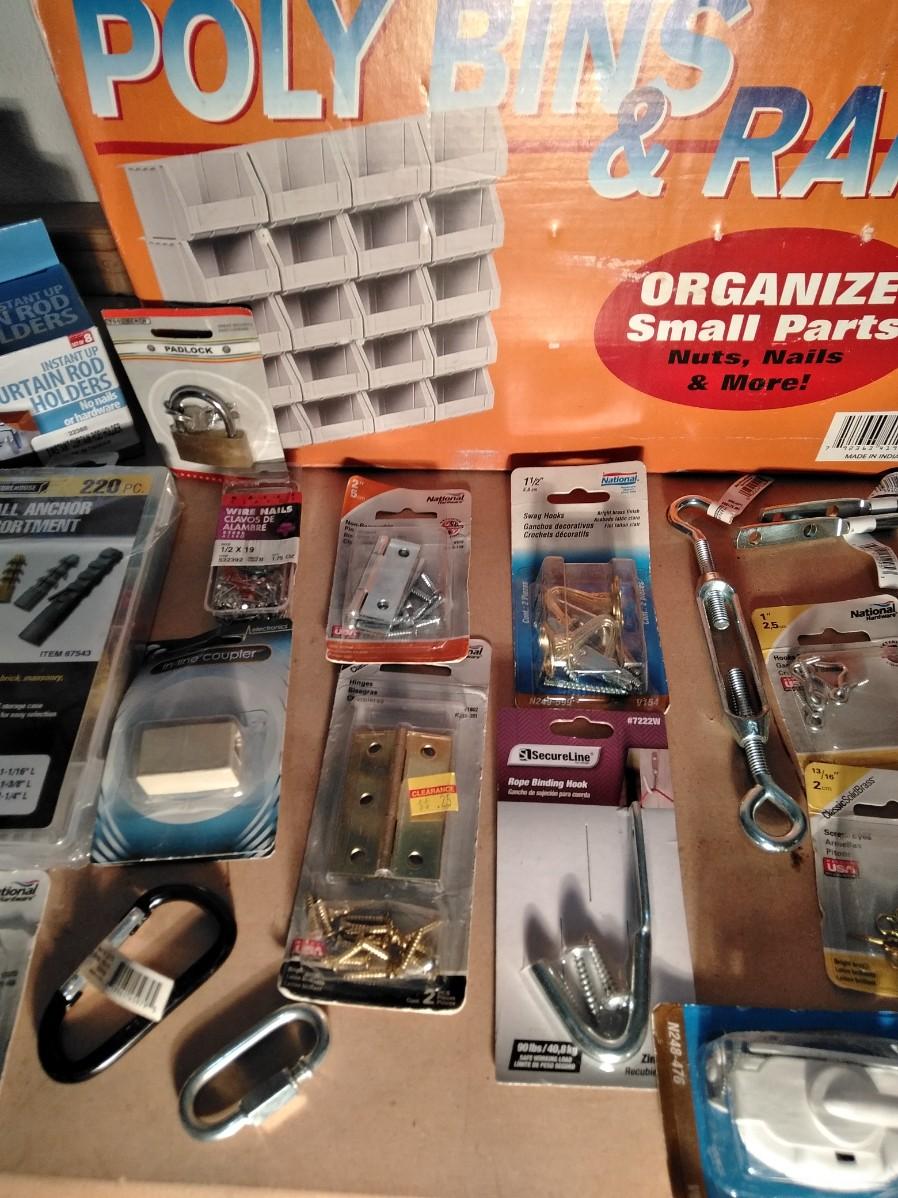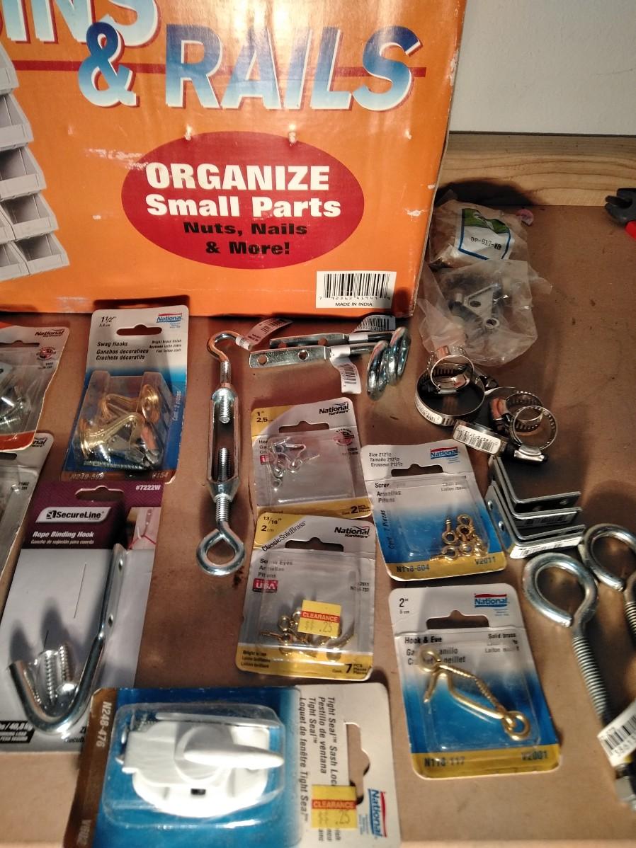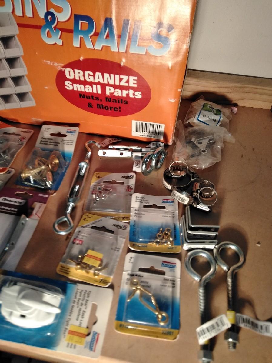 NEW POLYBINS RAILS STORAGE WITH NEW BAGS OF HARDWARE.