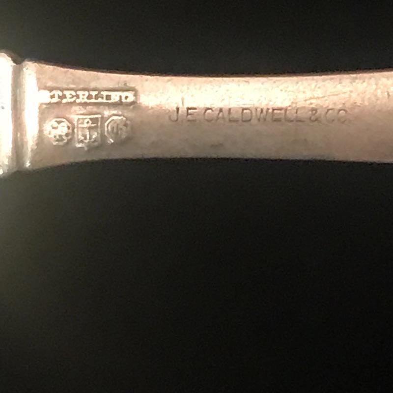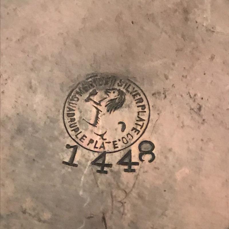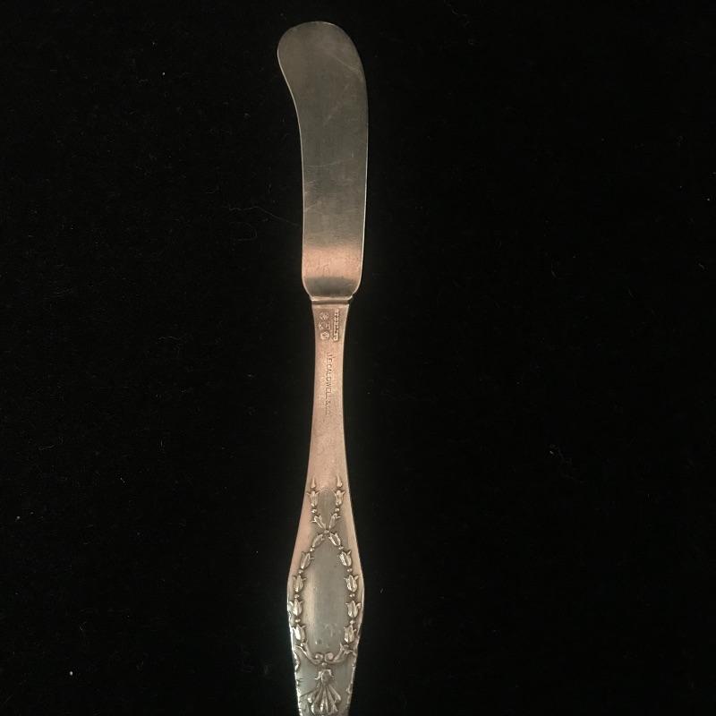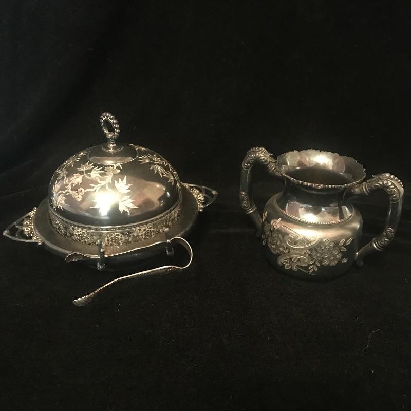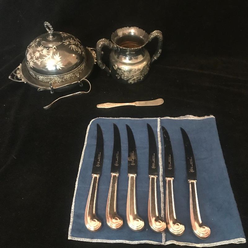 The two silver plate pieces are stamped quadruple plate by different designers but go nicely together. Double handled vase stands 4” tall. Six Gentry Sheffield English steak knives and a sterling J E Caldwell sterling butter knife finish out this lot. Shipping available.