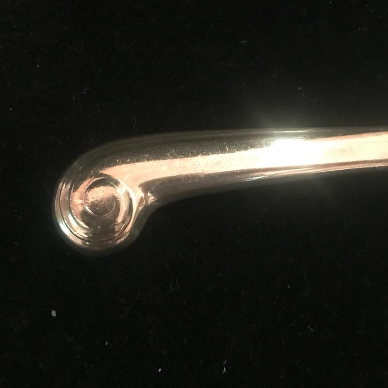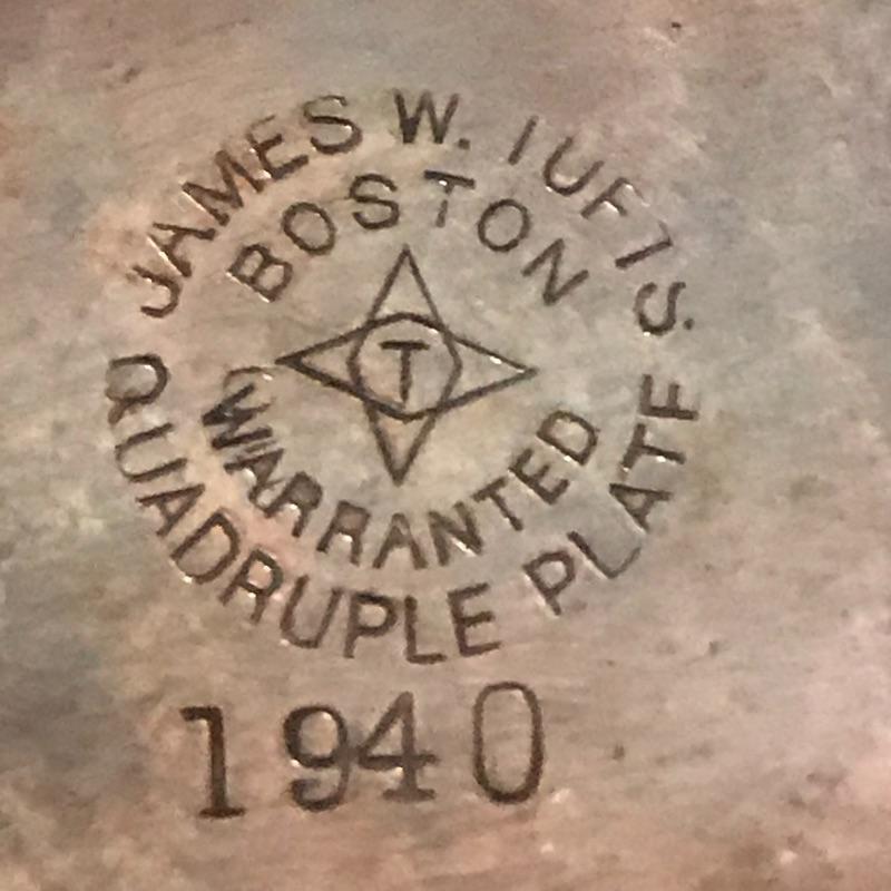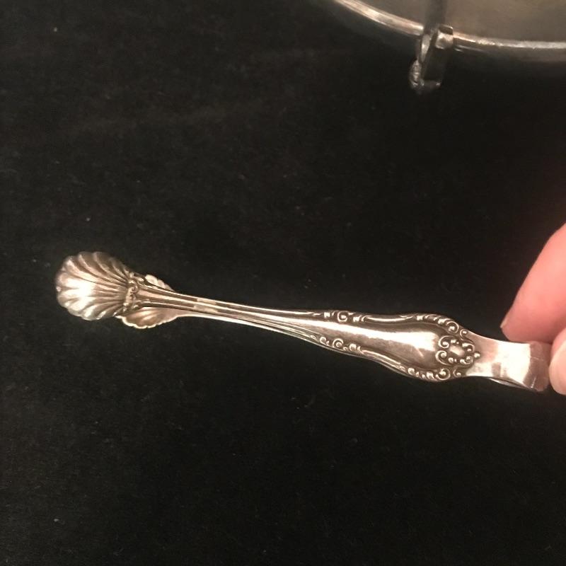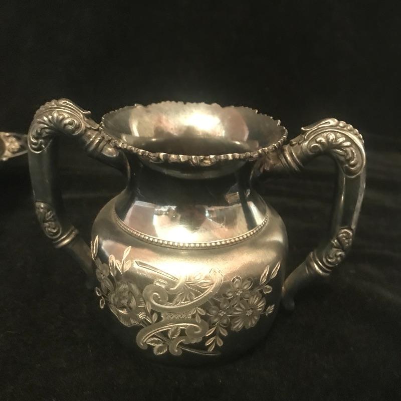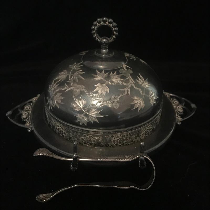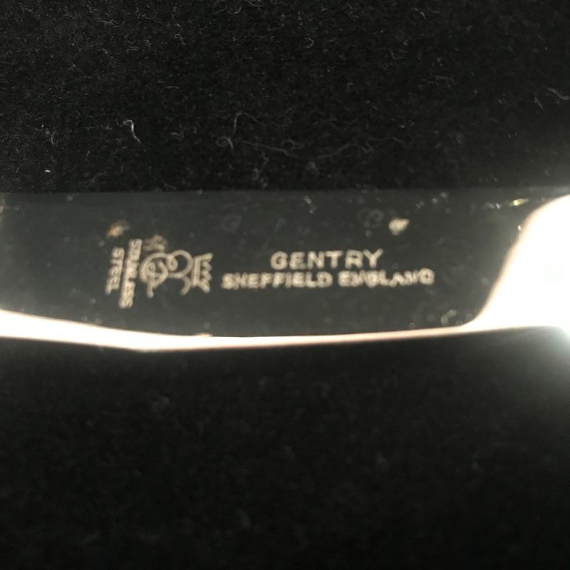 The two silver plate pieces are stamped quadruple plate by different designers but go nicely together. Double handled vase stands 4” tall. Six Gentry Sheffield English steak knives and a sterling J E Caldwell sterling butter knife finish out this lot. Shipping available.