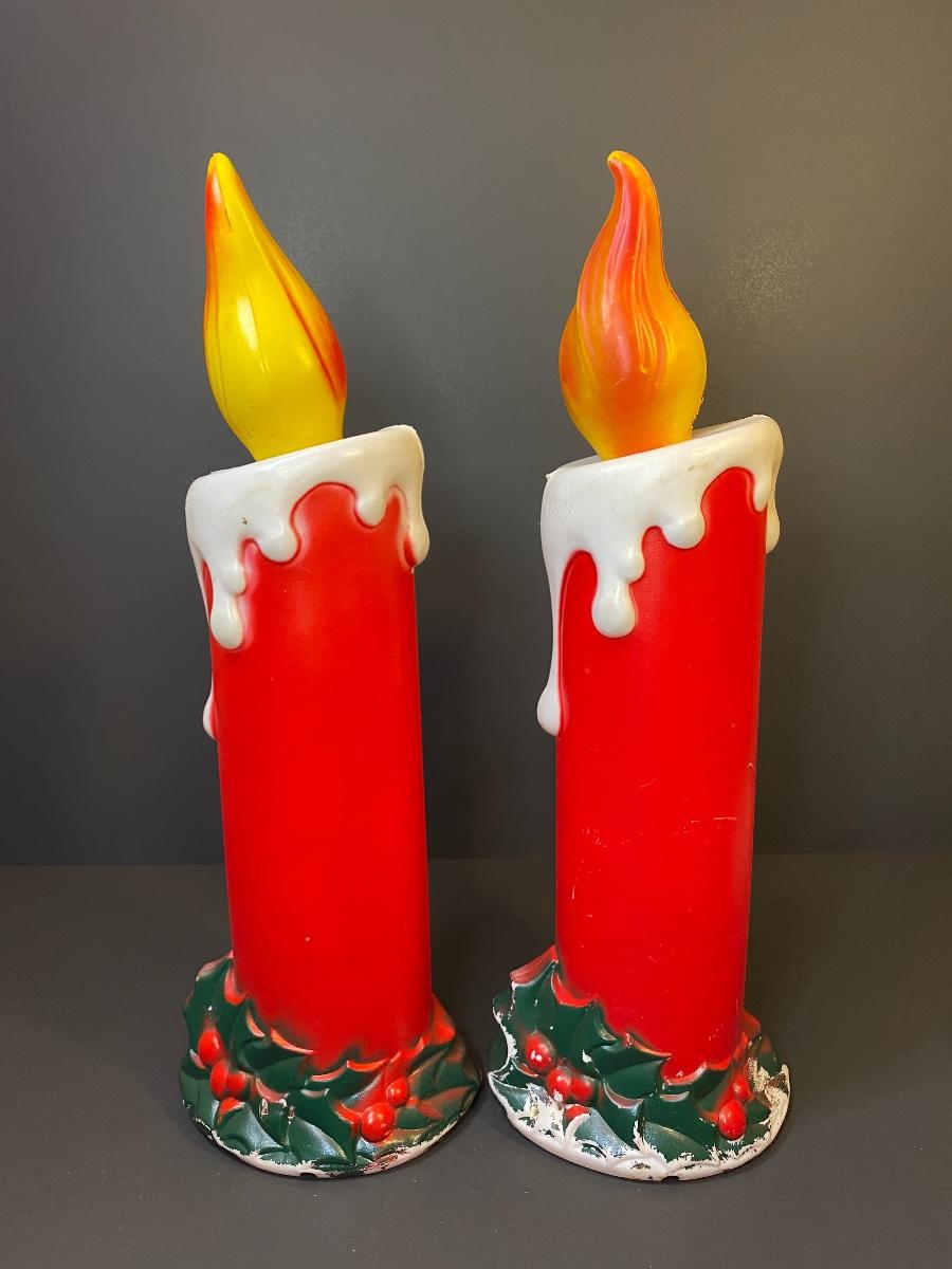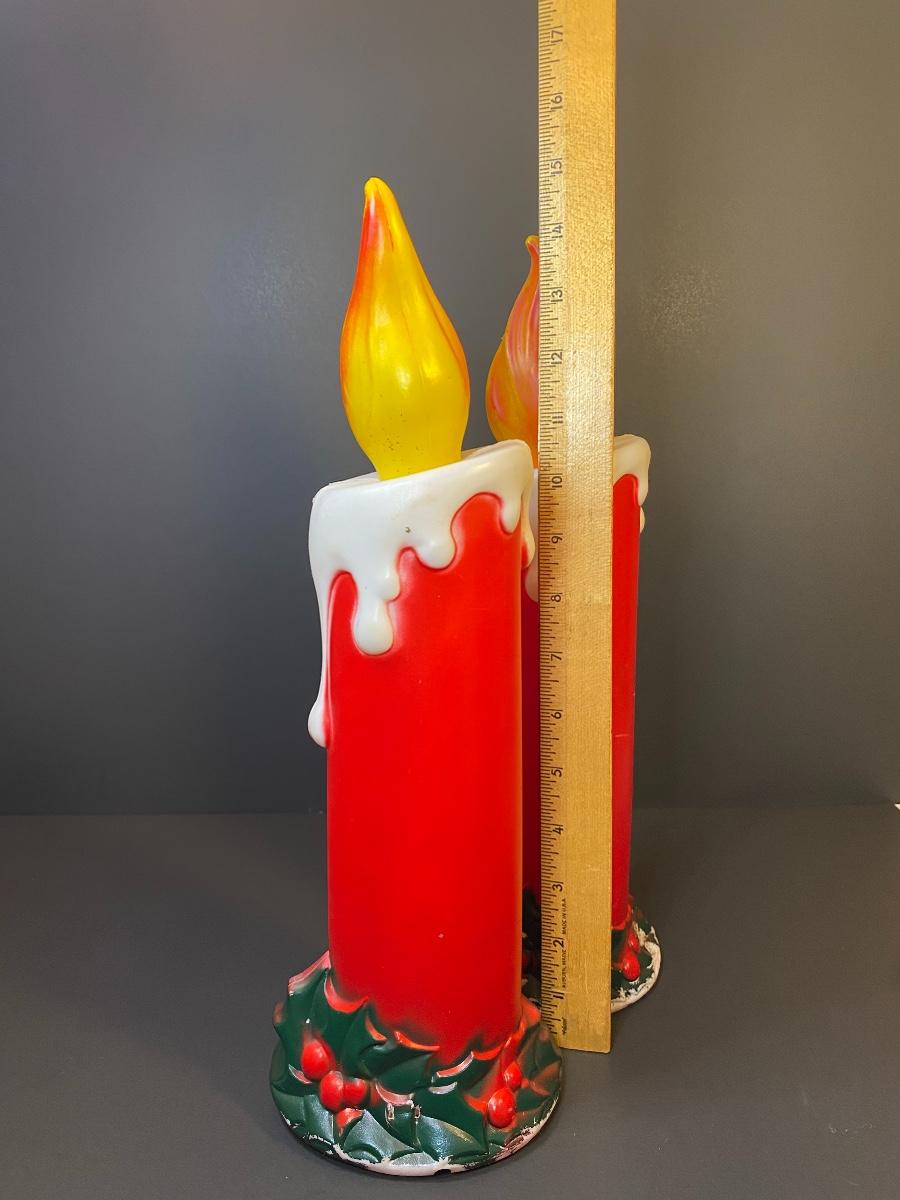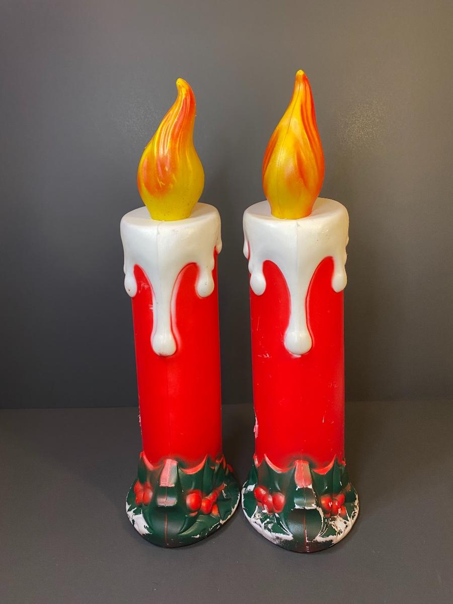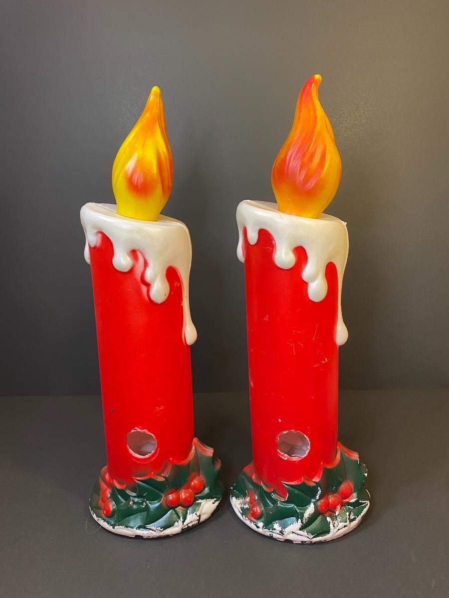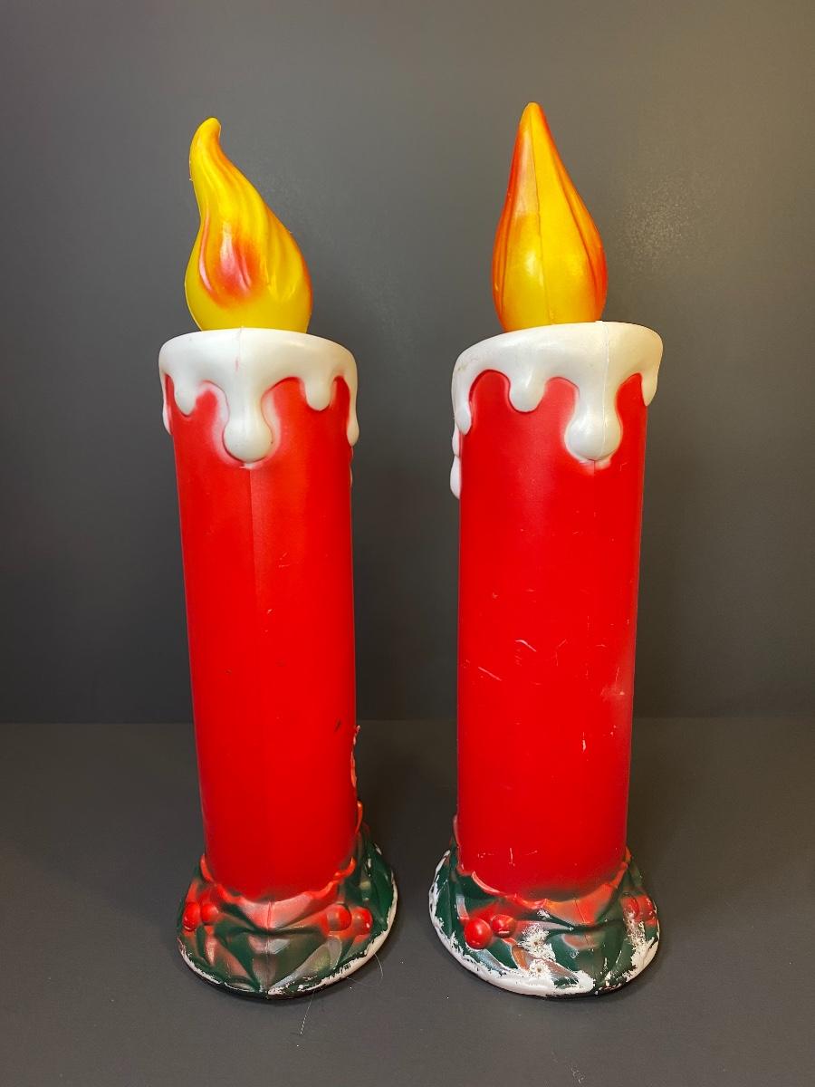 Set of two vintage plastic candles. These have a hole in the back to put a light in, but they do not have a light currently. The pictures show condition, measurements if taken, and what is included in the lot. Due to the large amount that we photograph and the time frame, we are not always able to take measurements. All items unless noted, are pre-owned and have been used, and are untested. Thank you.