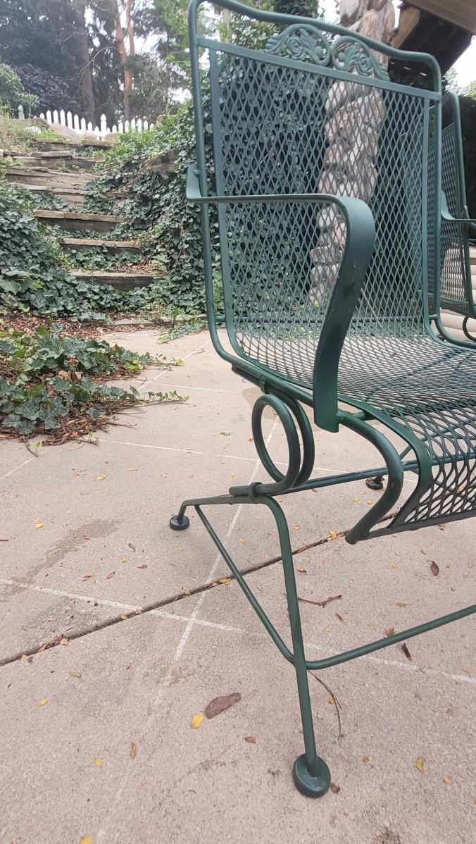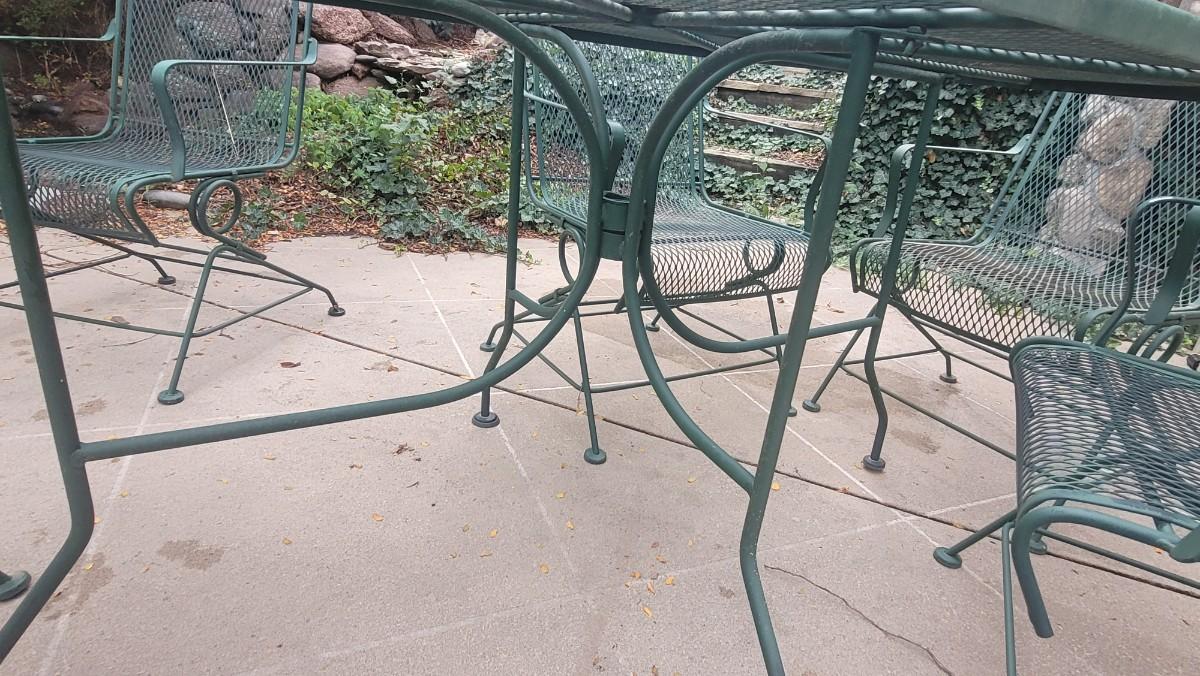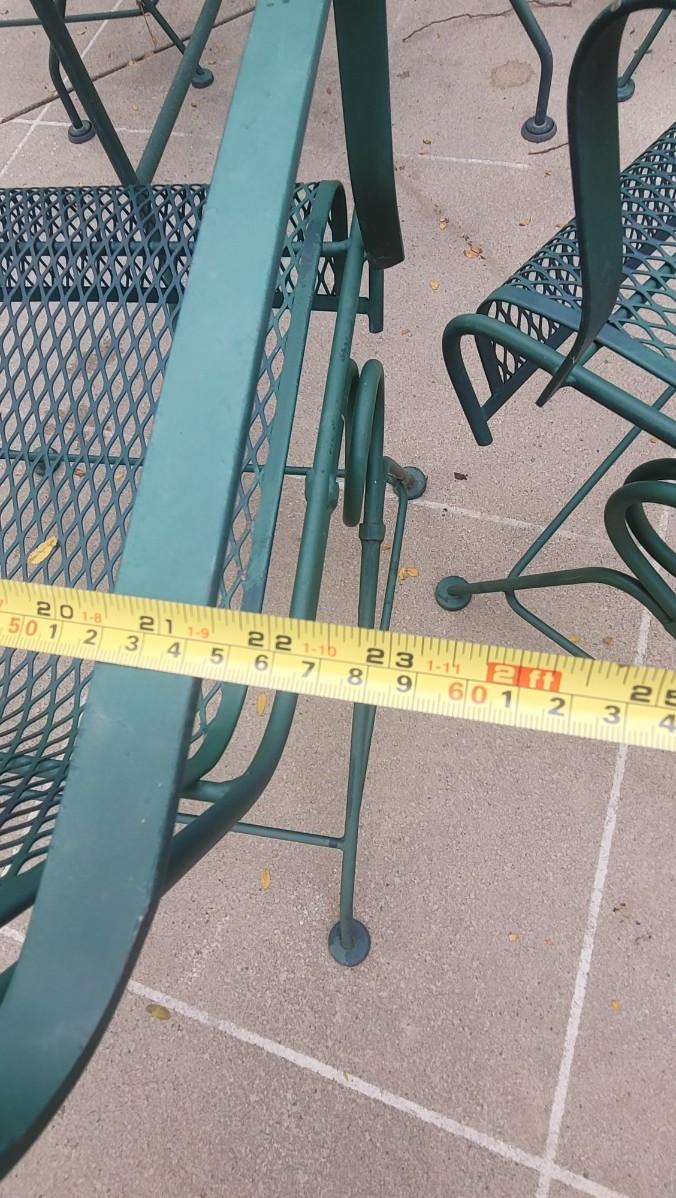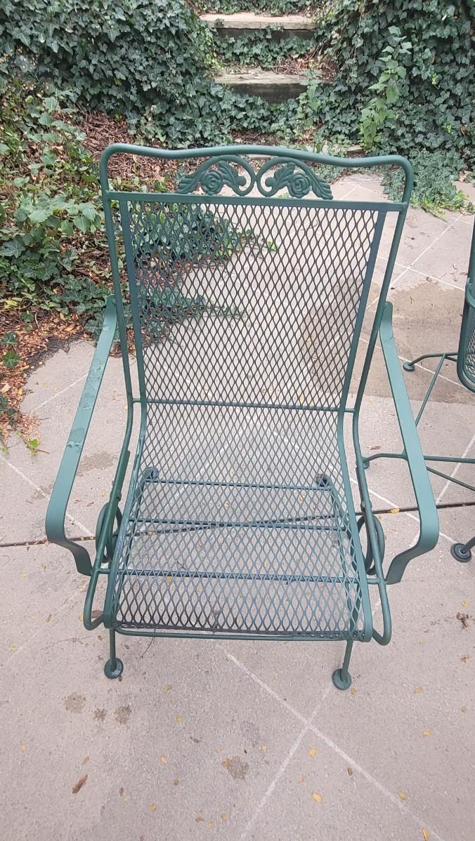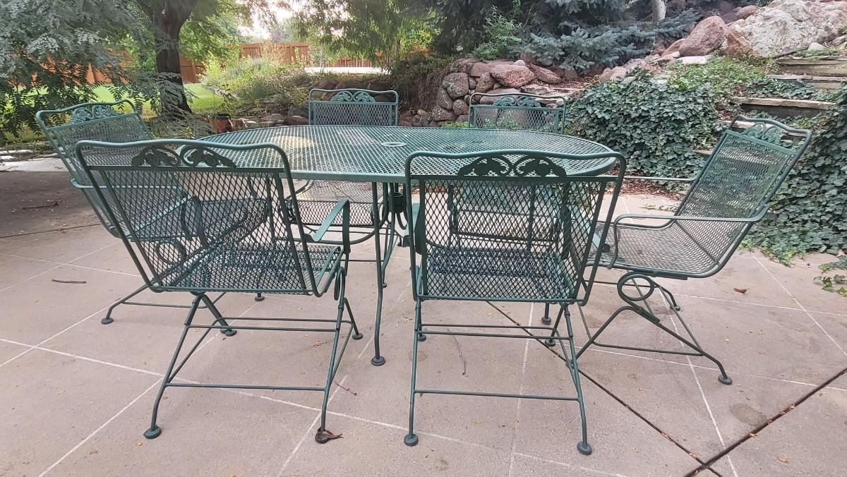Lot 397: Green Metal Oval Patio Table & (6) Bouncer Chairs