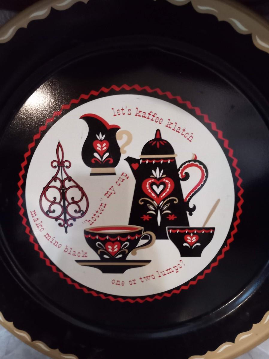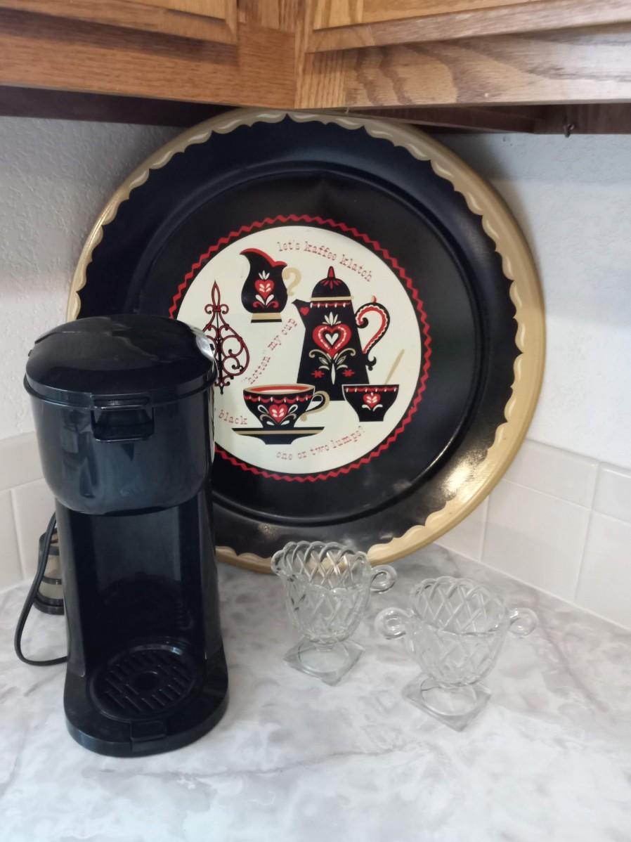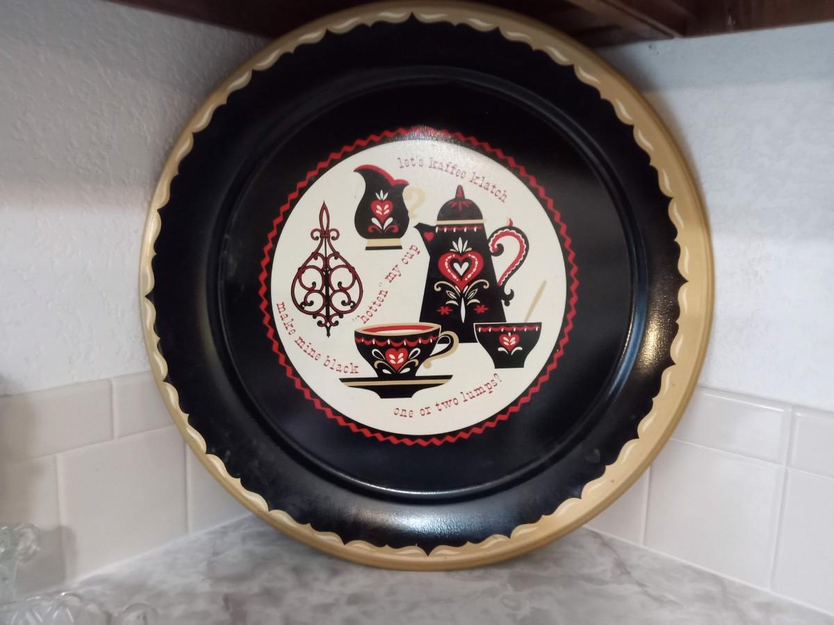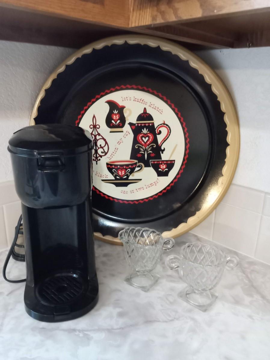 LOT 397  LARGE METAL PLATTER, SINGLE CUP COFFEE MAKER, CREAM AND SUGAR SET