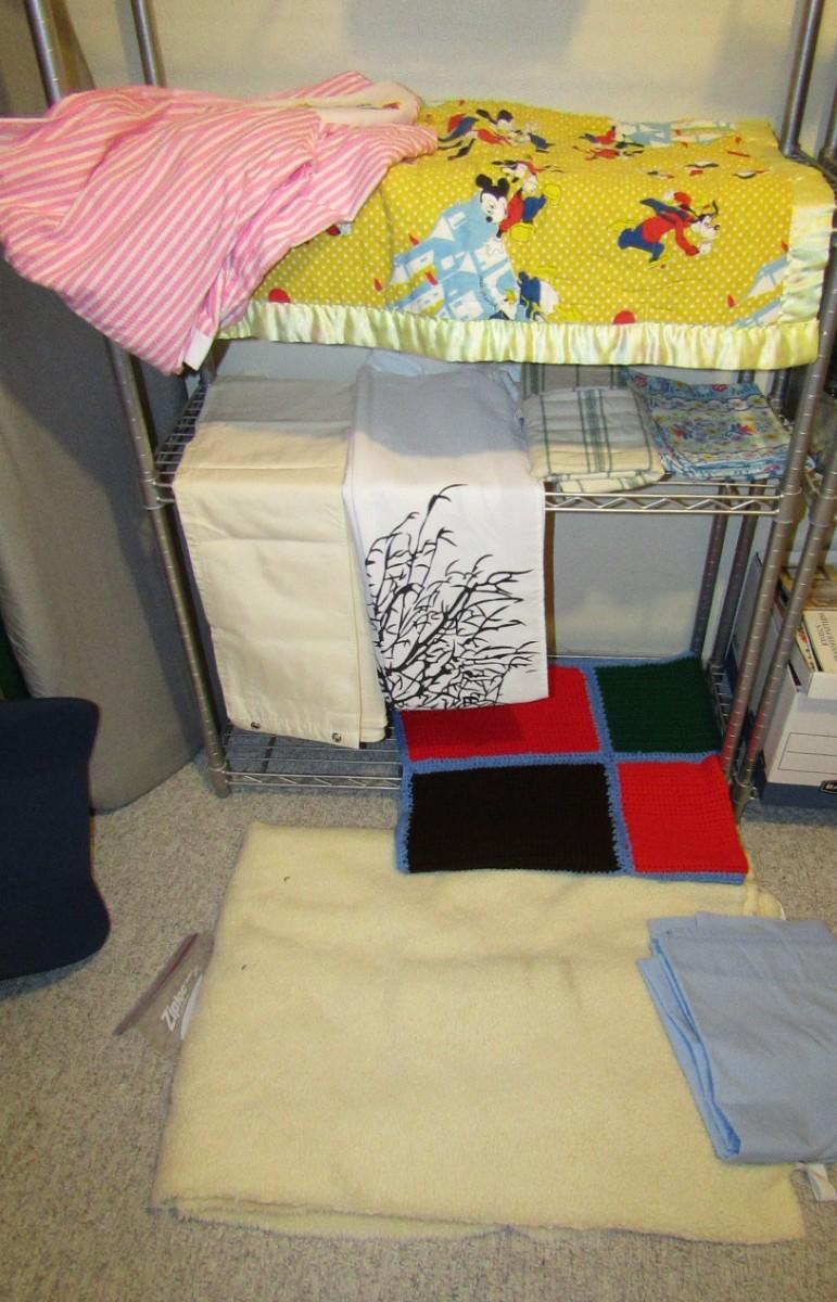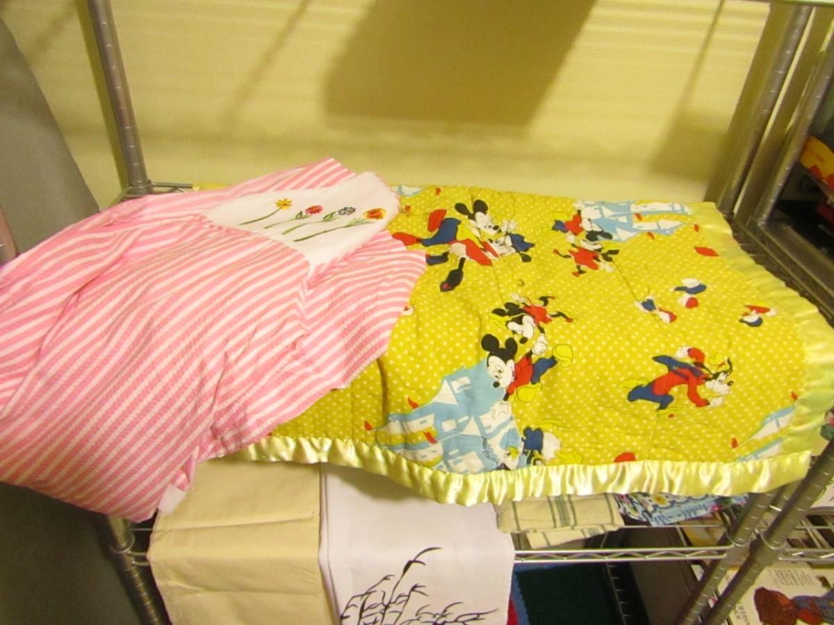 SHOWER CURTAIN AND LINER, CROCHETED THROW BLANKET, SHEEPSKIN LIKE MATTRESS PAD, VINTAGE DISNEY BABY BLANKET, PILLOWCASES, LADIES ROBE, QUEEN SIZE FLAT SHEET