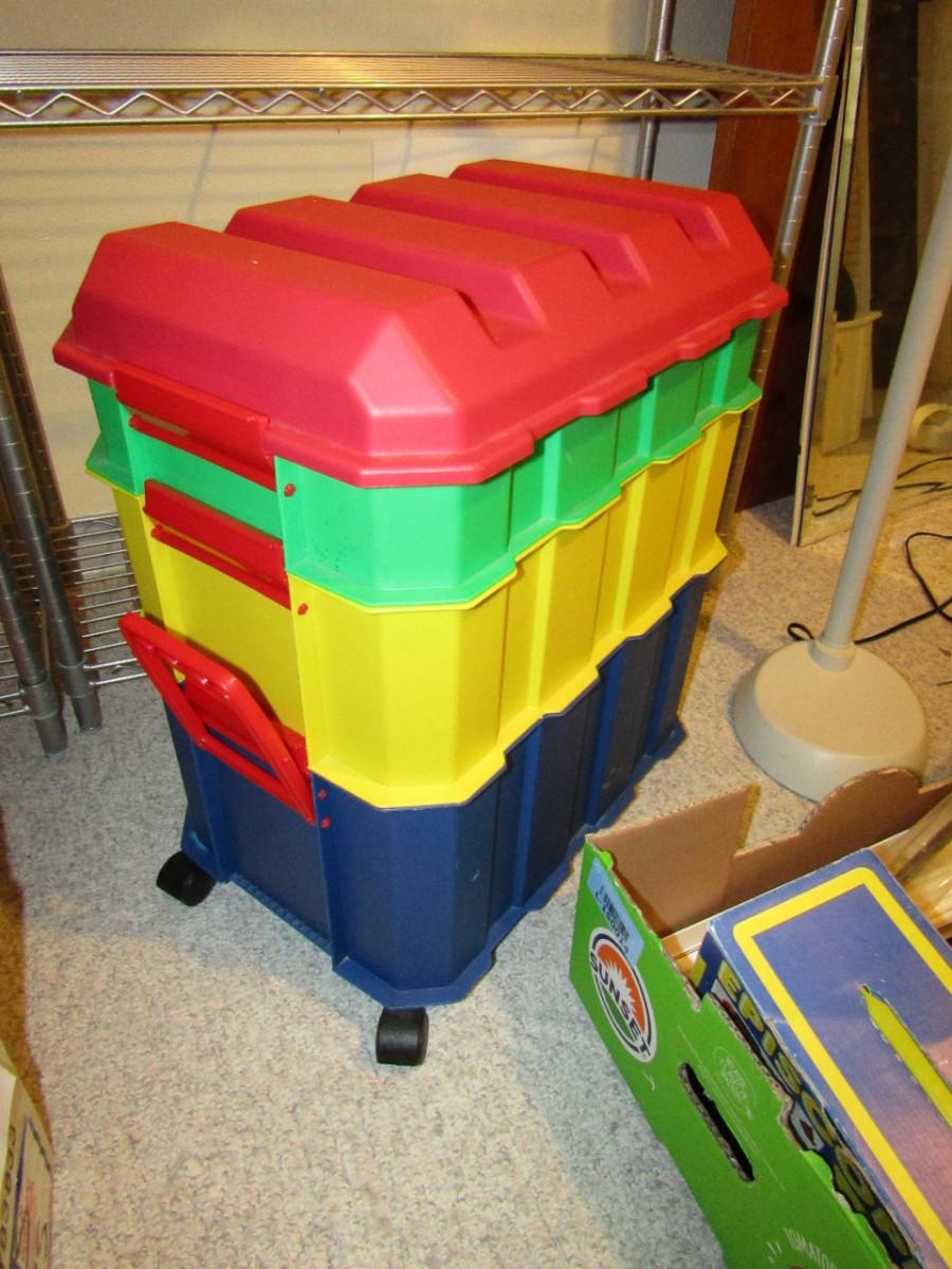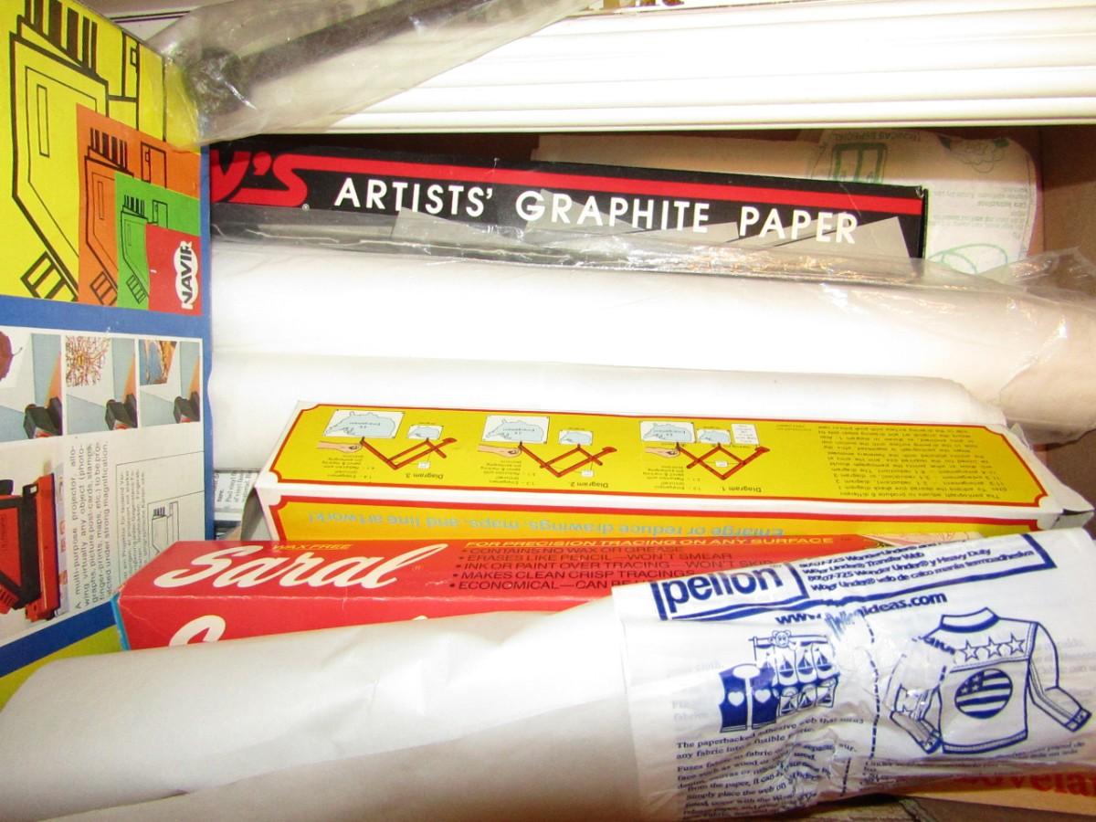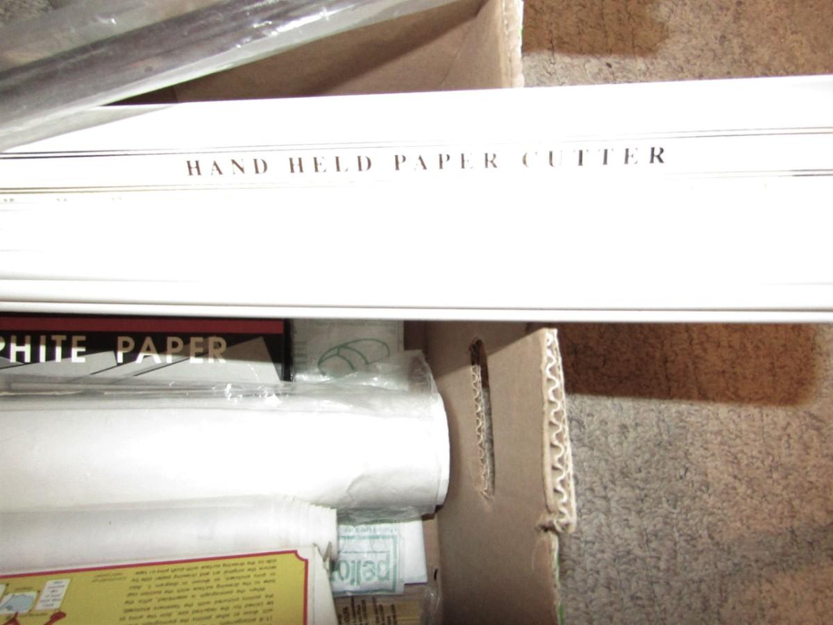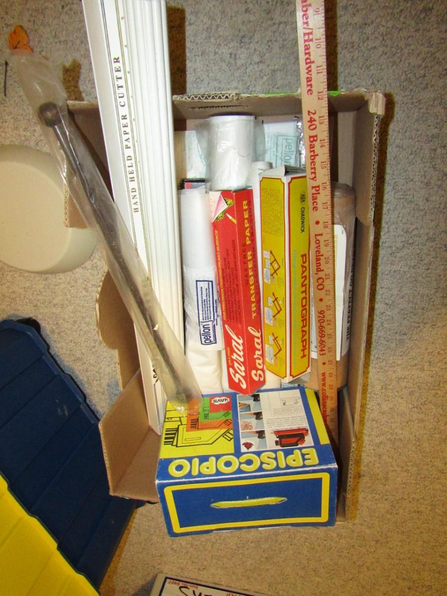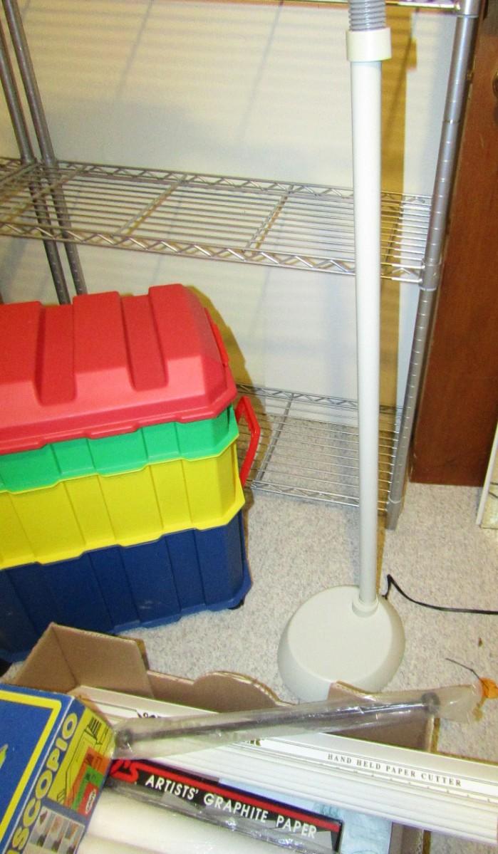 3 COMPARTMENT ORGANIZER ON WHEELS, GOOSENECK FLOOR LAMP, BOX FULL OF A VARIETY OF CRAFT NEEDS