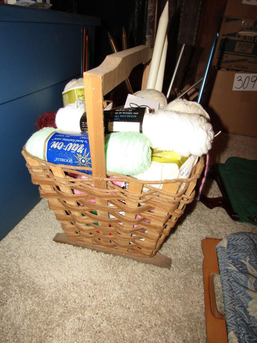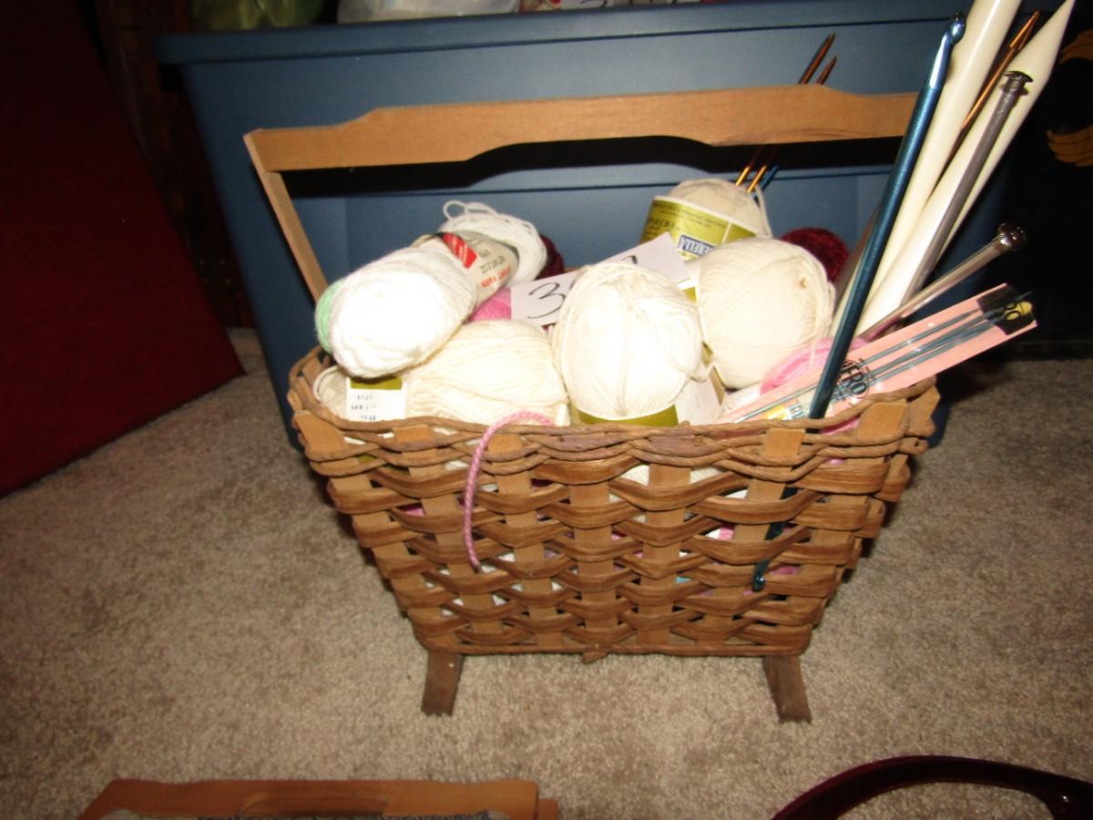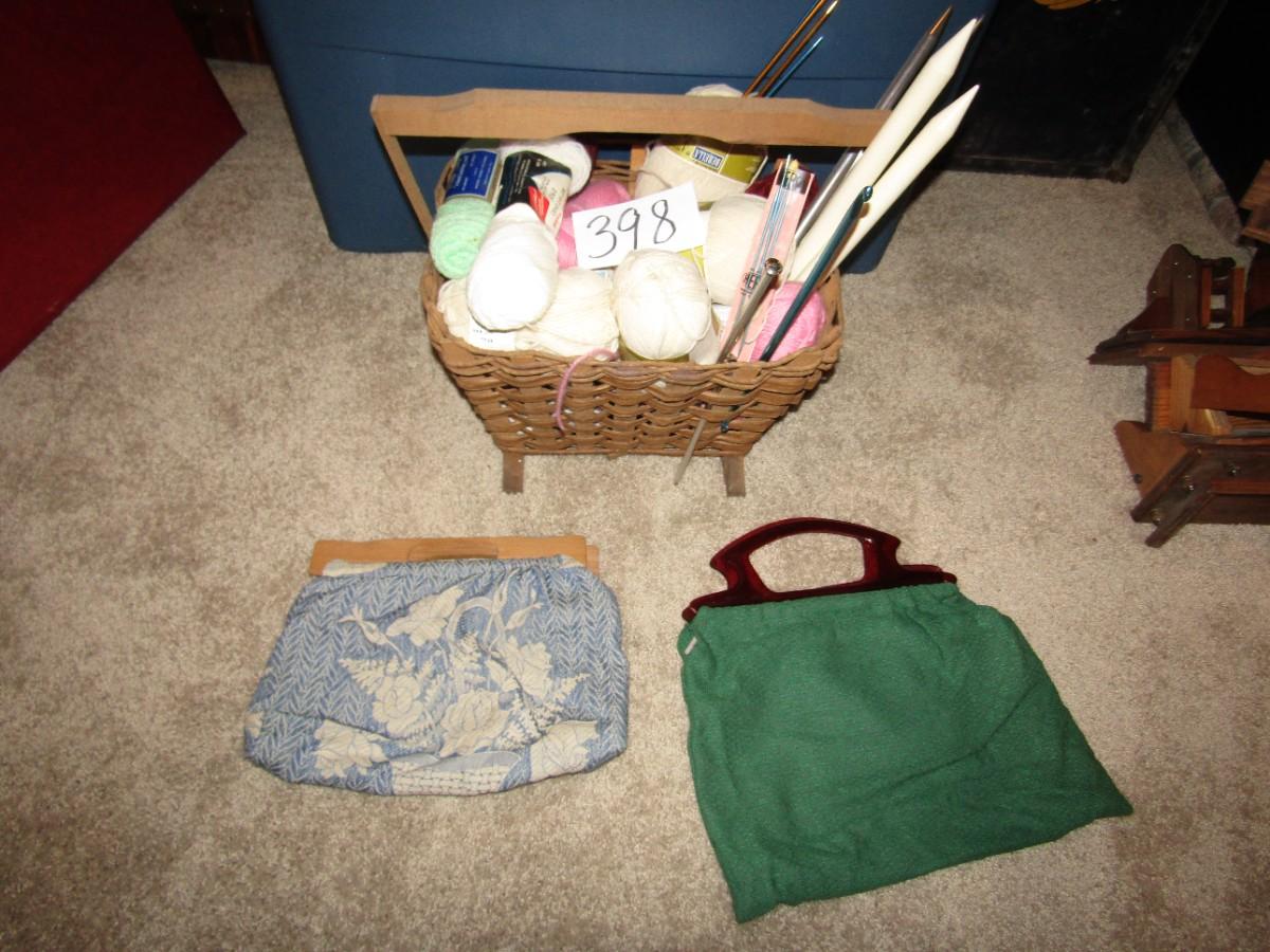 YARN, KNITTING NEEDLES, 2 VINTAGE CLOTH BAGS, KNITTING BASKET