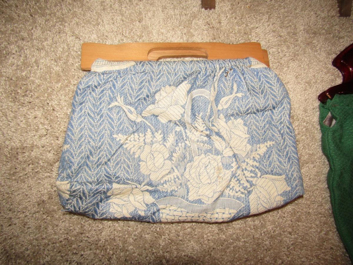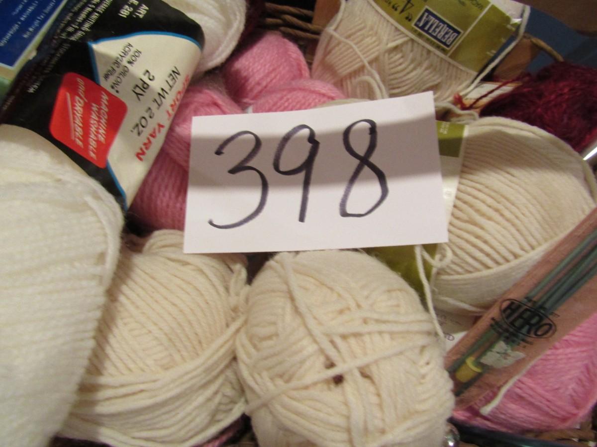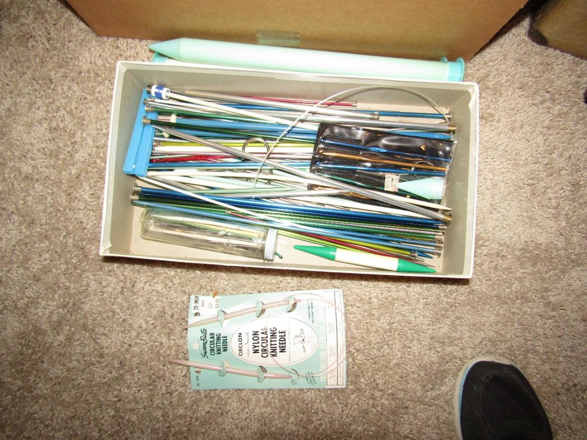 YARN, KNITTING NEEDLES, 2 VINTAGE CLOTH BAGS, KNITTING BASKET