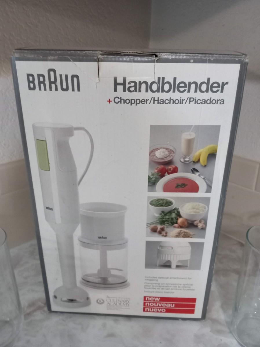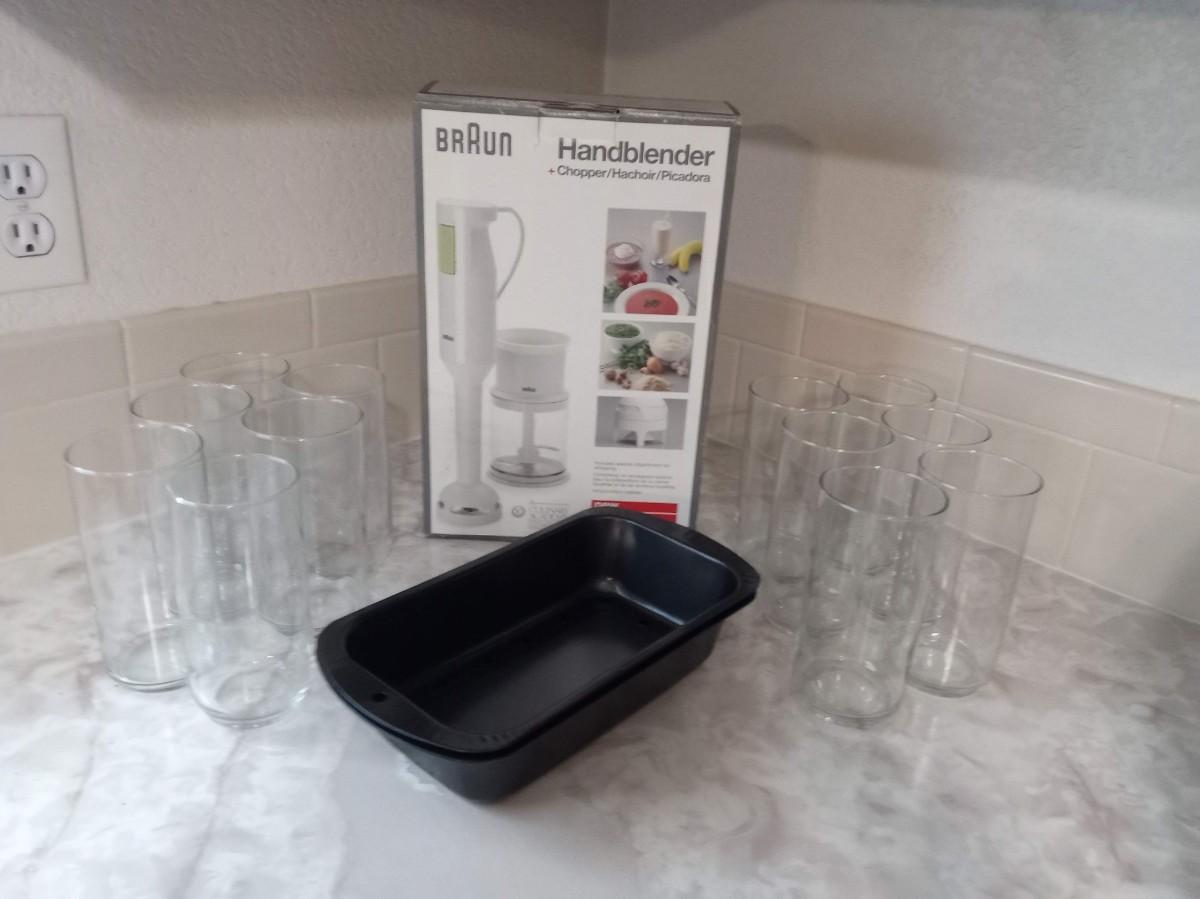 LOT 399 BRAUN HAND BLEND, TEFLON LOAF PAN AND 12 DRINKING GLASSES