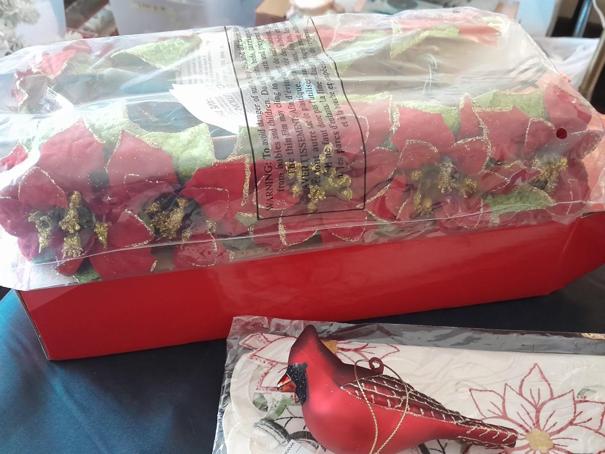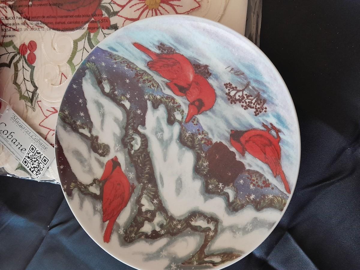 MALE AND FEMALE CARDINAL ORNAMENTS WITH CARDINAL TABLE RUNNER, CARDINAL PLATE, AND POINTSETTIA GARLAND