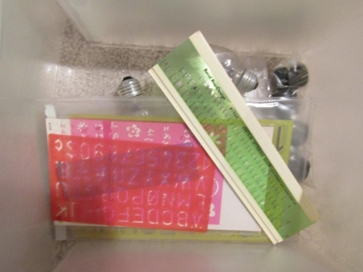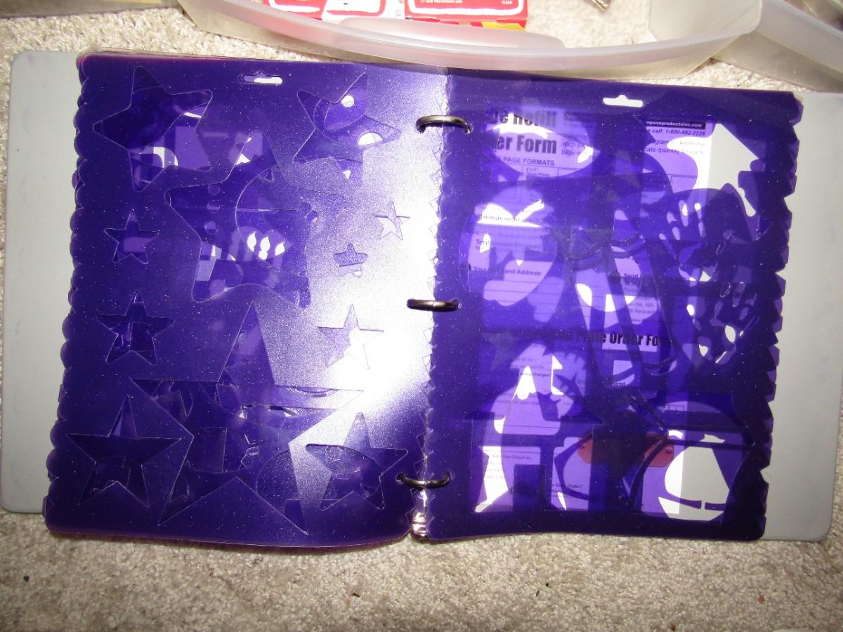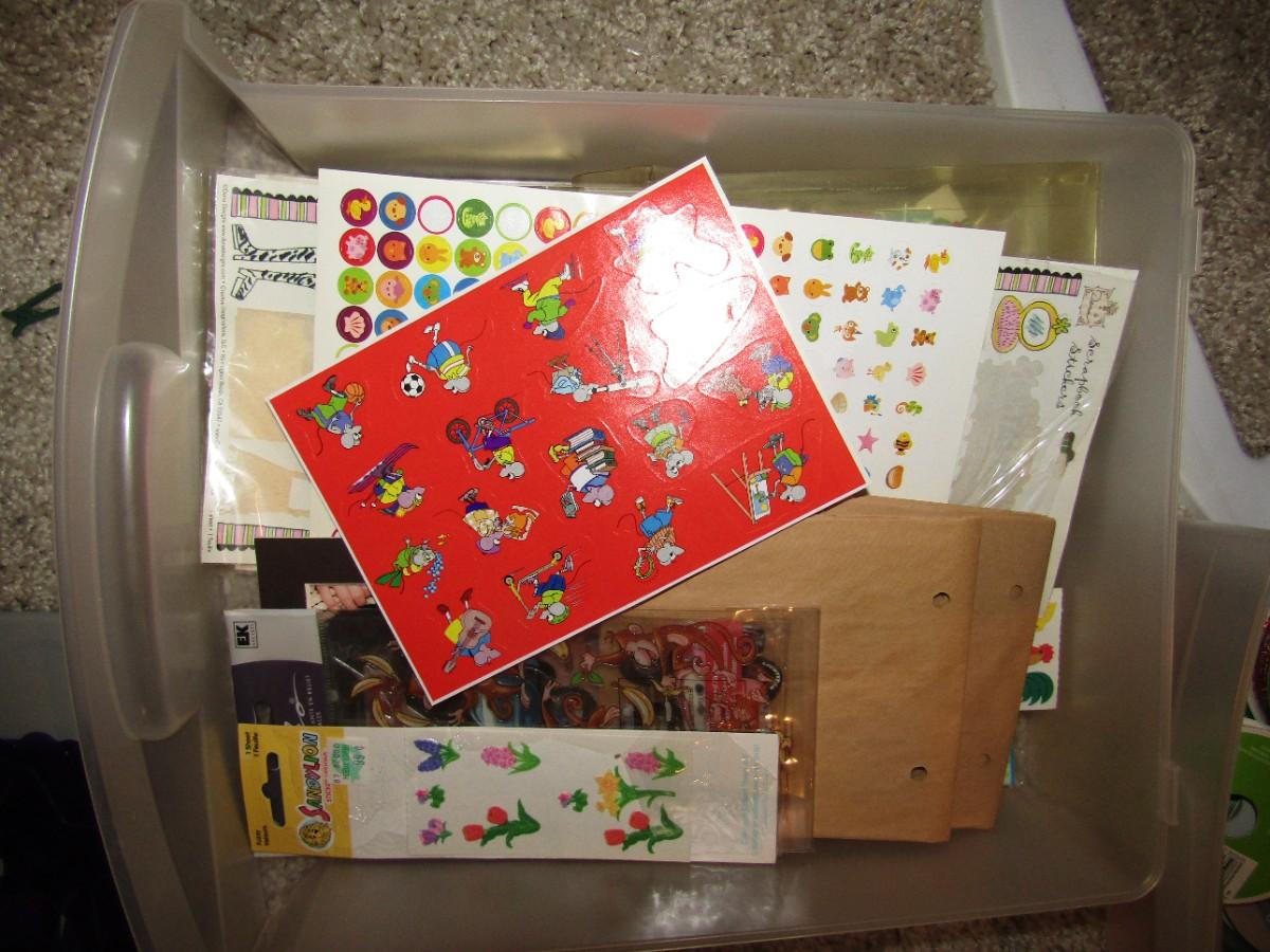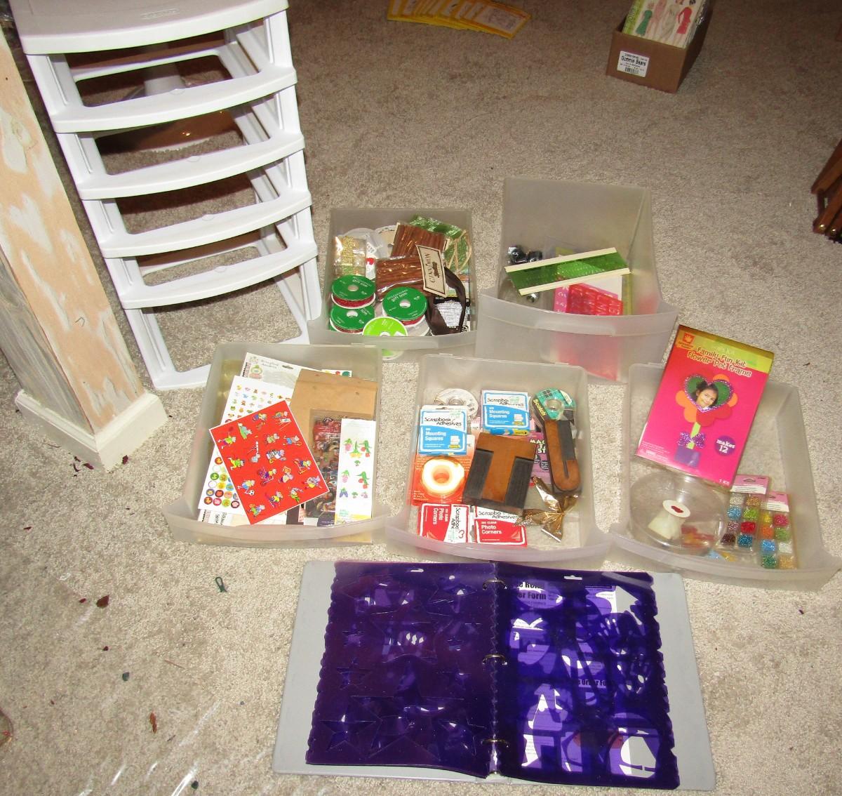 5 DRAWER PLASTIC ORGANIZER WITH ALL 5 DRAWERS FILLED WITH STICKER, RIBBON, 3 RING BINDER FULL OF STENCILS AND MUCH MORE