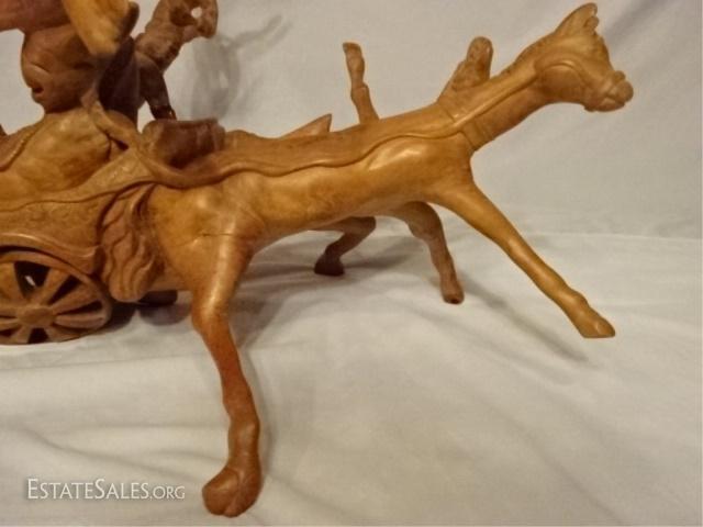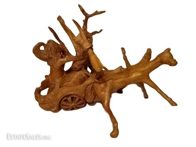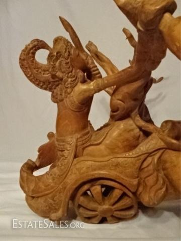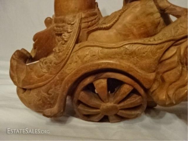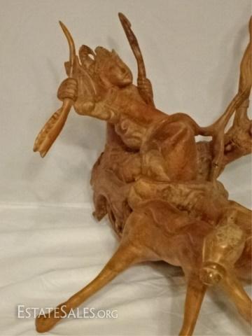 LOT 39D: LARGE ASIAN TEAK ROOT SCULPTURE, WARRIORS ON CHARIOT WITH ANIMALS, CARVED FROM A SINGLE ROOT, REPAIR TO ARM, 27"D X 27"W X 21"H