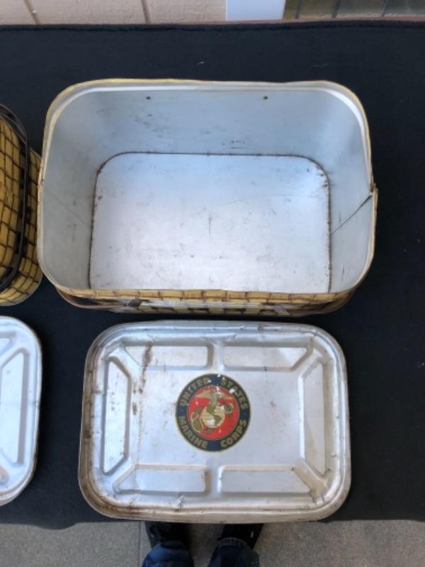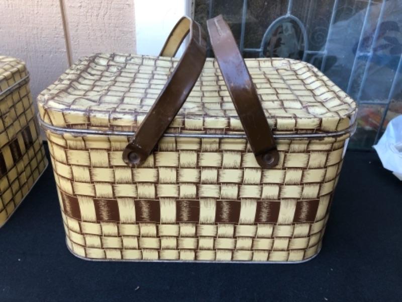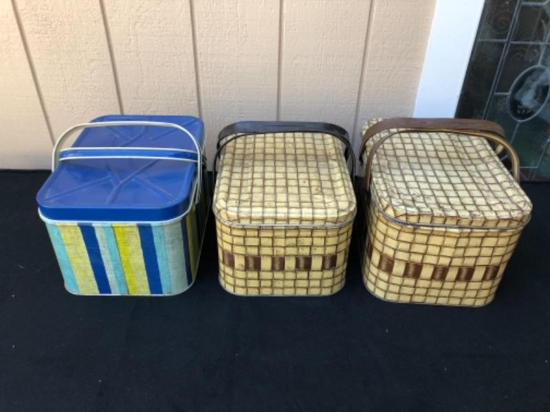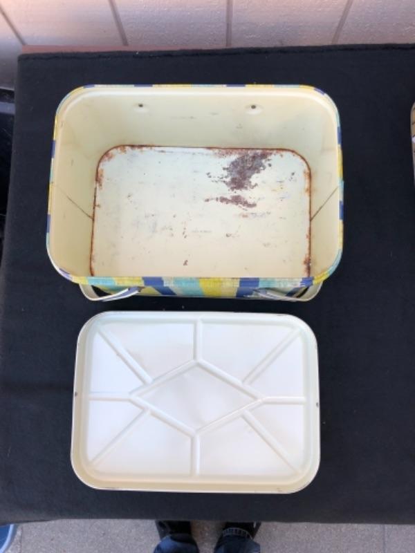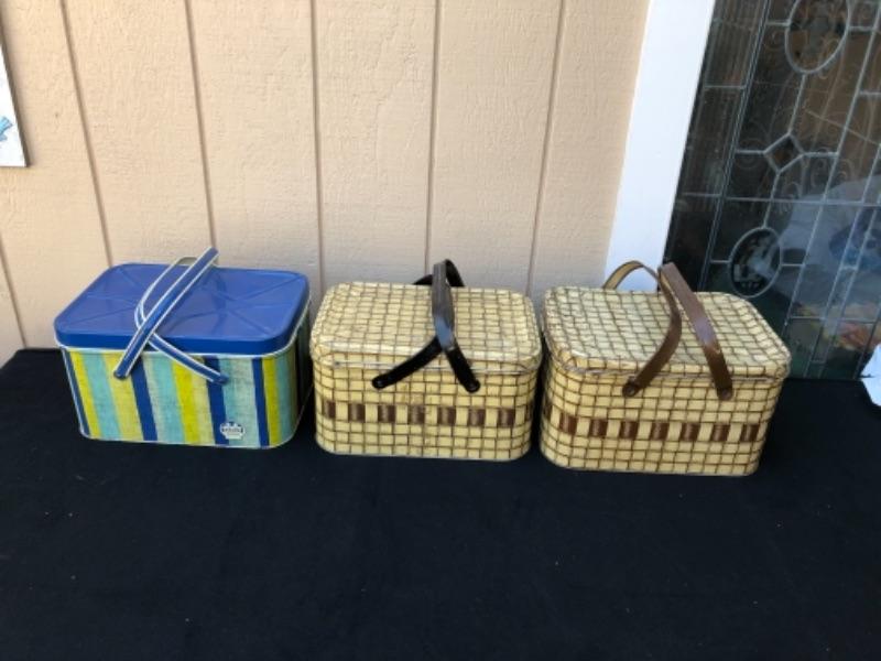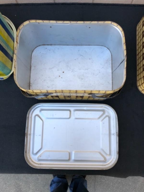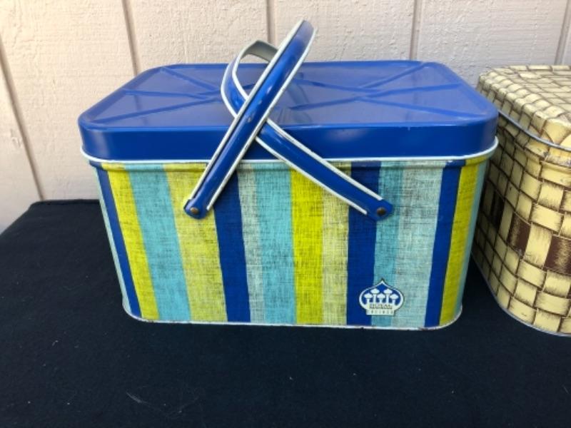 Lot 3DM. 3 Vintage Midcentury Tin Litho Pic-Nic Lunch Box with Metal Handles: Blue, Yellow Stripe, Basket Weave Pattern, 1950’s (# 94, 214, 312) “” $32.50