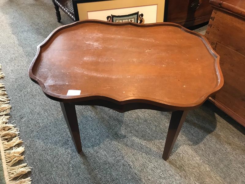 Very nicely hand crafted walnut tray stand. Has tapered legs and serpentine shaped top to fit an antique tole tray. Also makes an nicely shaped coffee table as is. 20" x 27" x 19" H