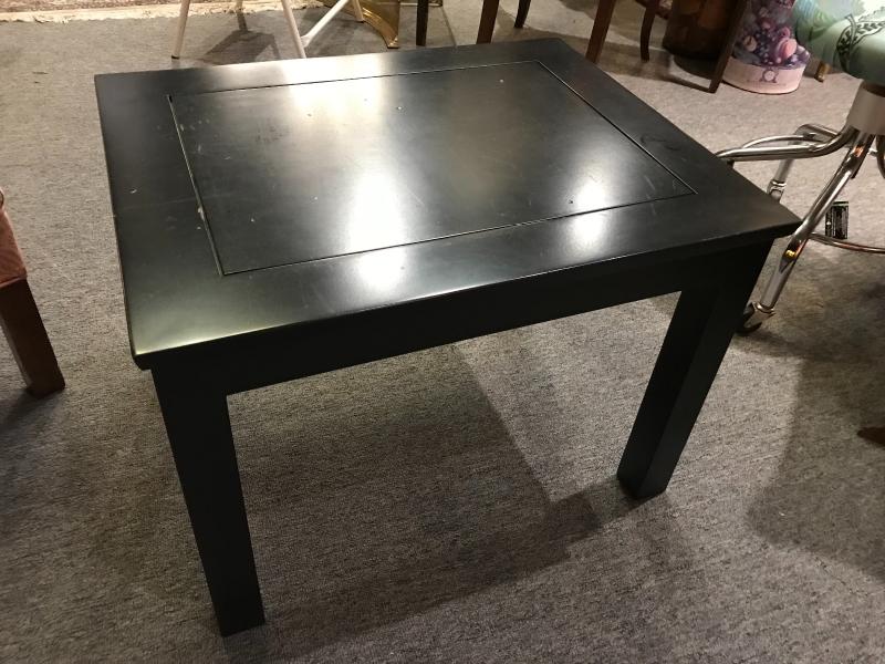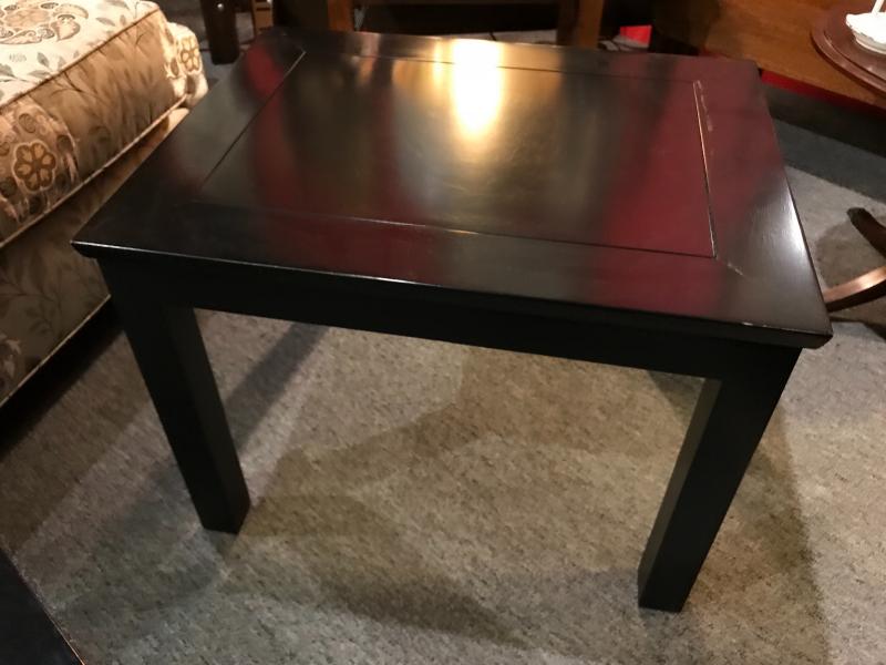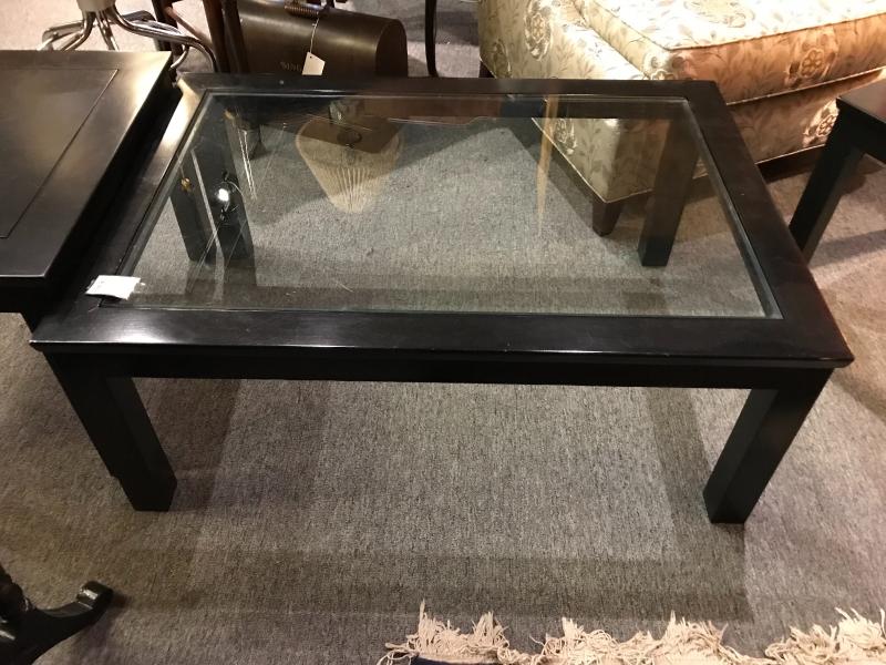 Solid wood. Square legs. Coffee table has glass inset top, end tables have solid wood tops. Black laquer finish. End tables- 19" x 24" x 18" H Coffee table 40" x 28" x 16" H