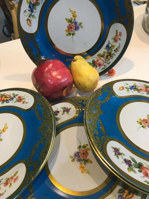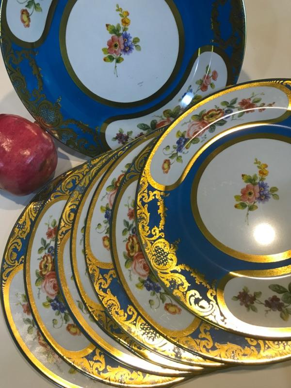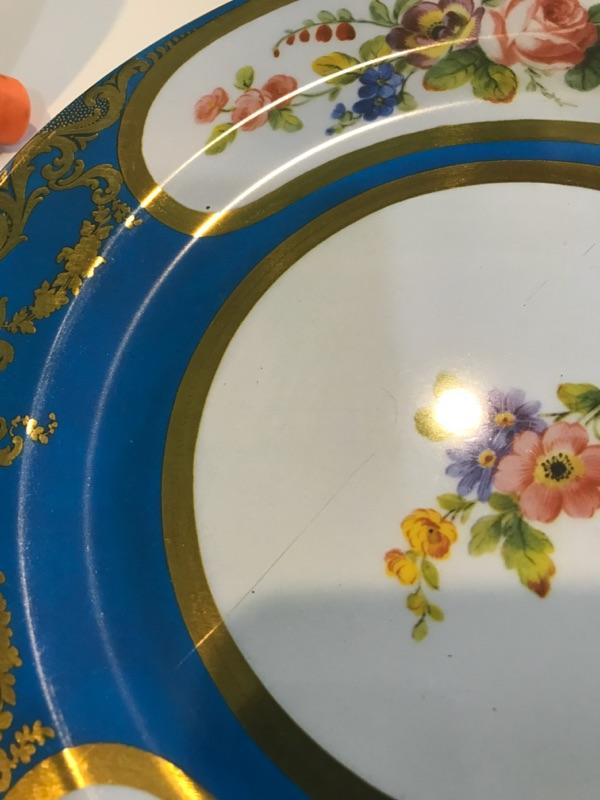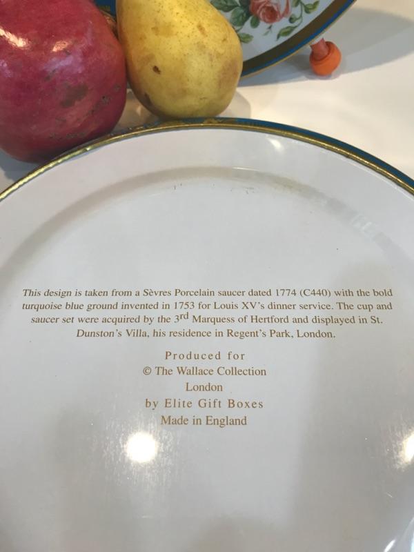 This 10" plate with a turquoise blue back ground, was taken from a Sevres Porcelain saucer dated 1774 for Louis XV's dinner service. Made by Elite Gift Boxes England