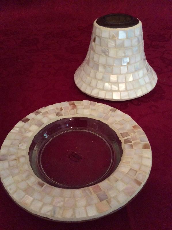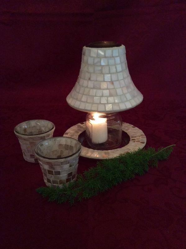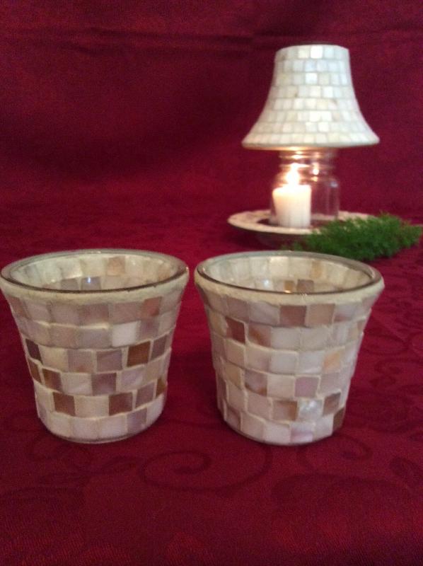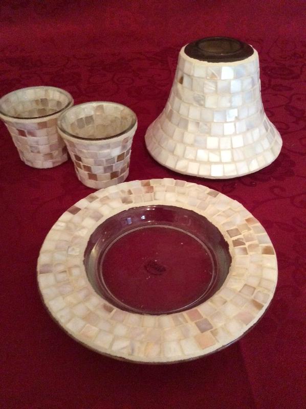 Mosaic shade that fits on a Yankee Candle base, two votive holders and one candle tray. All match!
