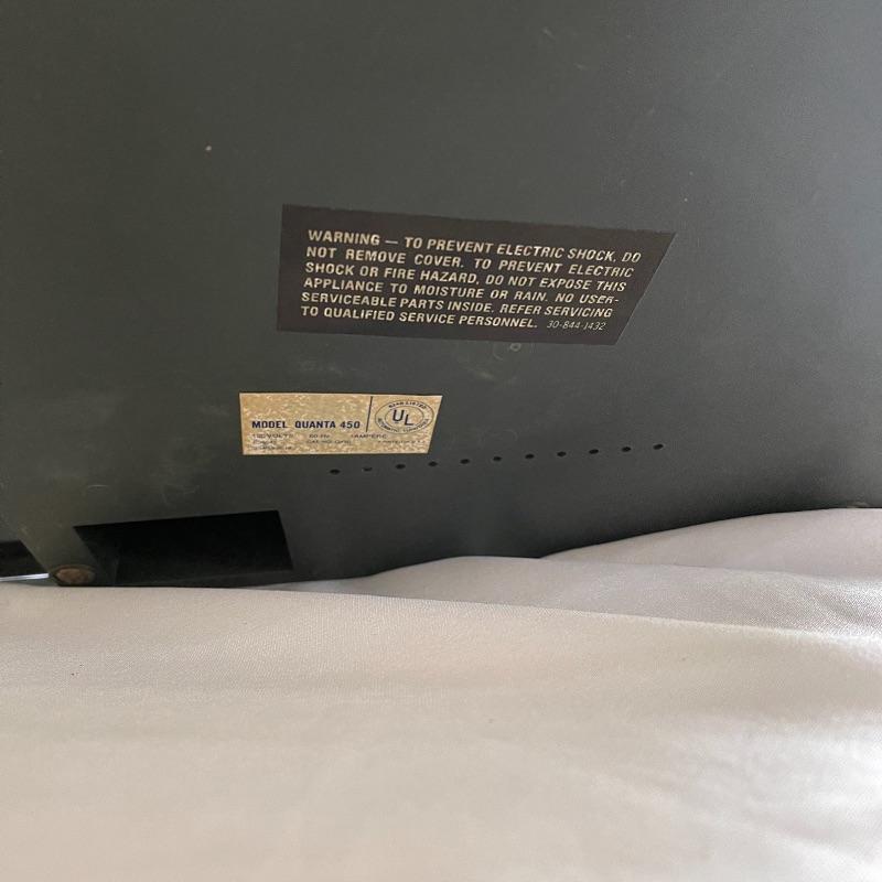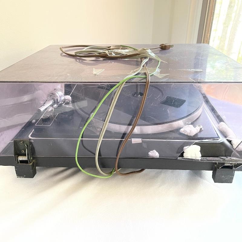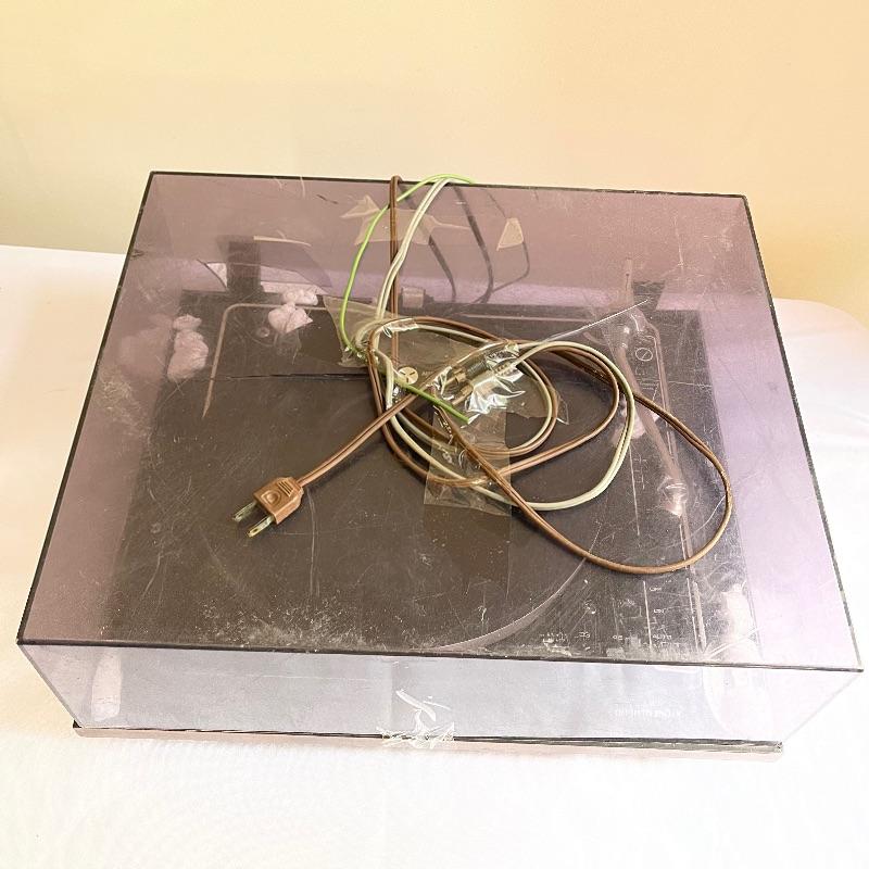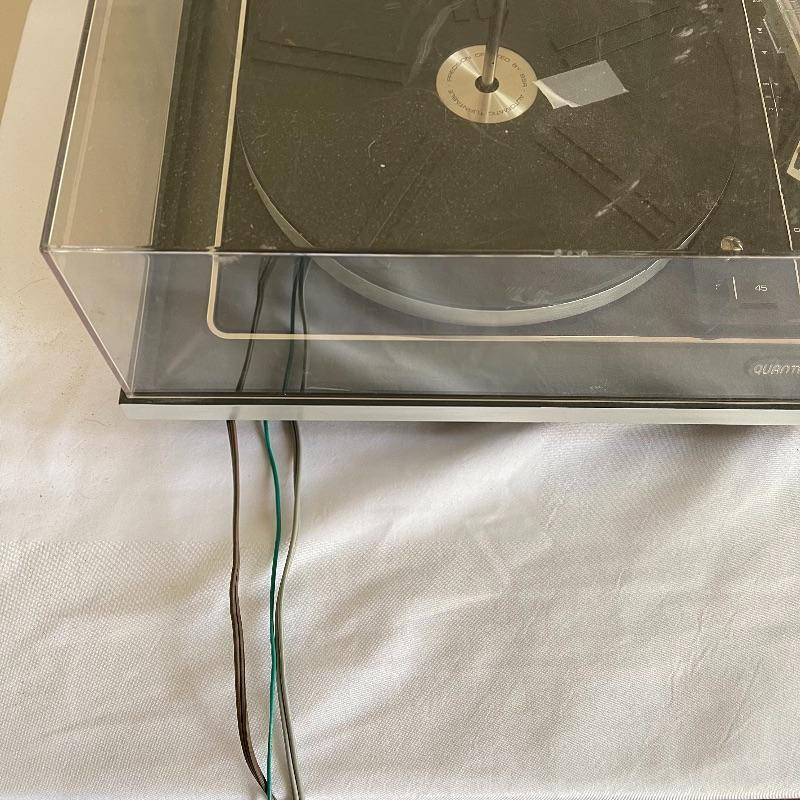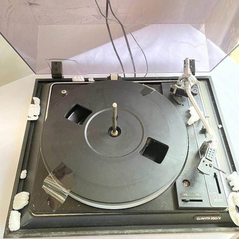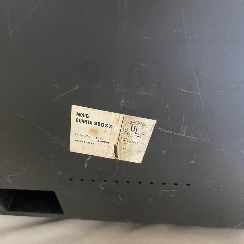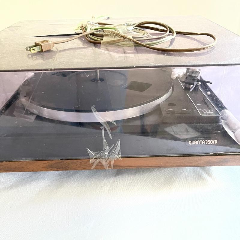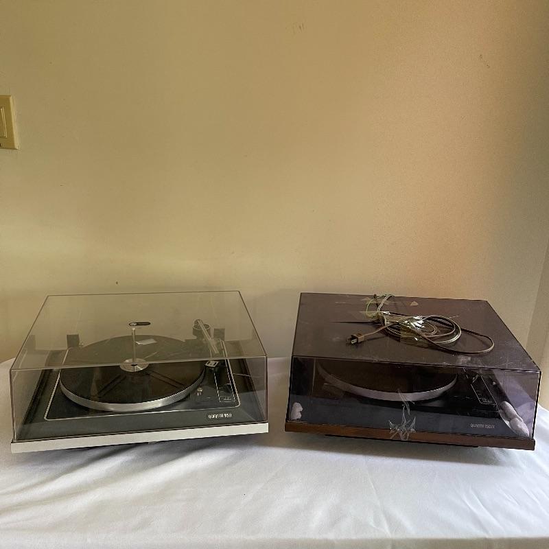 Pair of Quanta complete record player units, one is a Quanta 450 and the other is a Quanta 350SX model. The 450 model has some scuffing on the lid but seemingly in good shape. The 350SX model has cracking in multiple places on the lid. Both units have attached cords and wires which have been pictured. The turntable on the right in the pic did power on when tested.