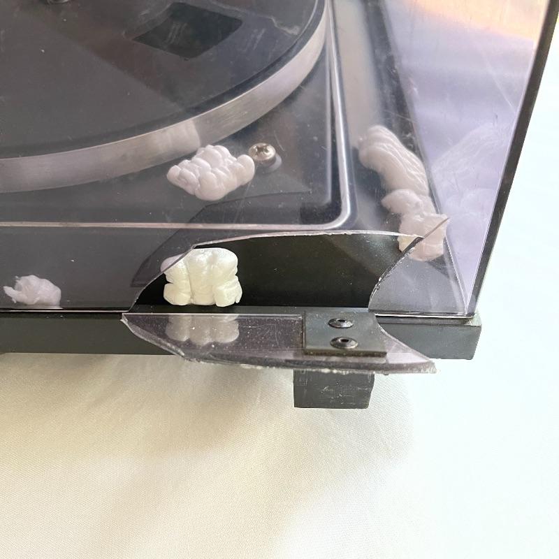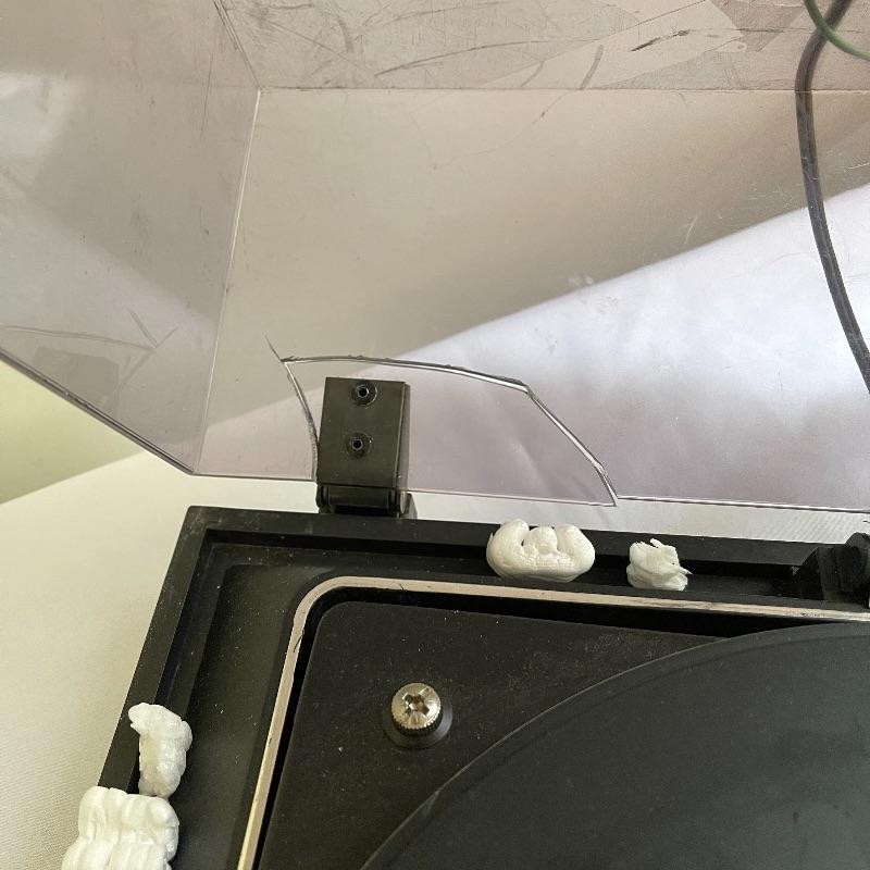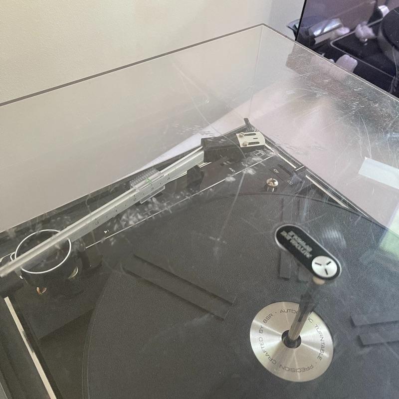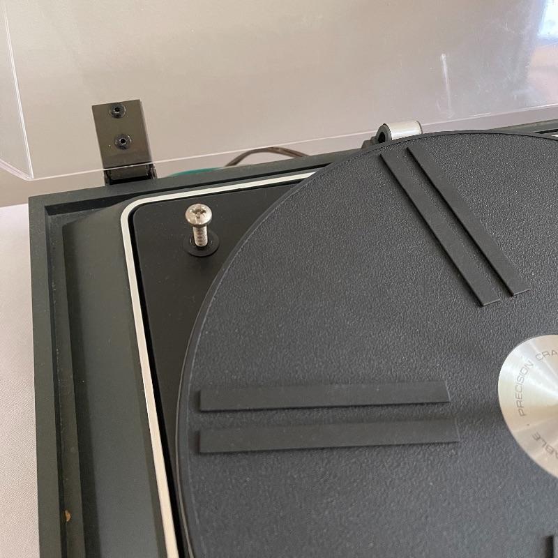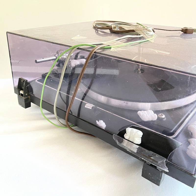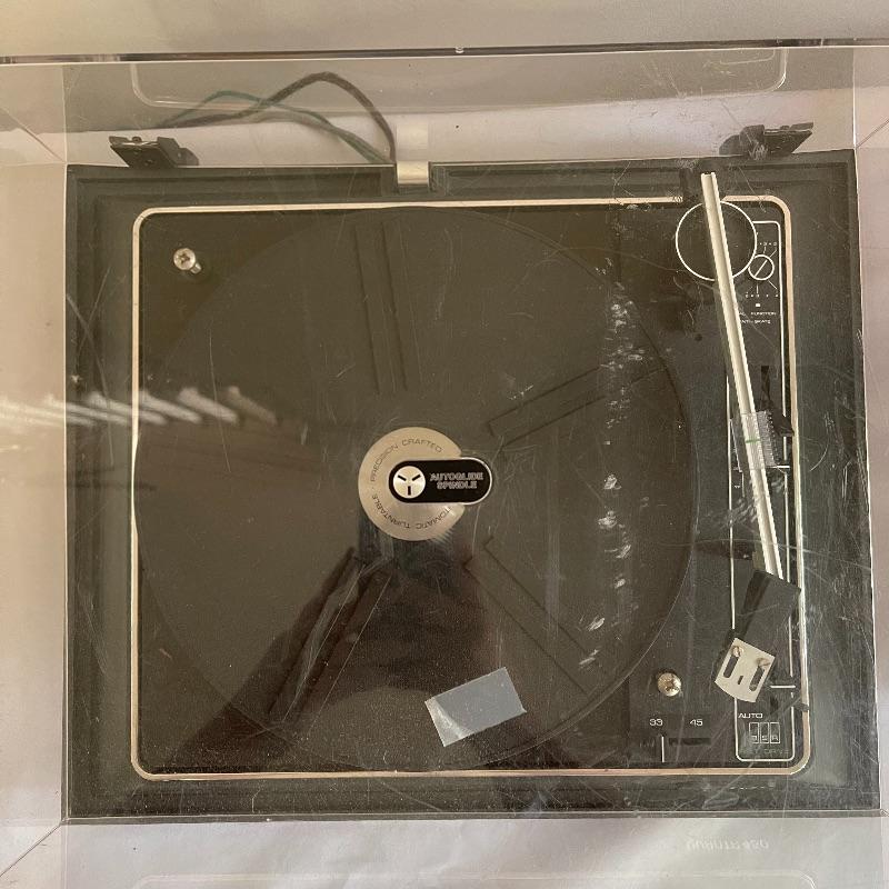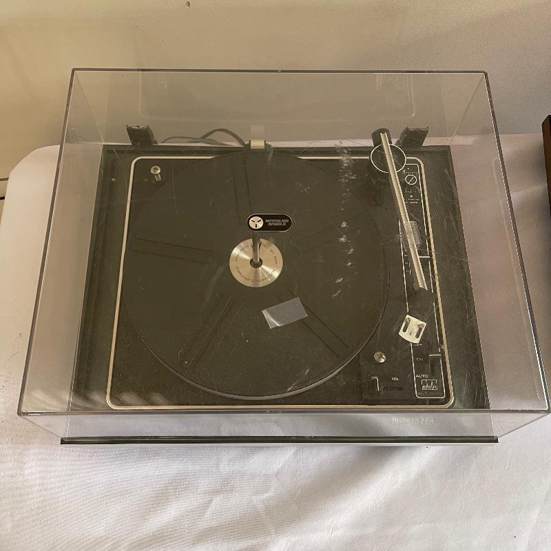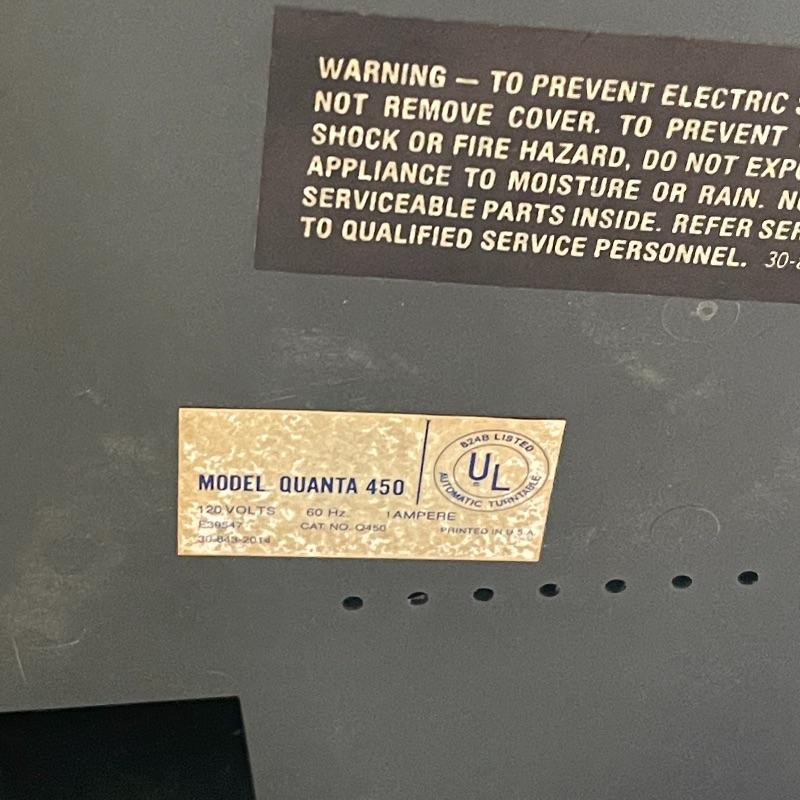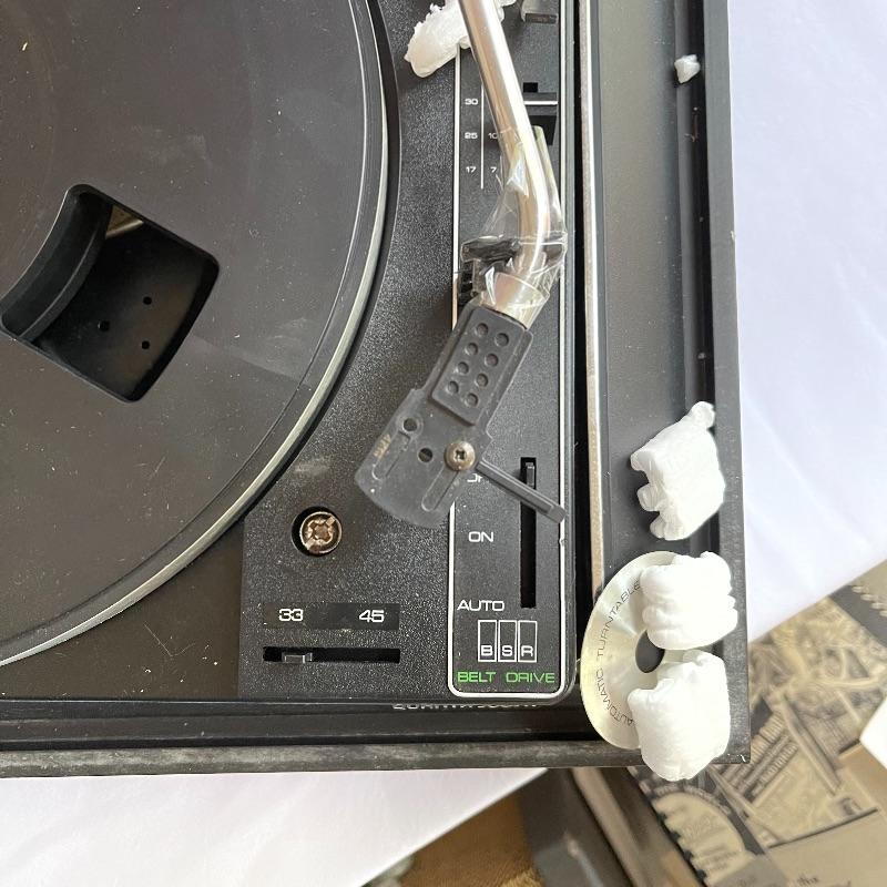 Pair of Quanta complete record player units, one is a Quanta 450 and the other is a Quanta 350SX model. The 450 model has some scuffing on the lid but seemingly in good shape. The 350SX model has cracking in multiple places on the lid. Both units have attached cords and wires which have been pictured. The turntable on the right in the pic did power on when tested.