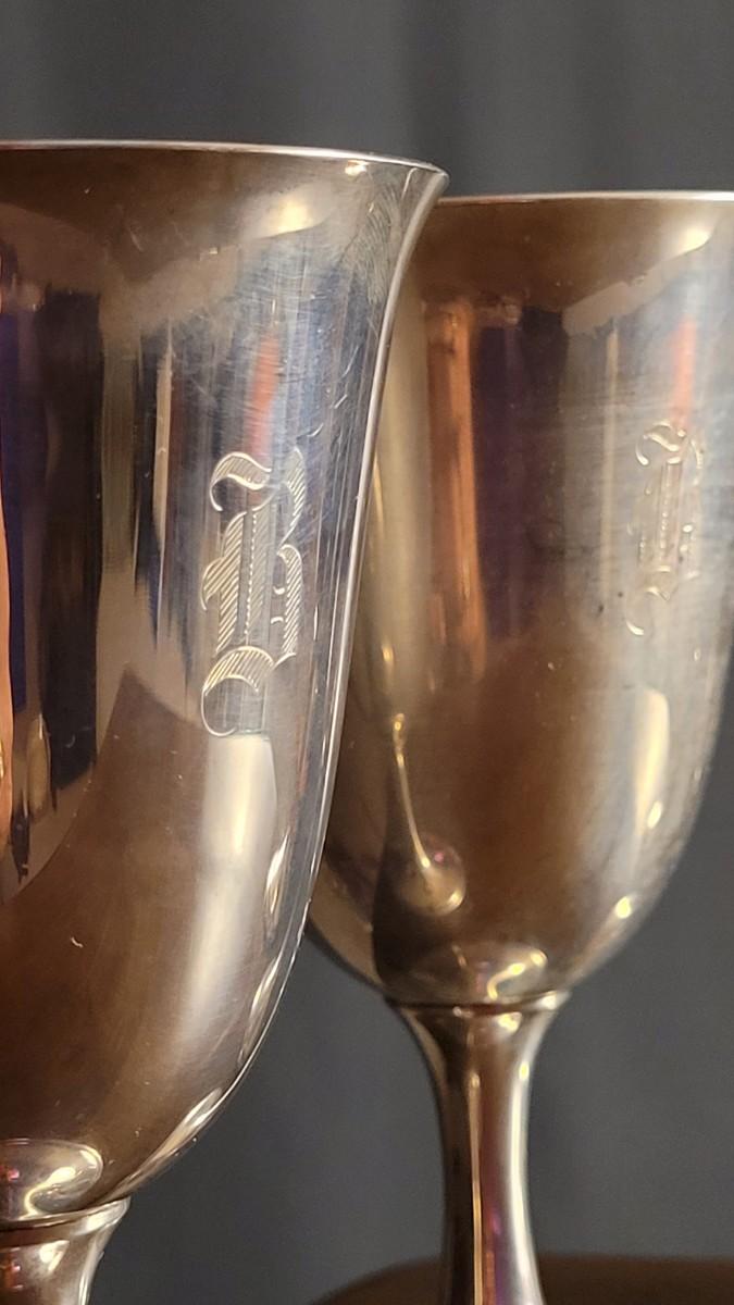 This lot features (4) Fancy Monogrammed "B" Serving Goblets. Each is in fine condition for age and use polished. Each is 6.5" x 3.5". Each weighs approximately 148 grams for a total of around 590 grams for all 4.
