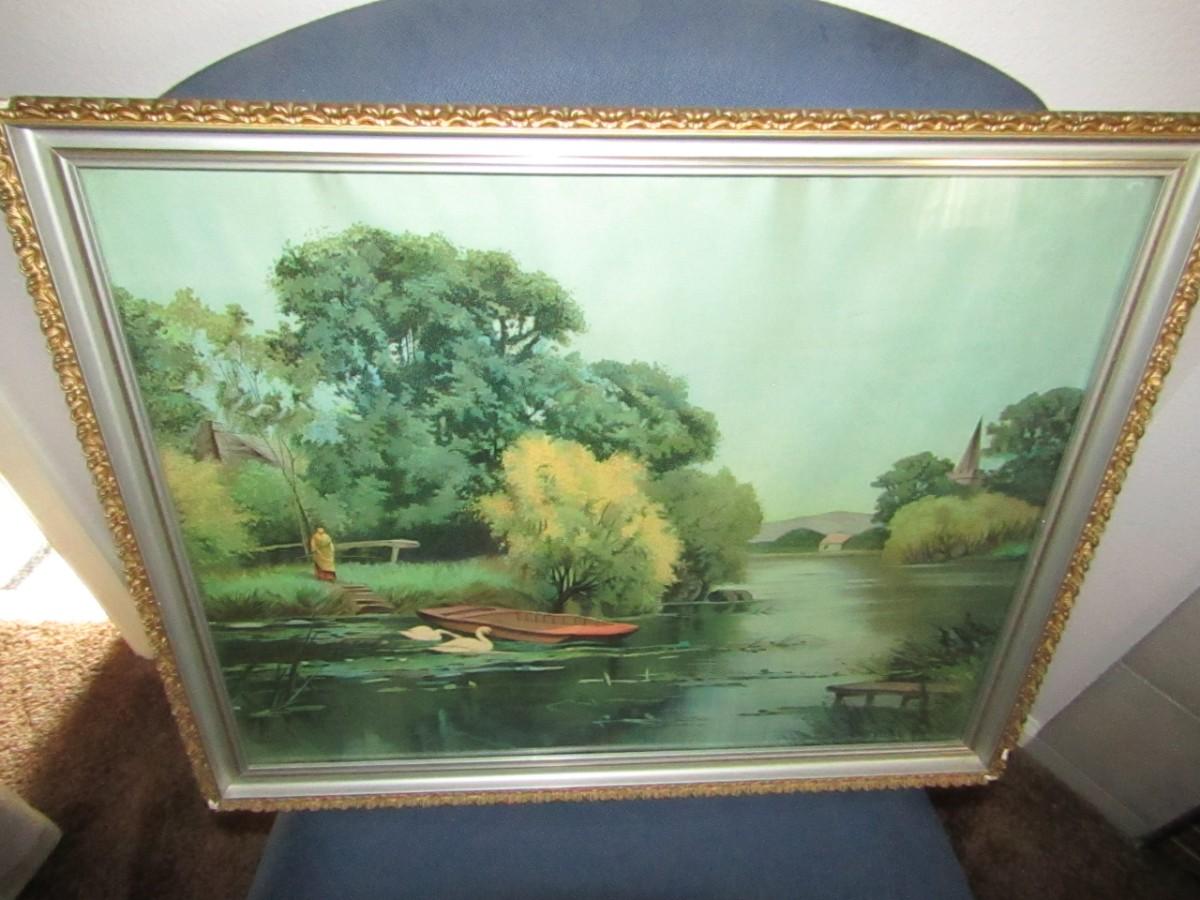 THE PICTURE IS WAVY BUT HAS NO WATER DAMAGE, THE FRAME HAS CONSIDERABLE DAMAGE 22" X 18"