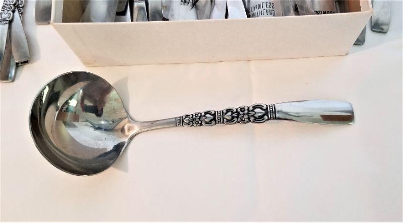There are a total of 71 pieces here - all the basics, including Iced Tea spoons, cocktail forks, cream soups, serving pieces. Northland Stainless - from the 1970's. These are in the "Rebecca" pattern. Many pieces still in sleeves.