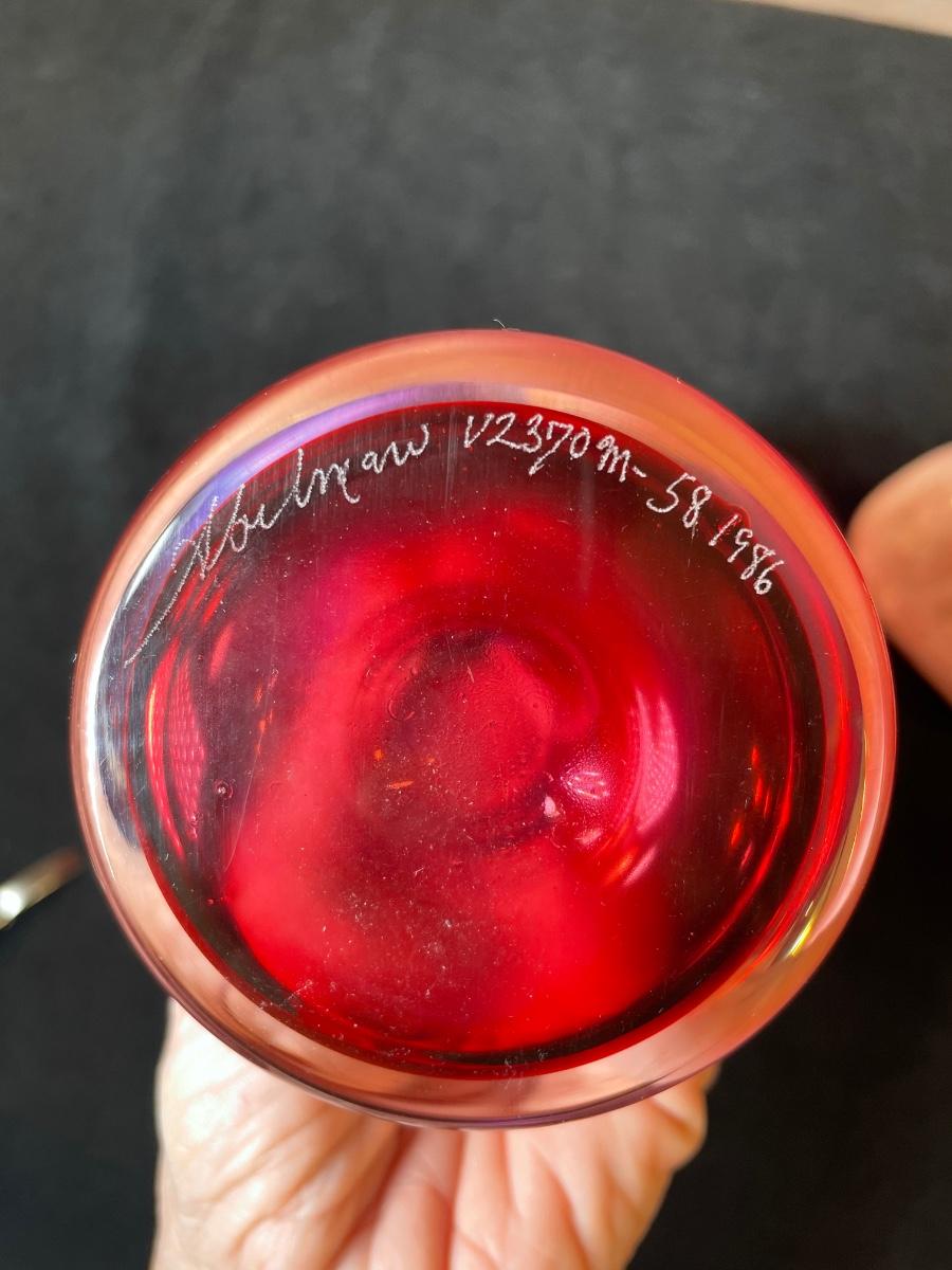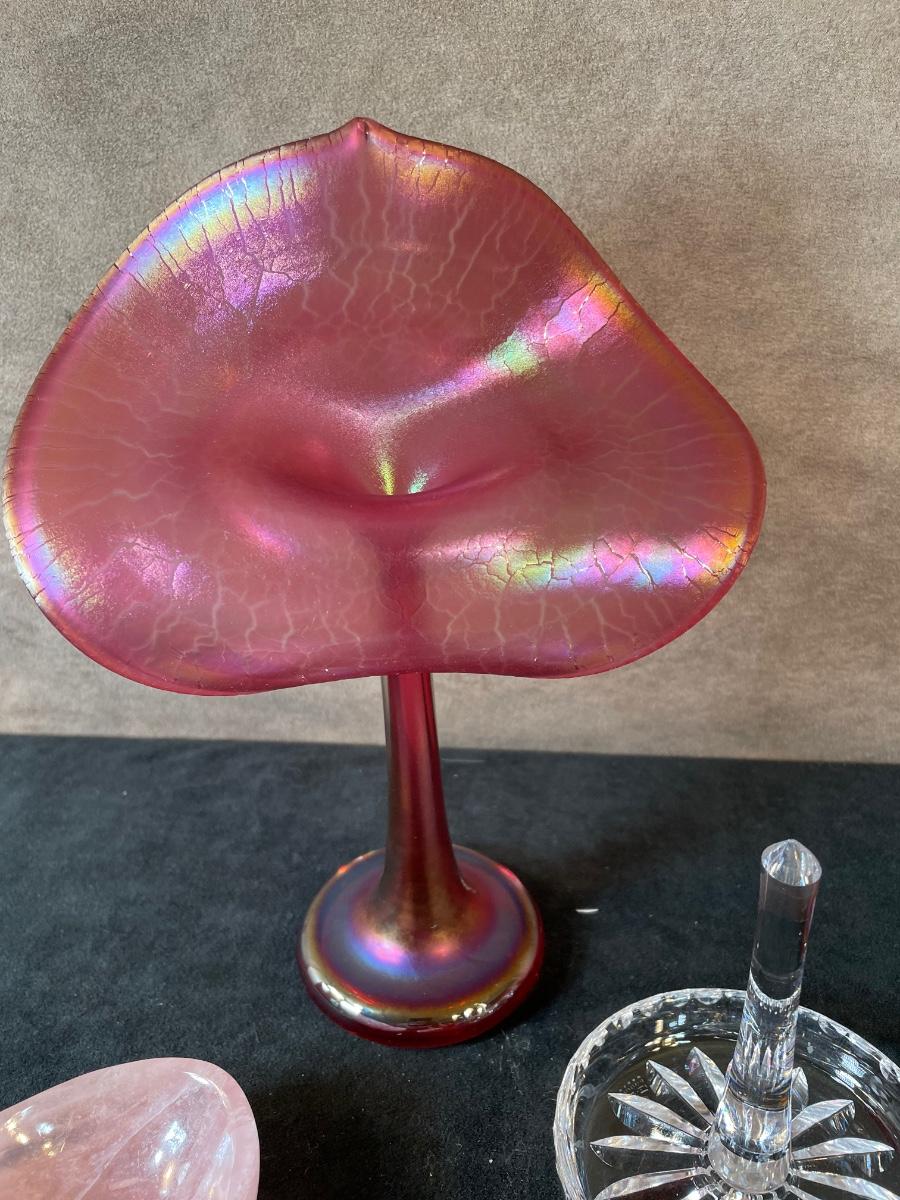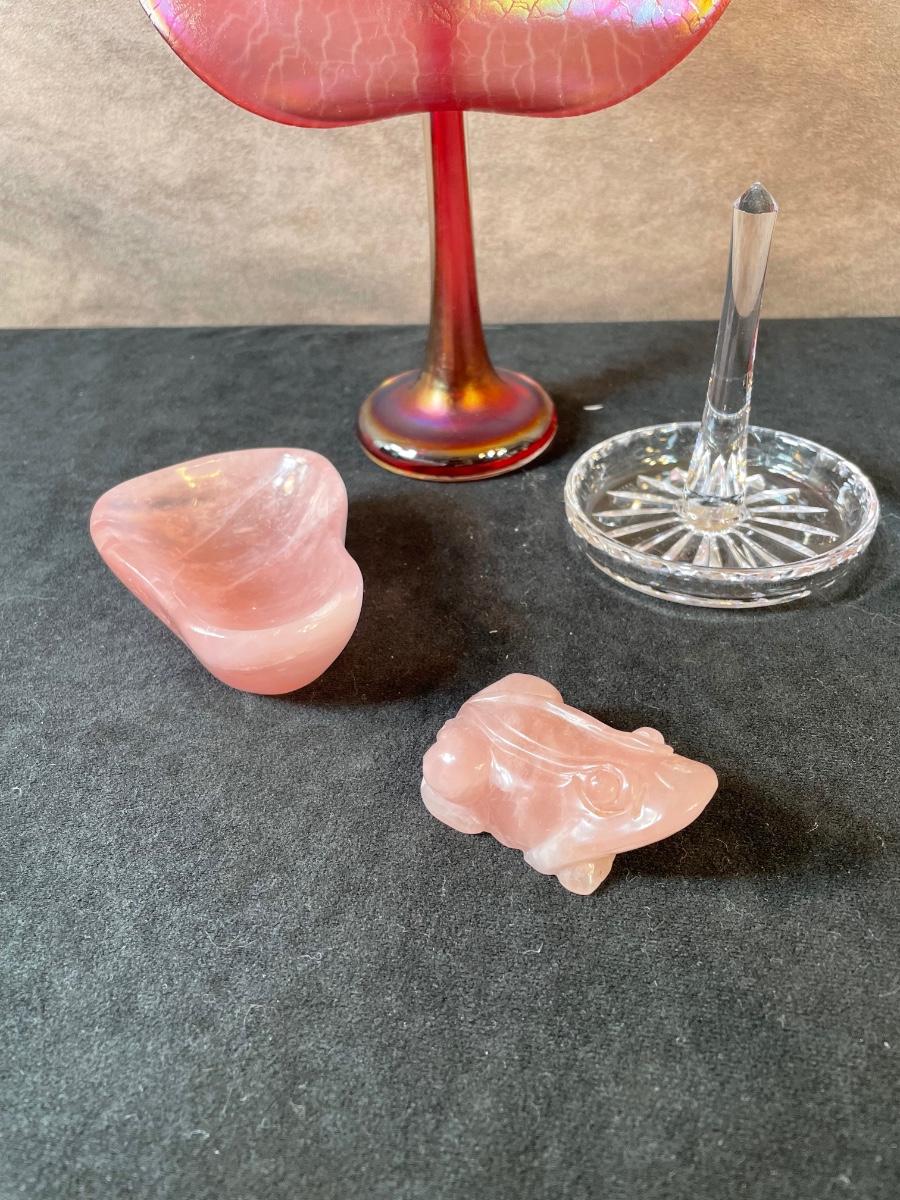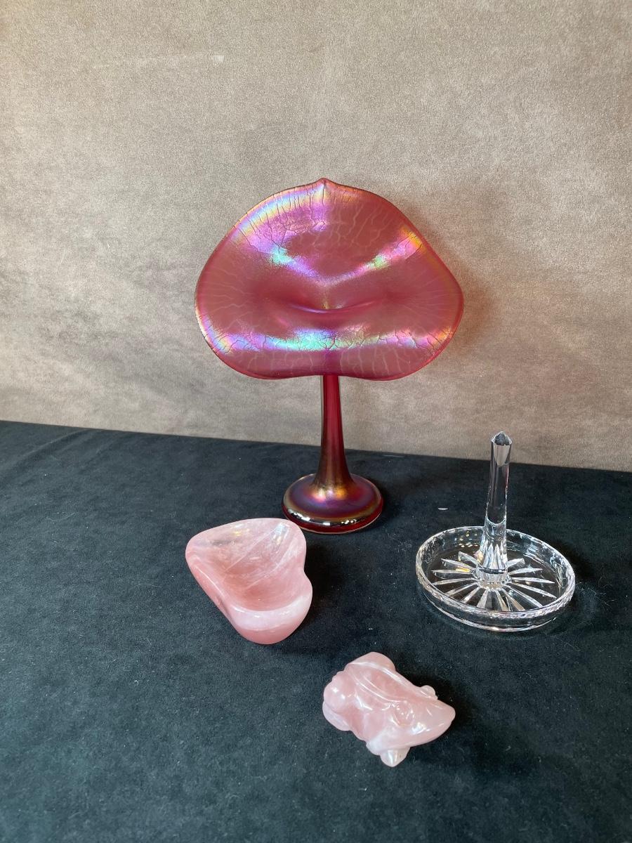 Iridescent blown glass "Jack in the Pulpit" vase (9.5" tall), crystal ring holder and rose quartz pin dish and carved frog figurine