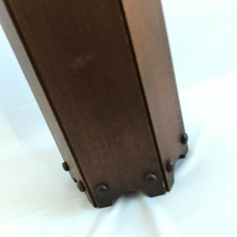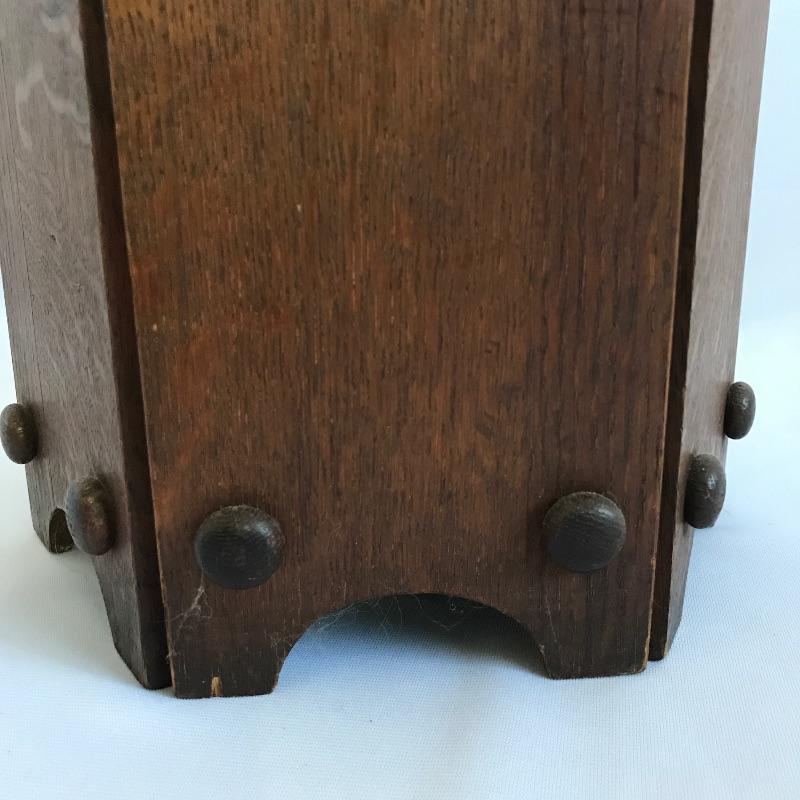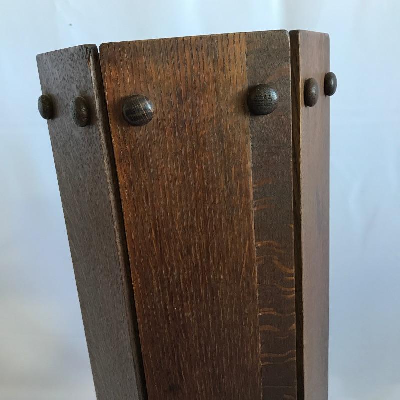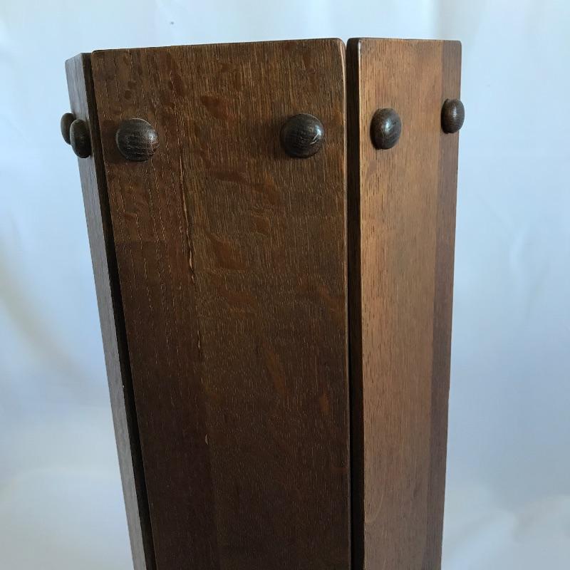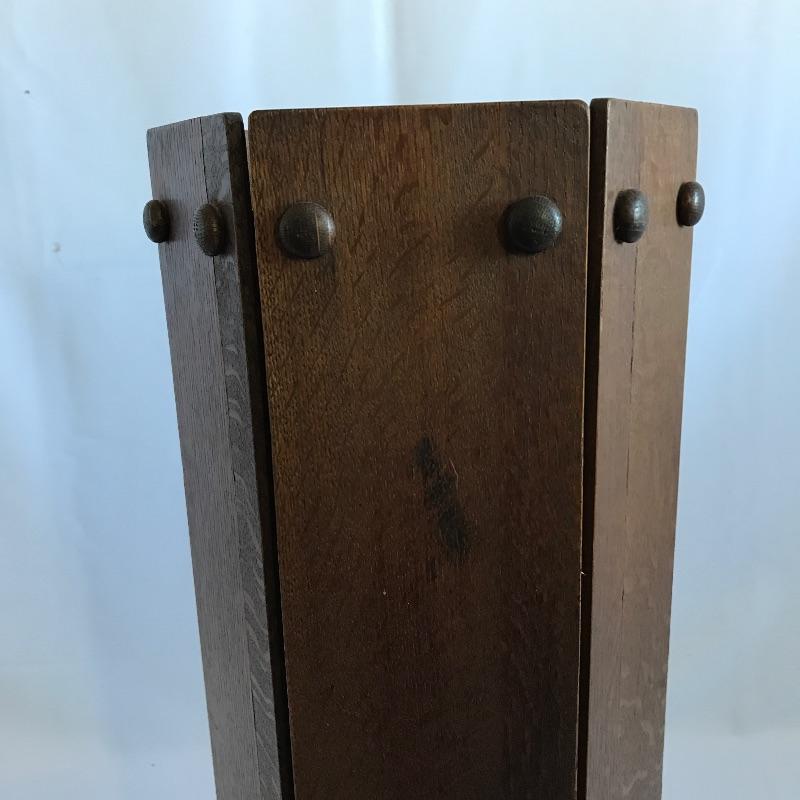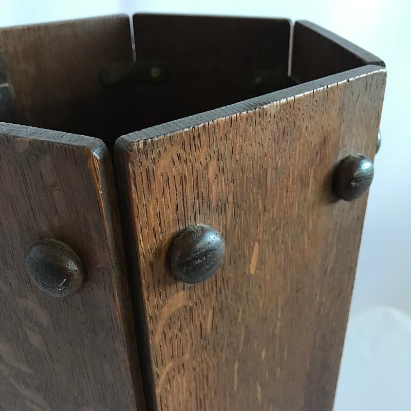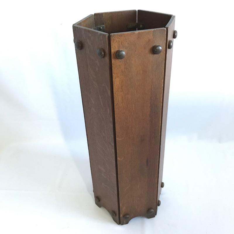 This Arts & Crafts style wooden umbrella stand is perfect for your entryway. Some attention to details includes wooden pegs and a removable metal insert in the bottom to catch water. Brilliant! See photos for some normal wear on wood.