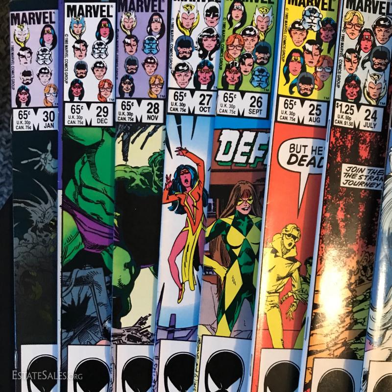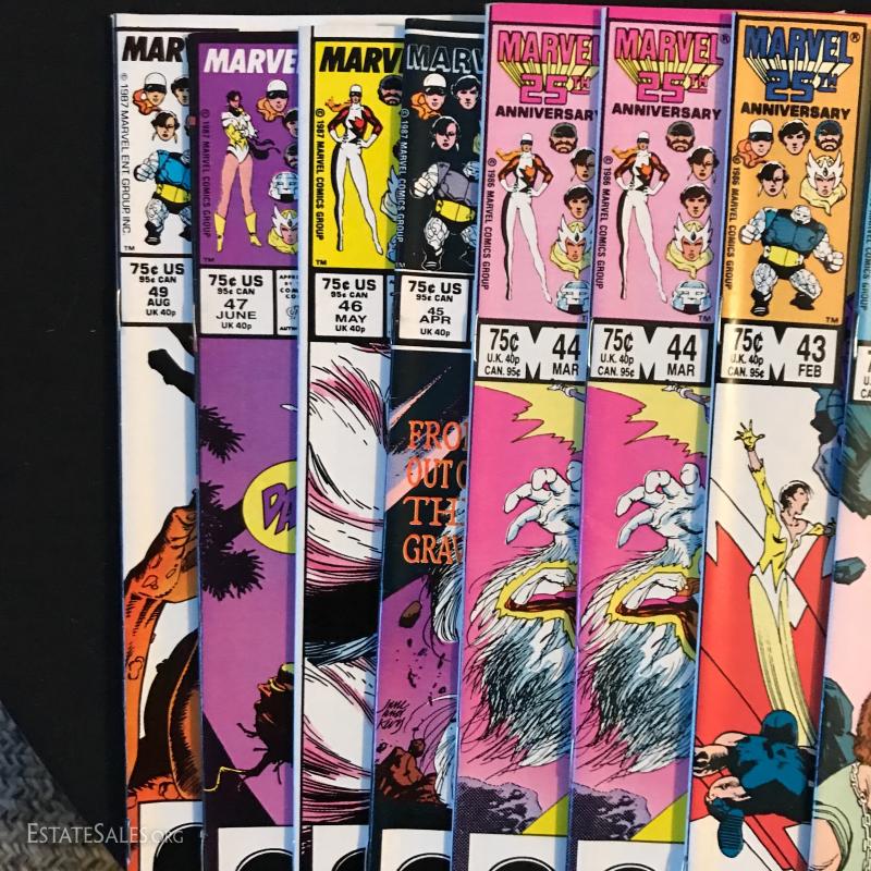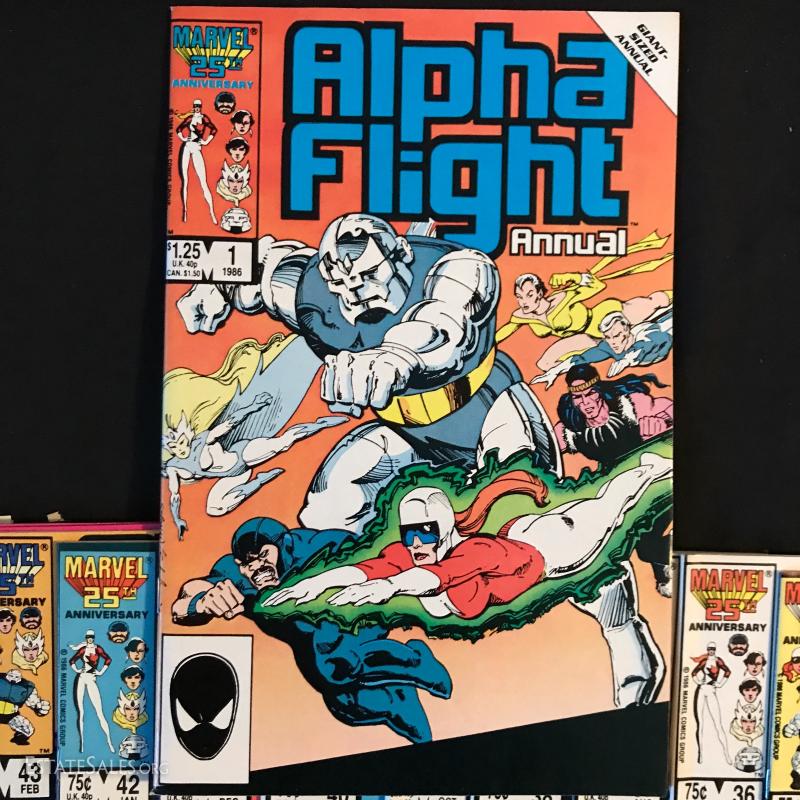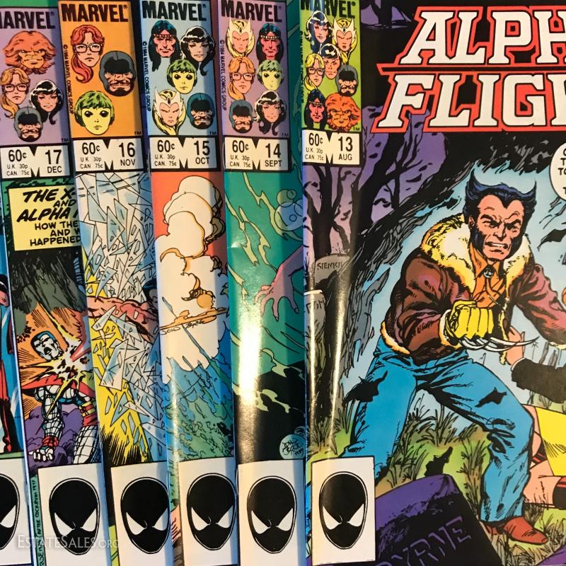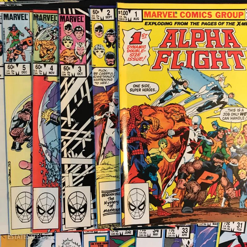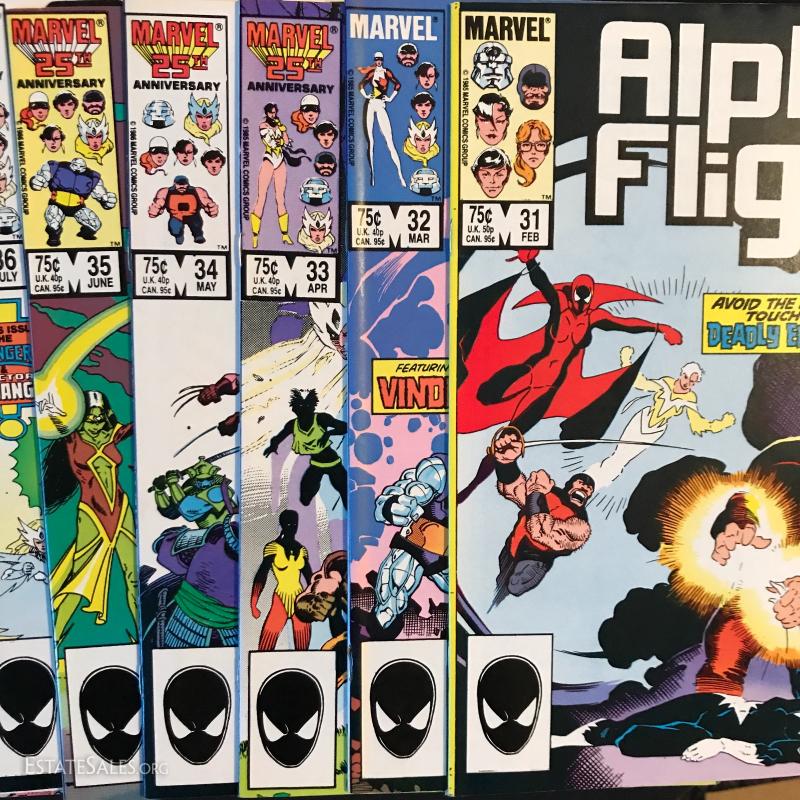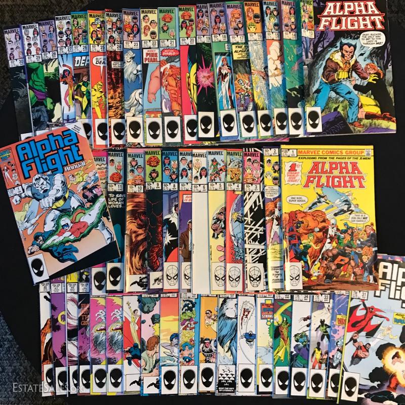 "Alpha Flight" by Marvel Comics Group. 50 issues total. Includes Vol 1, No 1, August 1983 to No. 49, August 1987. Does NOT include No. 48. There are two issues of No. 44. Also included is the 1986 Annual. Shipping in one Priority Box or local pick up in Asheville, NC.