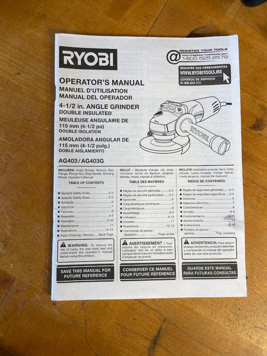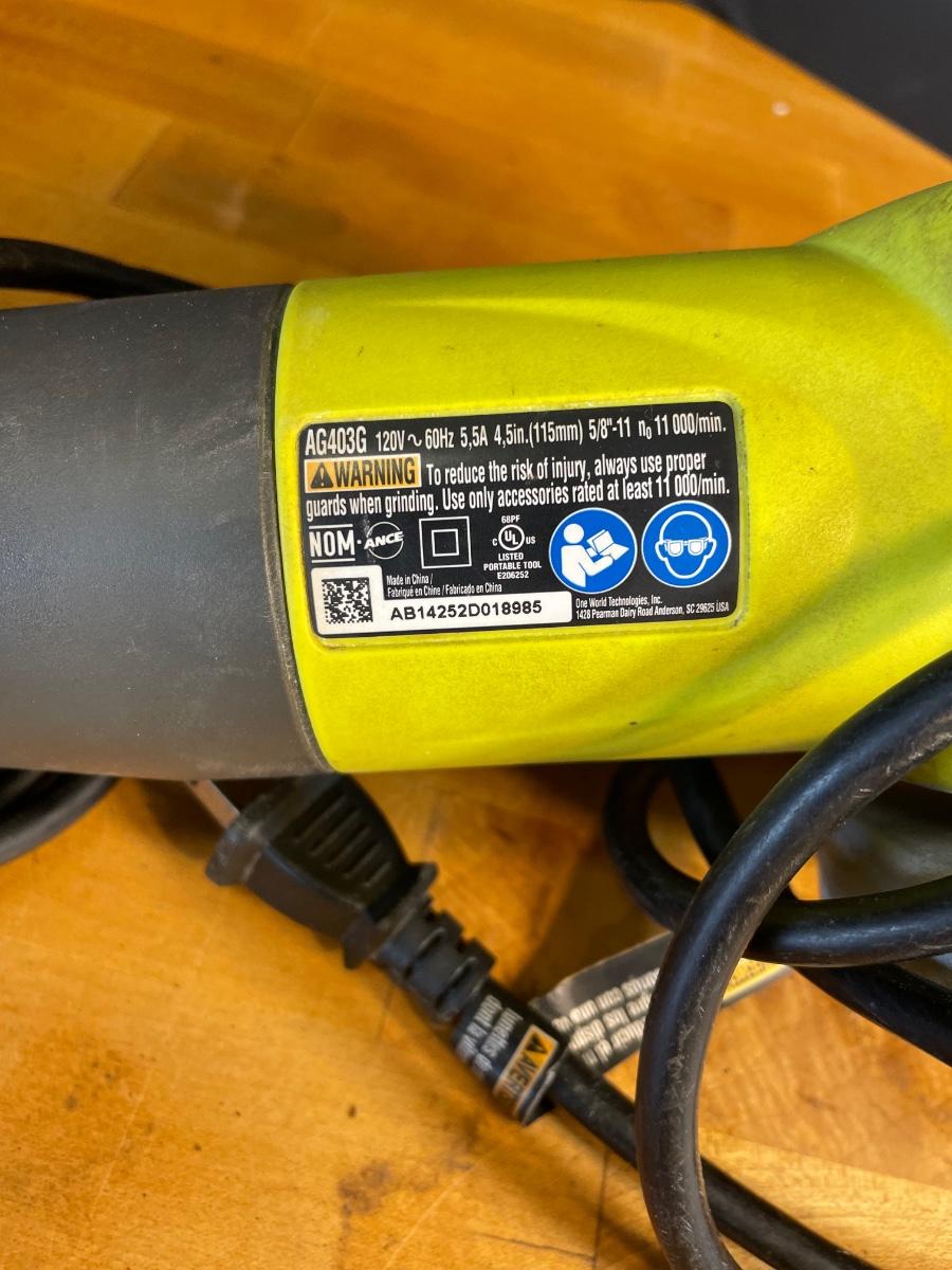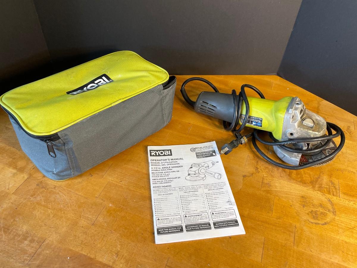 Ryobi. 4-1/2" Angle Grinder. 5.5 amp. Like new. Includes case and owner's manual