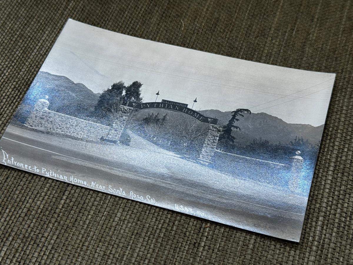 LOT 4 - Santa Rosa RPPC Postcard Pythian Home Entrance. The actual color of the photo post card is more sepia than what appears here. No amount of editing could match the real color. My apologies. Silver Gelatin Photo - Real Picture Postcard. Small indented mark which can be seen in photo 3.