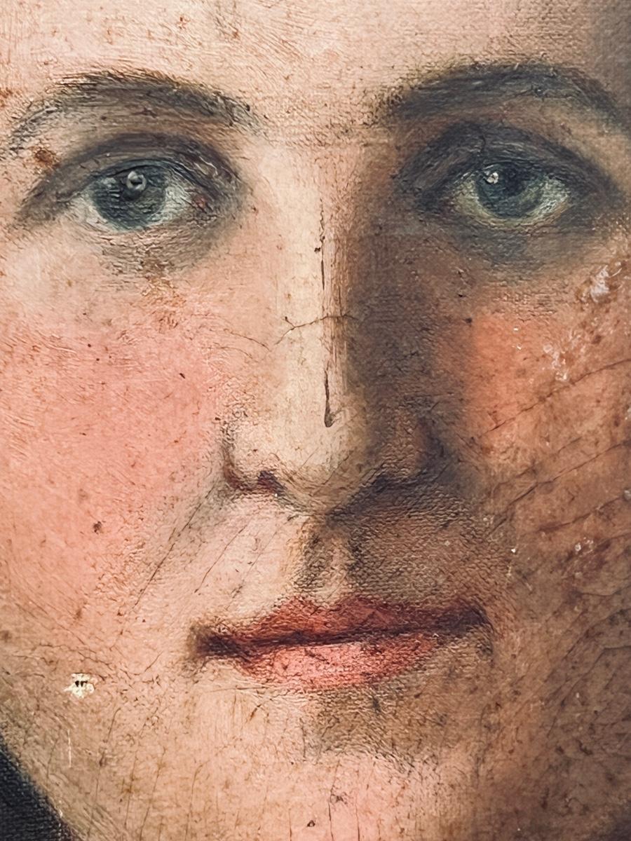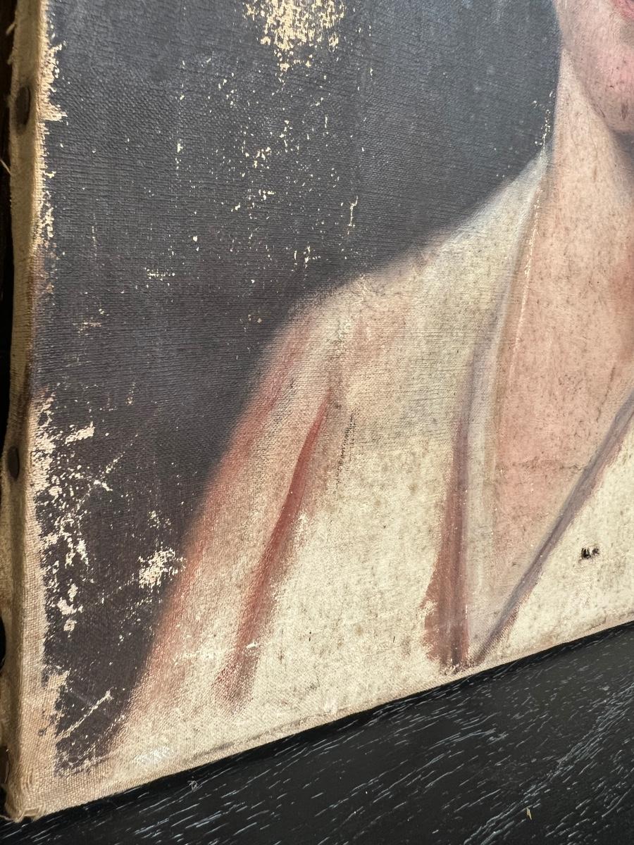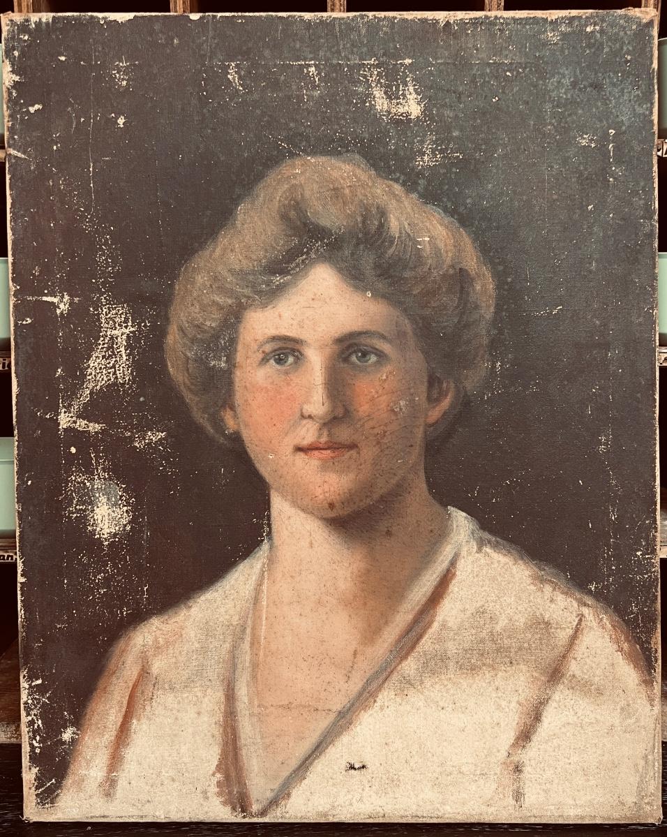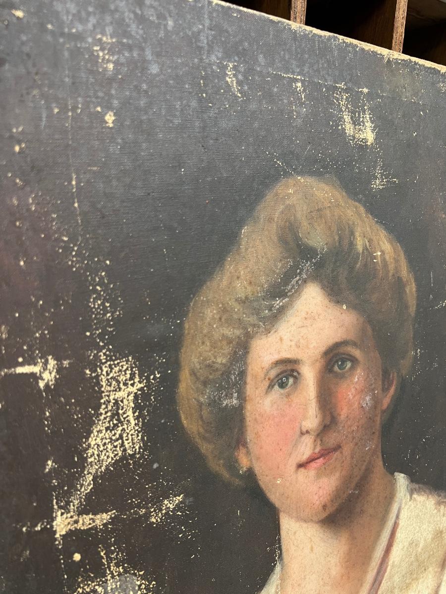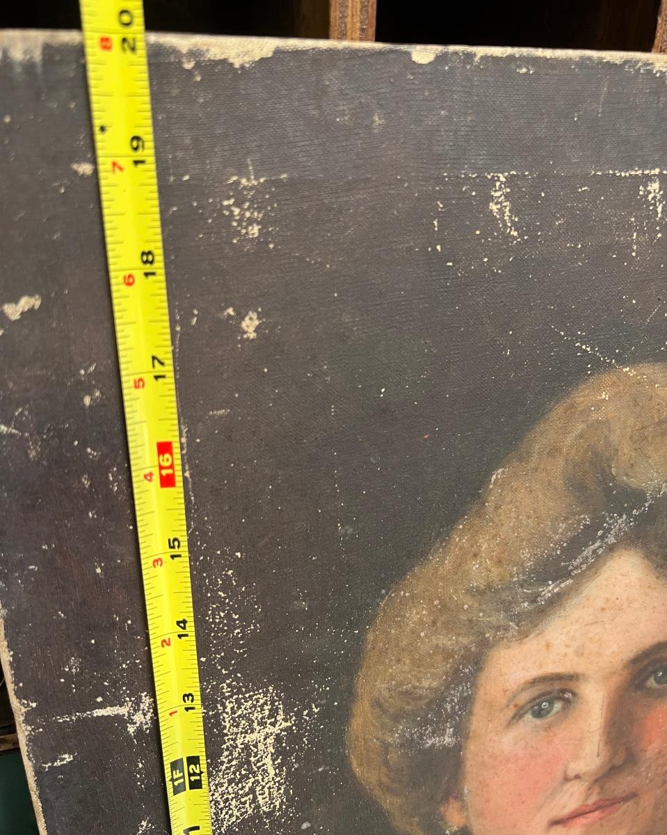 LOT 4 - Antique Painting featuring a Portrait of a Woman. Unsigned. This Antique Painting is being sold in AS IN Condition. It measures 20 inches by 16 inches. Lots of patina and wear and looking at each photograph will best describe this.